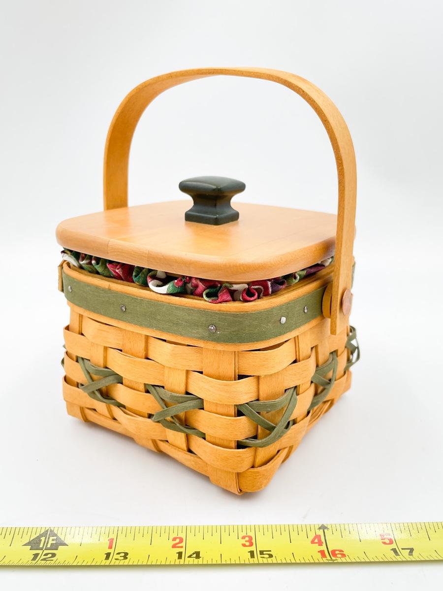 In good condition, includes fabric and plastic liner. Measures approx 5” square x 3.5” tall (not including handle).