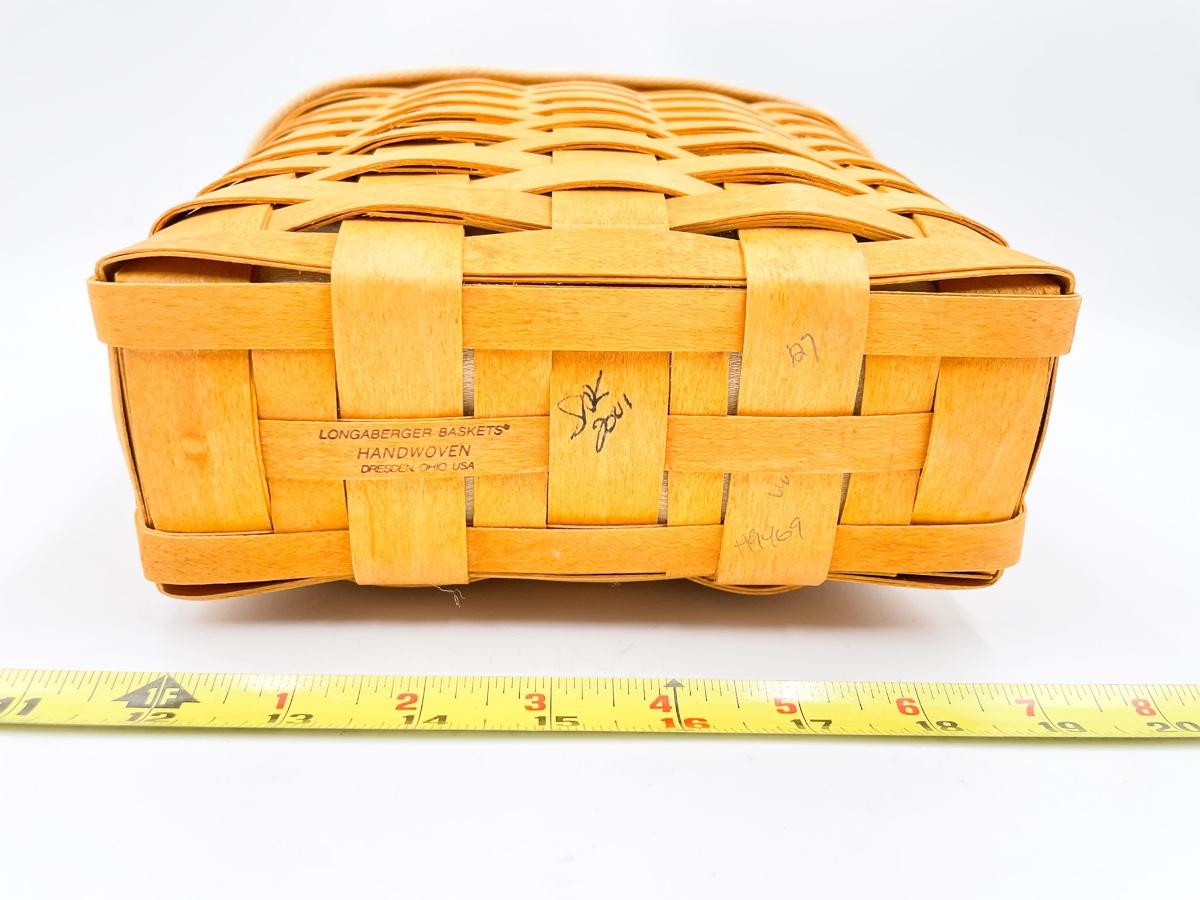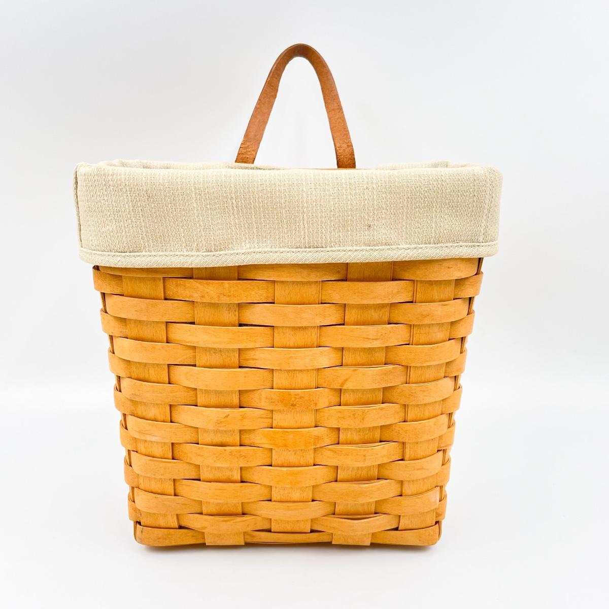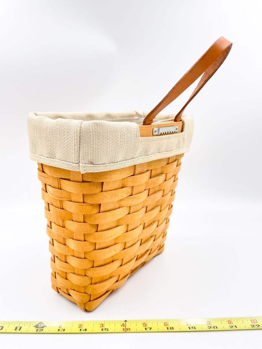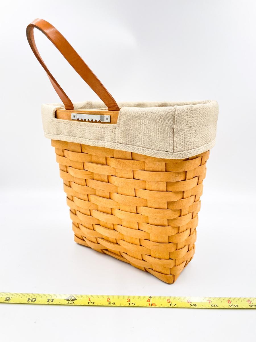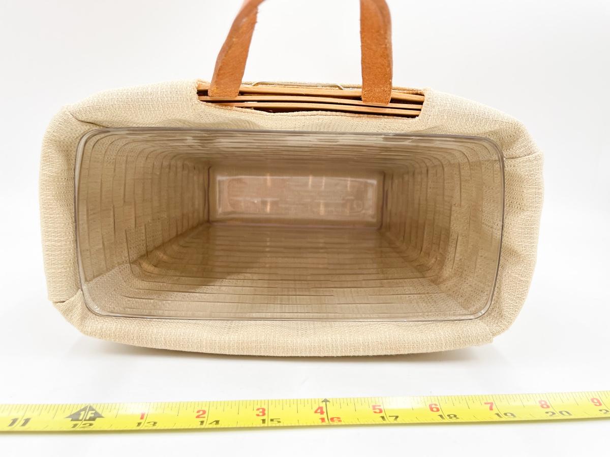 In good condition, includes fabric and plastic liner. Measures approx 6” x 10” x 9.5” tall.