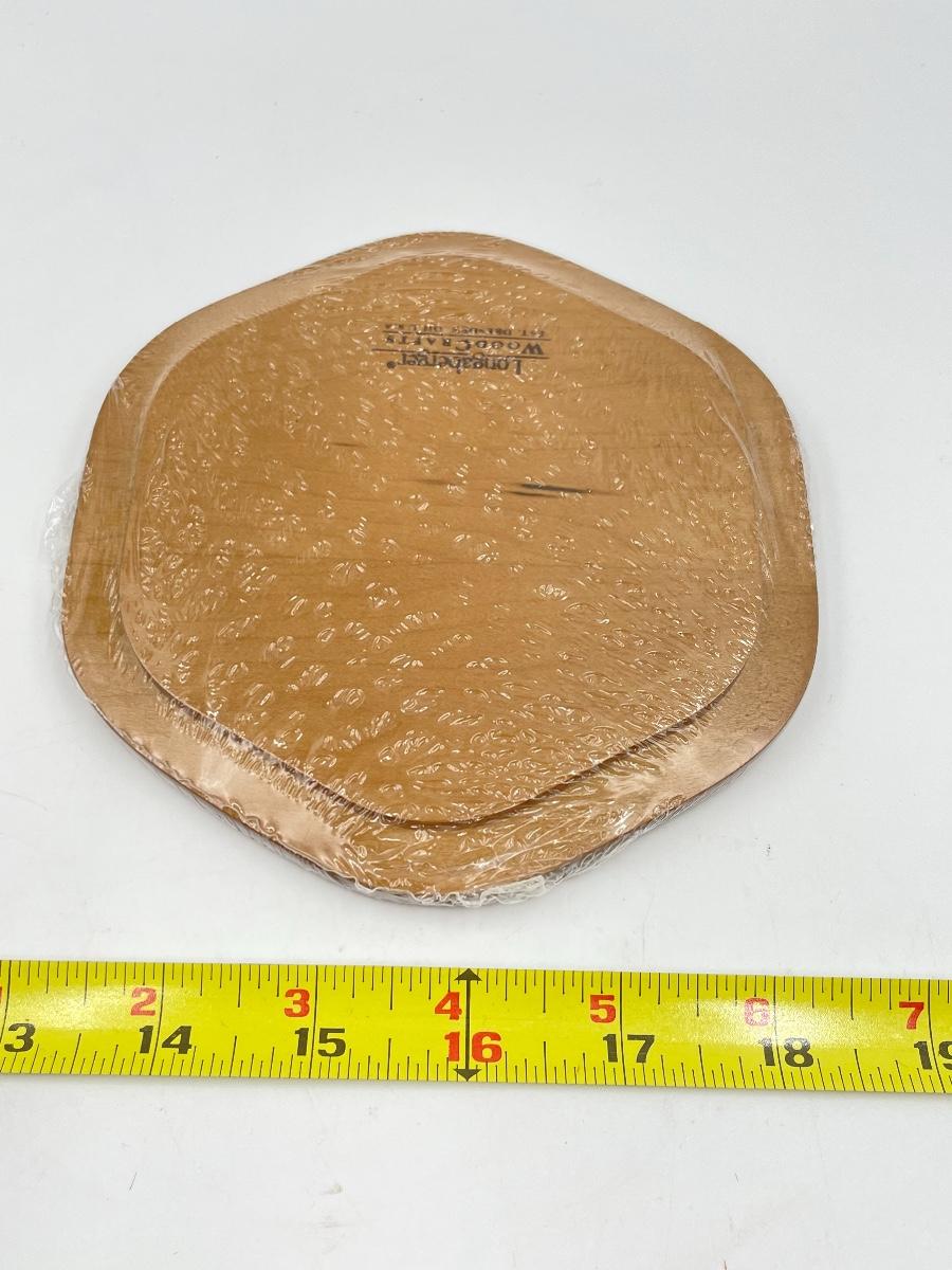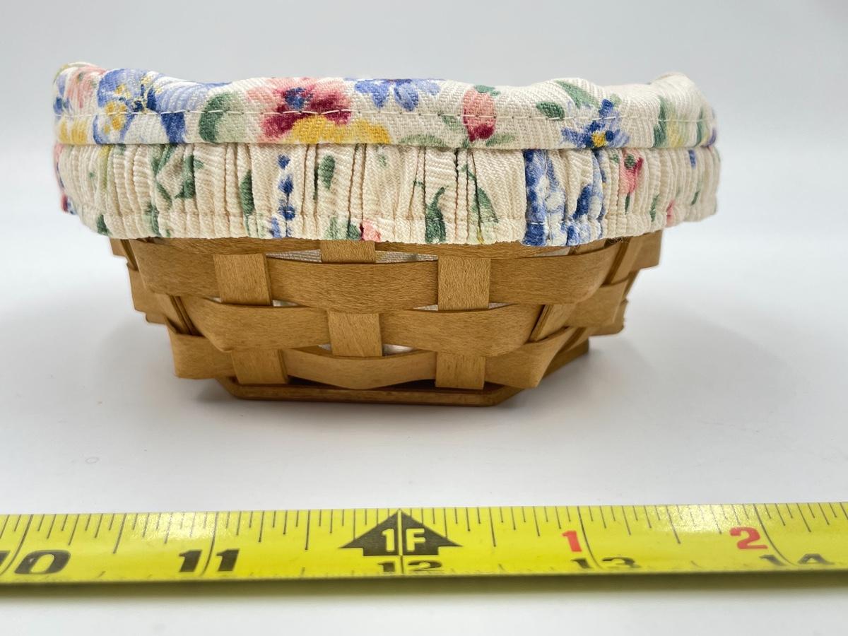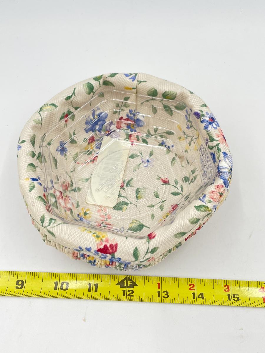 In good condition, includes fabric and plastic liner. Lid is still wrapped in plastic. Measures approx 5.5” in diameter and 2.5” tall.