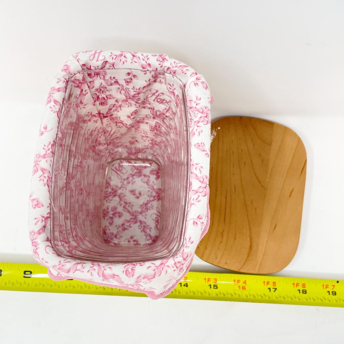 In good condition, includes fabric and plastic liner. Measures approx 6” x 4” x 6” tall.