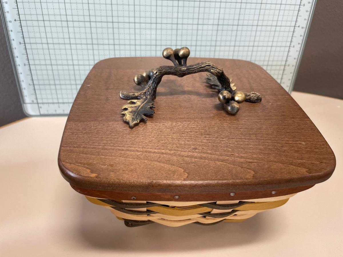 Small Longaberger basket with hard lid and leaf design handle