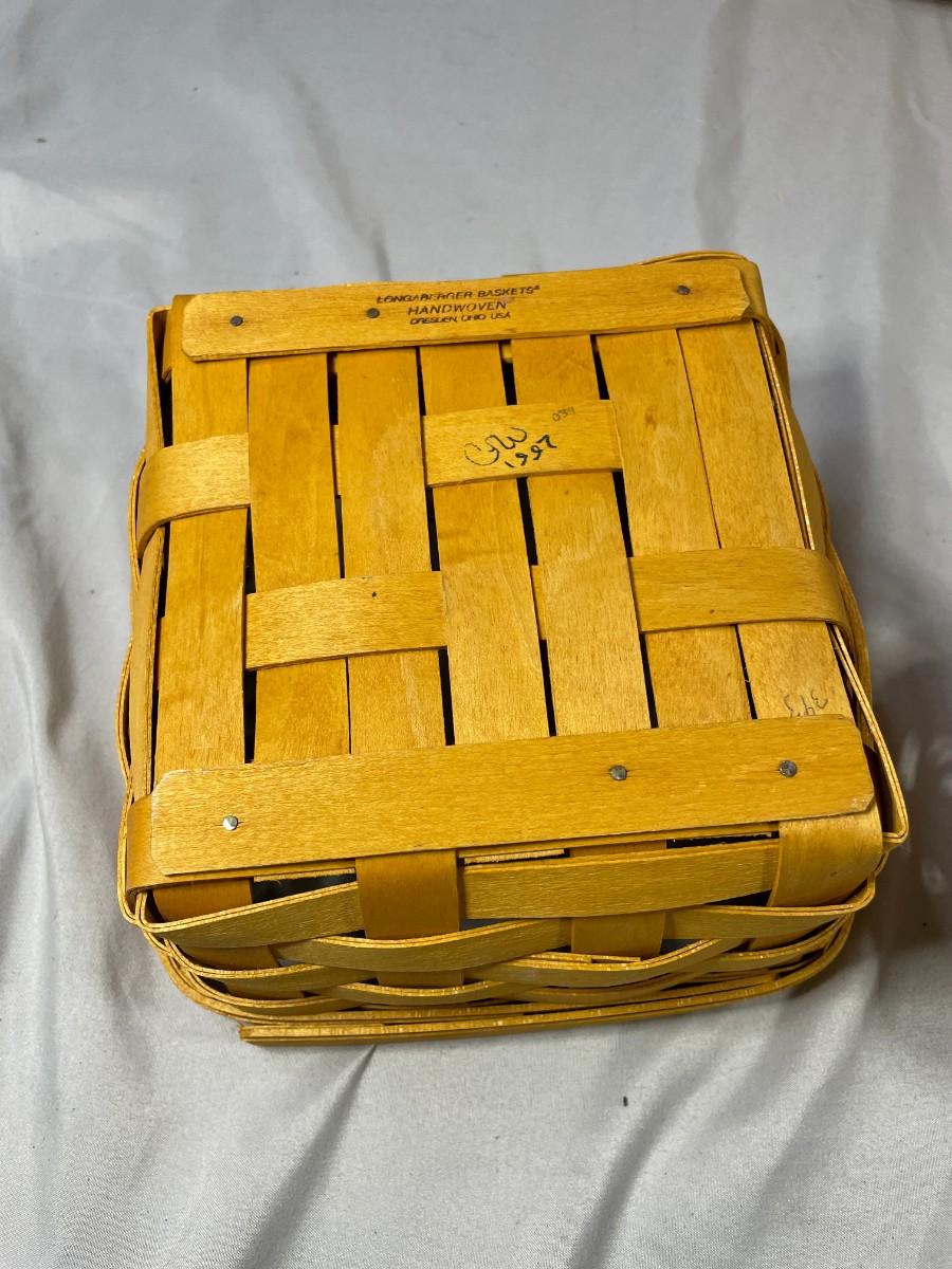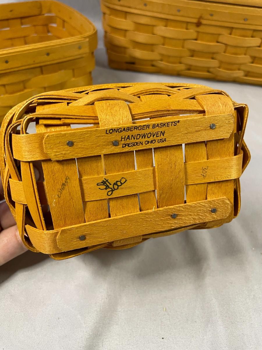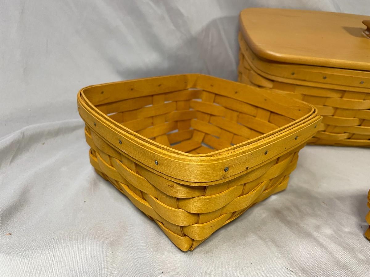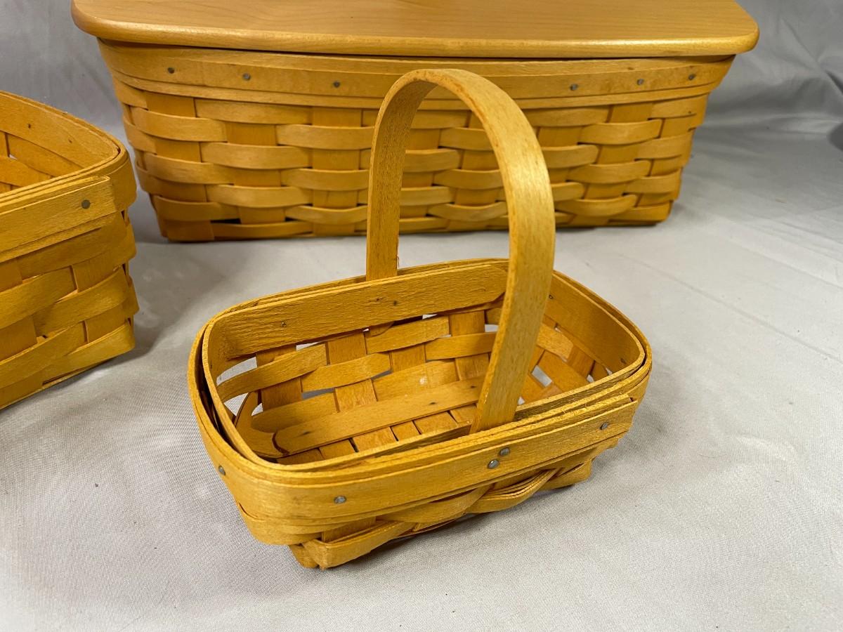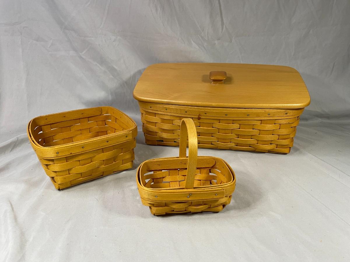 The small handled basket is about 6" x 4", the open basket is about 7.5" squared, and the large basket with a solid wood lid is about 14.5" x 8". All are very clean and in excellent condition.