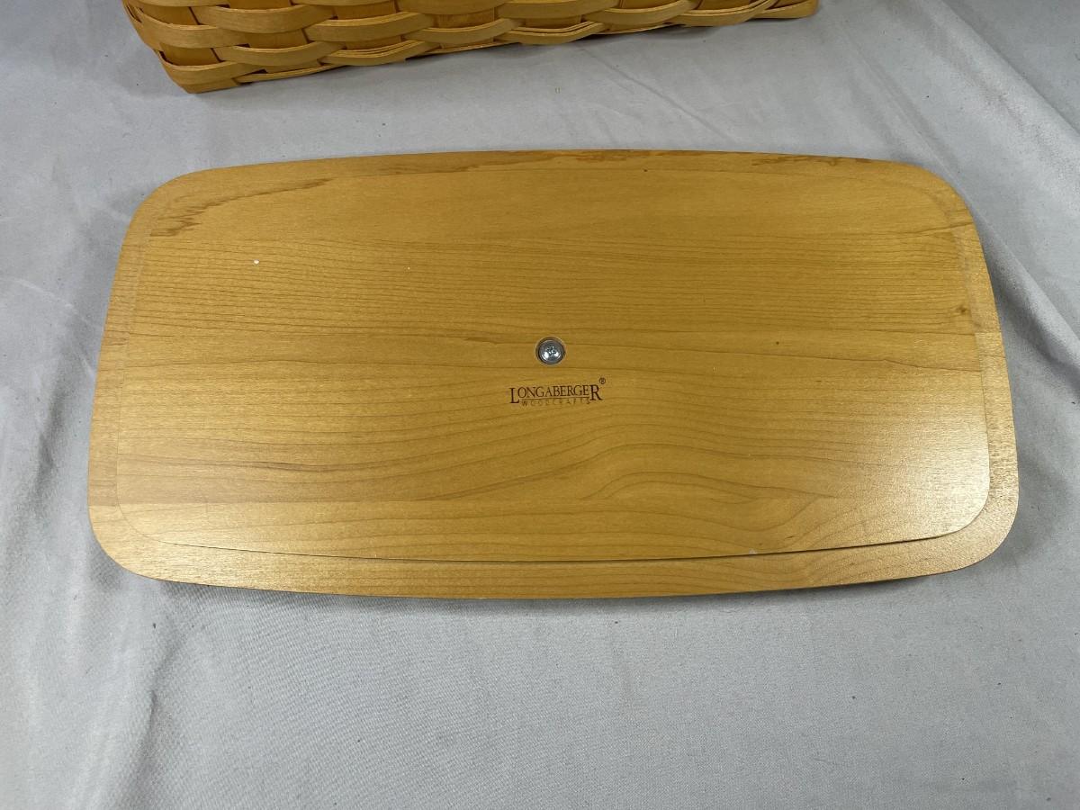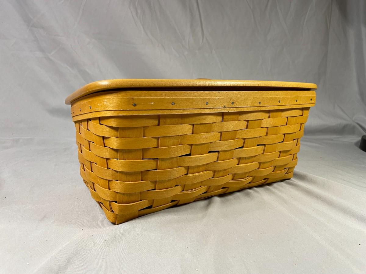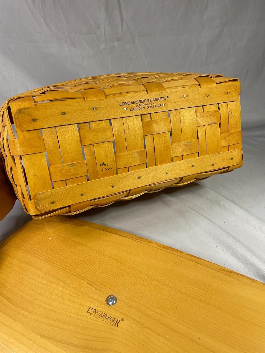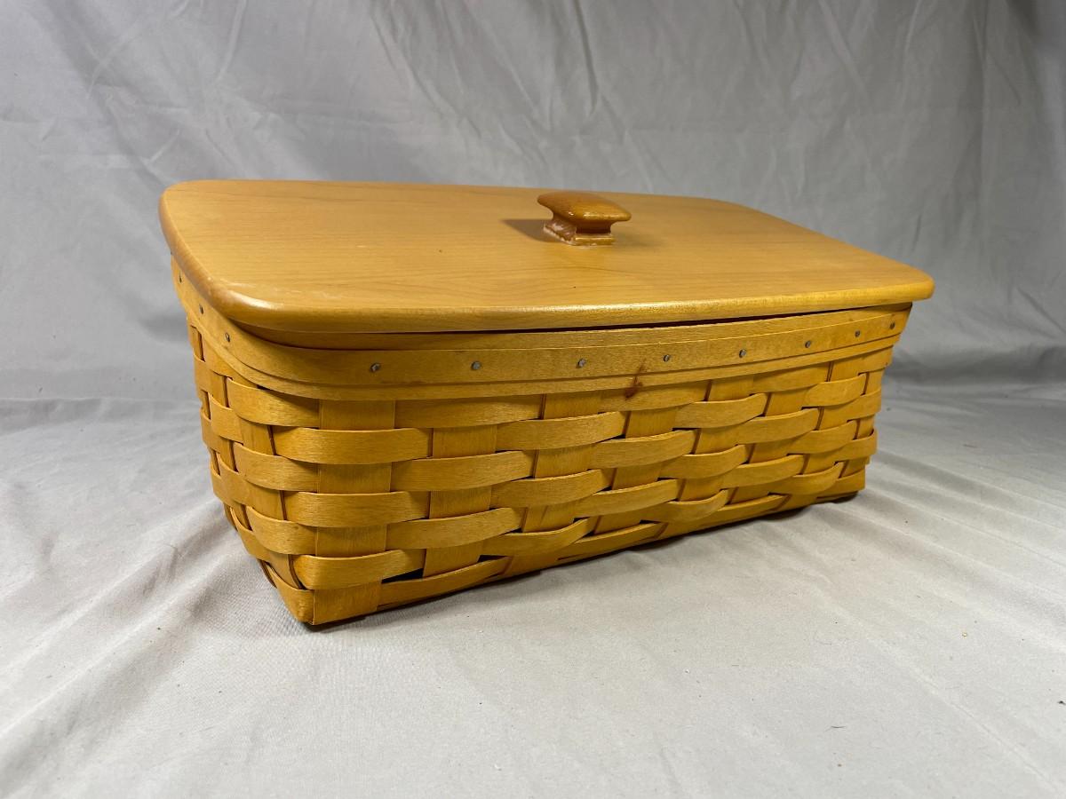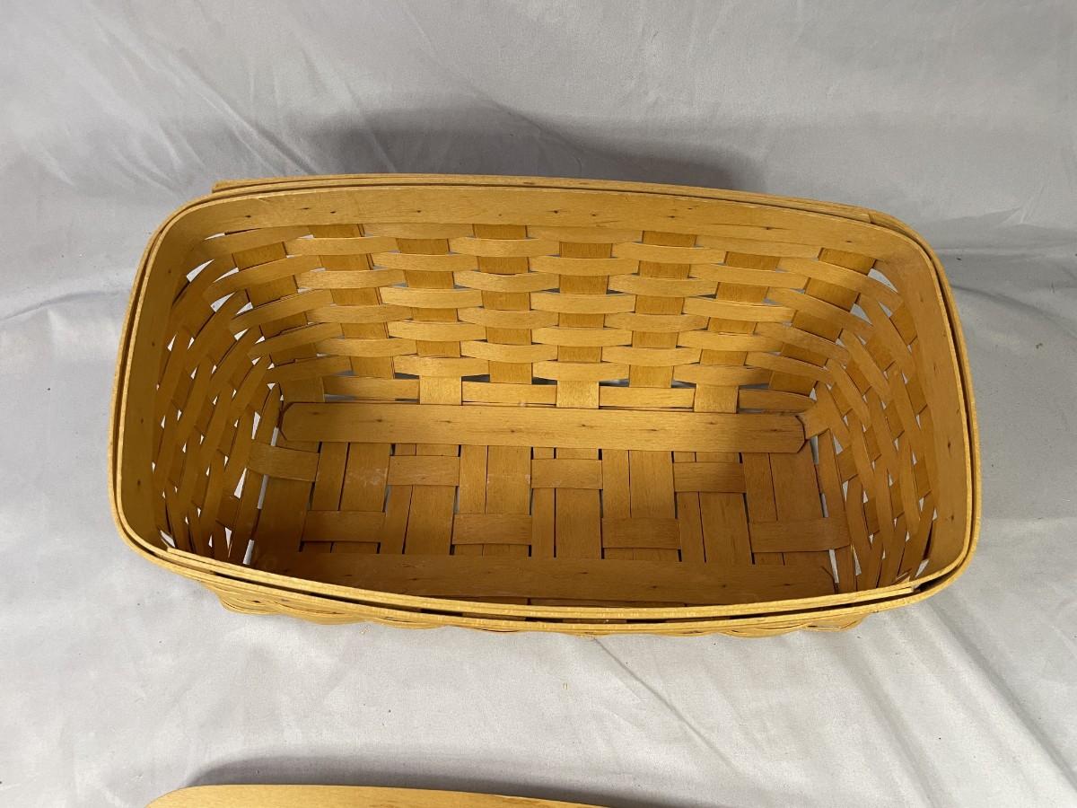 The small handled basket is about 6" x 4", the open basket is about 7.5" squared, and the large basket with a solid wood lid is about 14.5" x 8". All are very clean and in excellent condition.