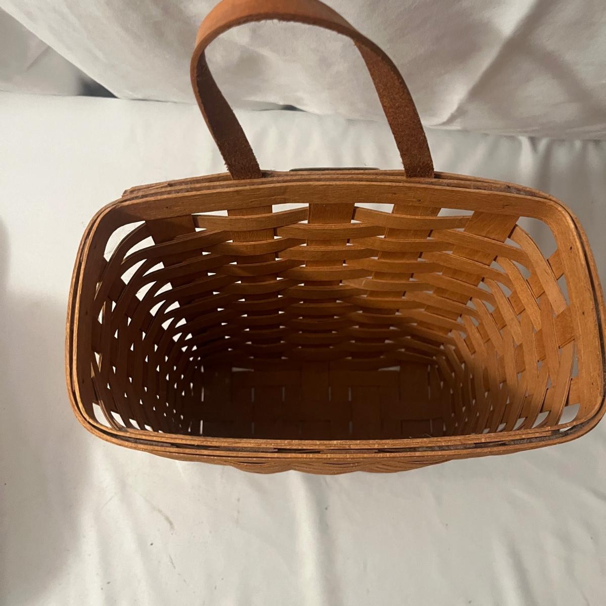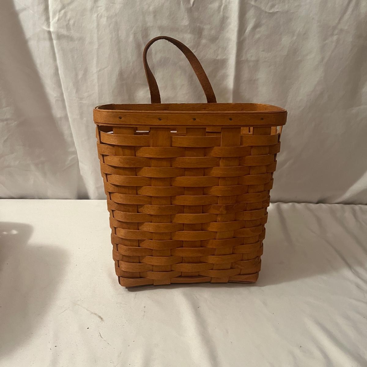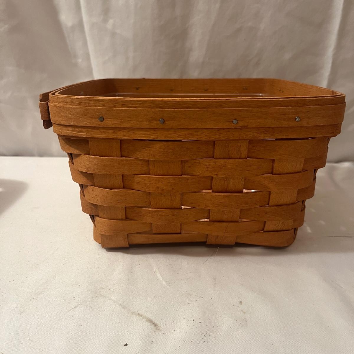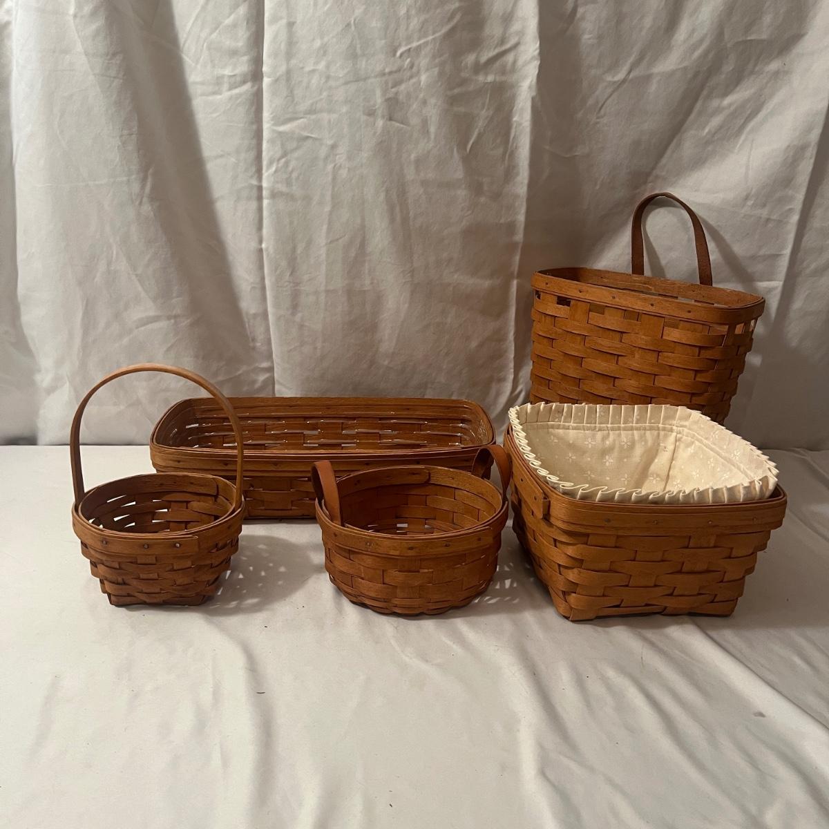 Lot includes five Longaberger hand woven baskets in a variety of sizes and shapes. Tallest basket measures 10” x 6” x 13”H including handle.