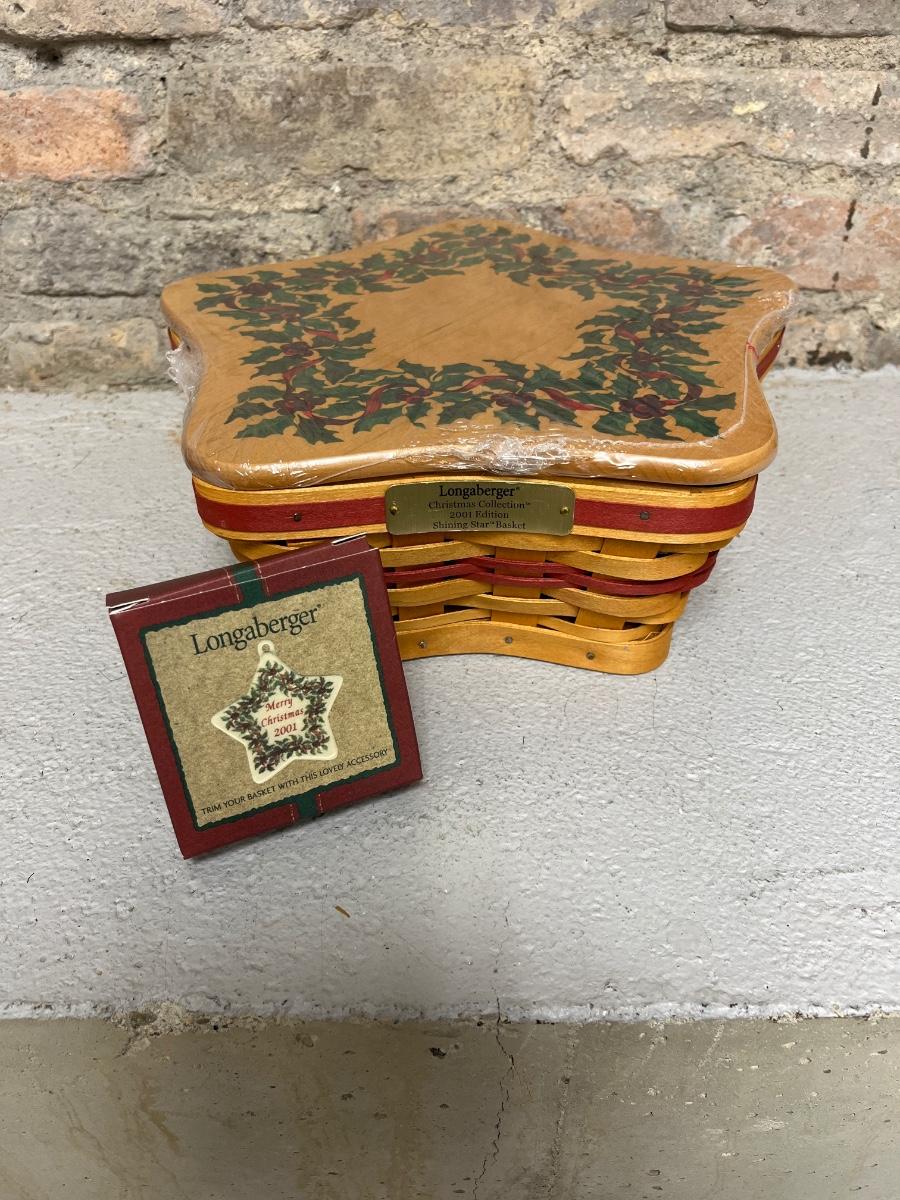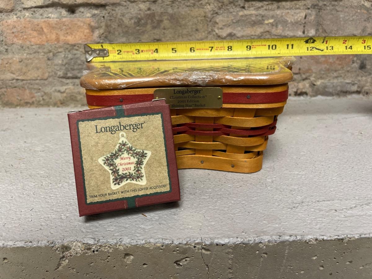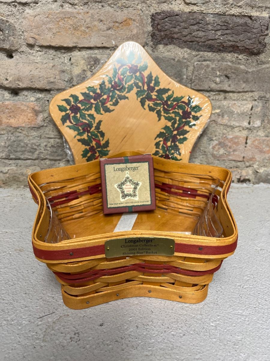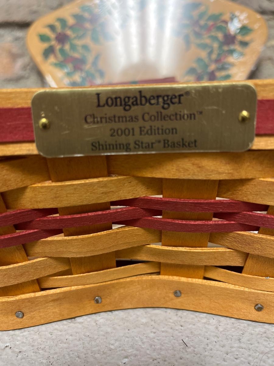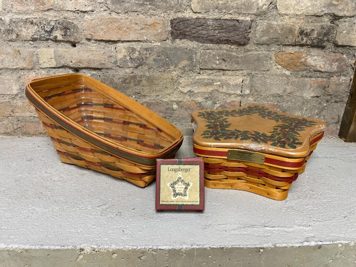 2001 Shining Star basket with charm, protector and lid and 1997 holiday sleigh basket with protector