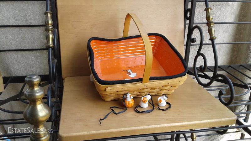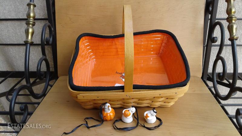 This adorable Halloween Carry-Along Basket comes with an orange/black "boo" liner, protector and three ghostly tie-ons. Sold new for $96. Signed. Tie-ons come with original box. Never used! Signed.