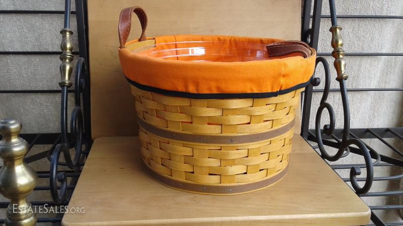 Like new! Longaberger medium Bushel Basket with two liners: Happy Halloween and Paprika, and one Protector. The basket measures approximately 12" diameter X 8" H. Comes with Happy Halloween Over-the-Edge bright orange with black trim and embroidered ghost ~Boo~ on bottom liner. Extra liner included. The basket has an open-weave bottom.