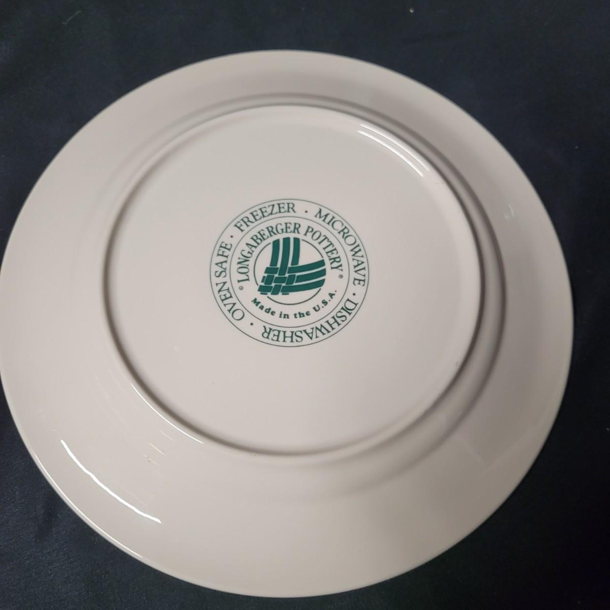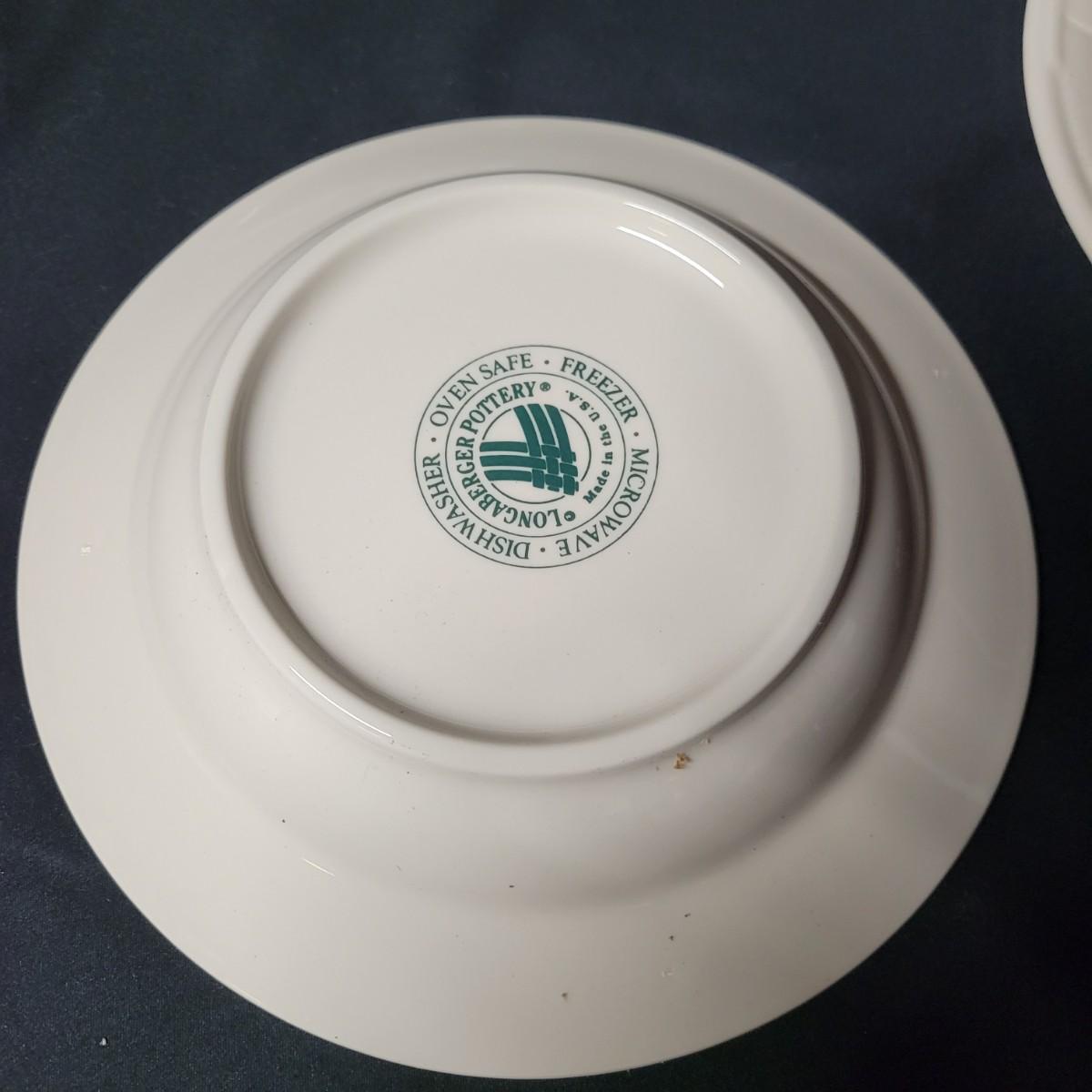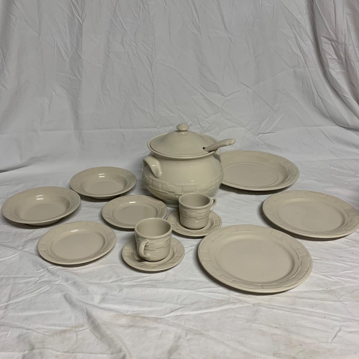 A collection of matching Longaberger Pottery place settings and soup tureen. There are two place settings that each consist of a bowl, dinner plate, salad plate, a saucer and a coffee cup. The soup tureen measures approximately 10"D x 9"H. Shipping available