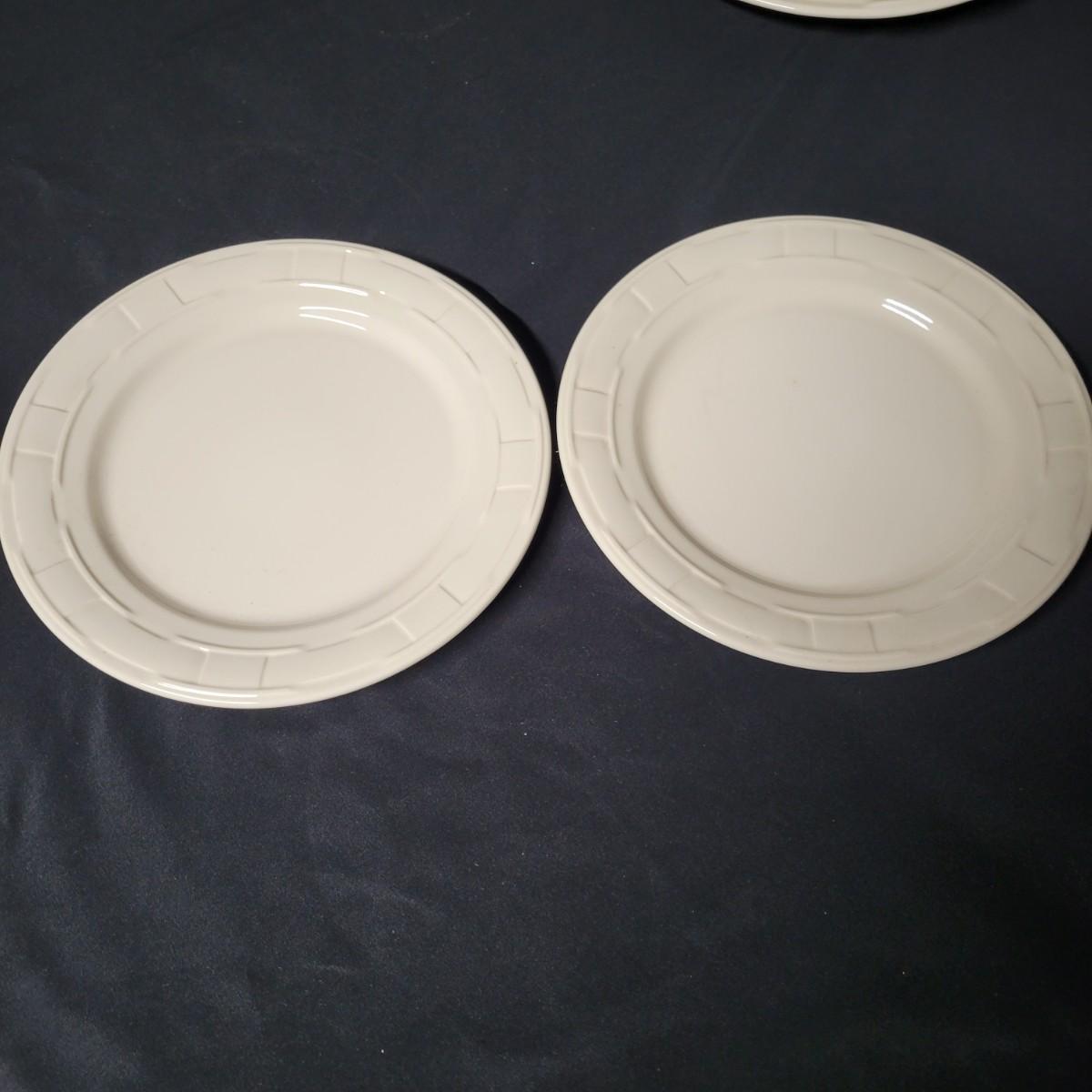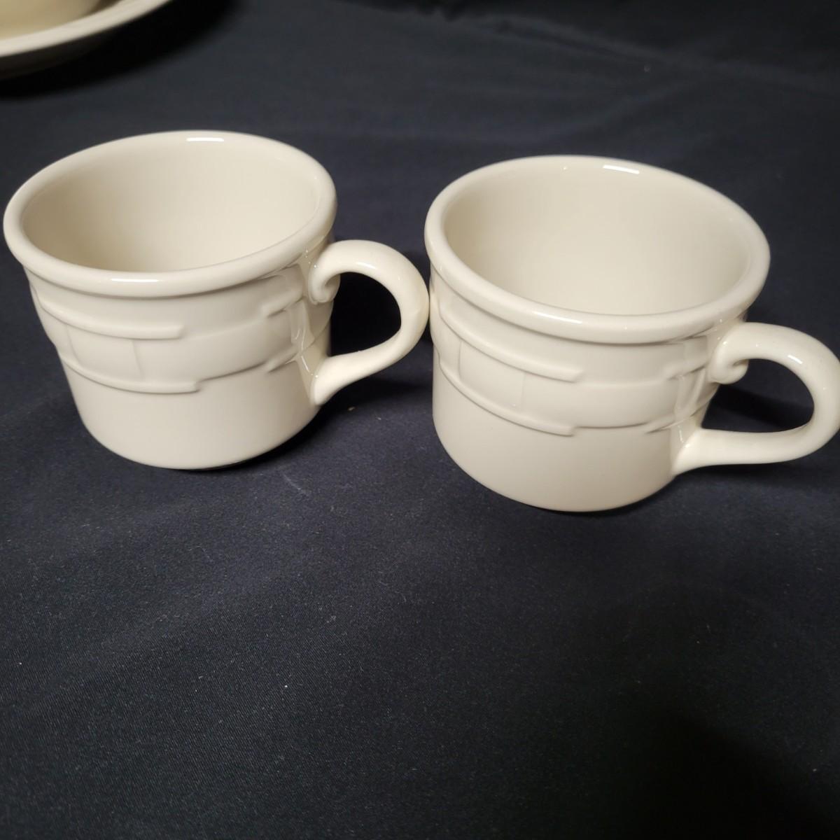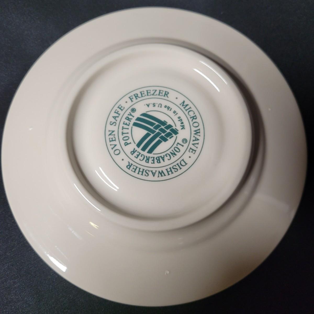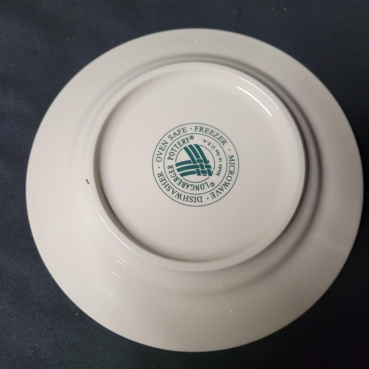 A collection of matching Longaberger Pottery place settings and soup tureen. There are two place settings that each consist of a bowl, dinner plate, salad plate, a saucer and a coffee cup. The soup tureen measures approximately 10"D x 9"H. Shipping available
