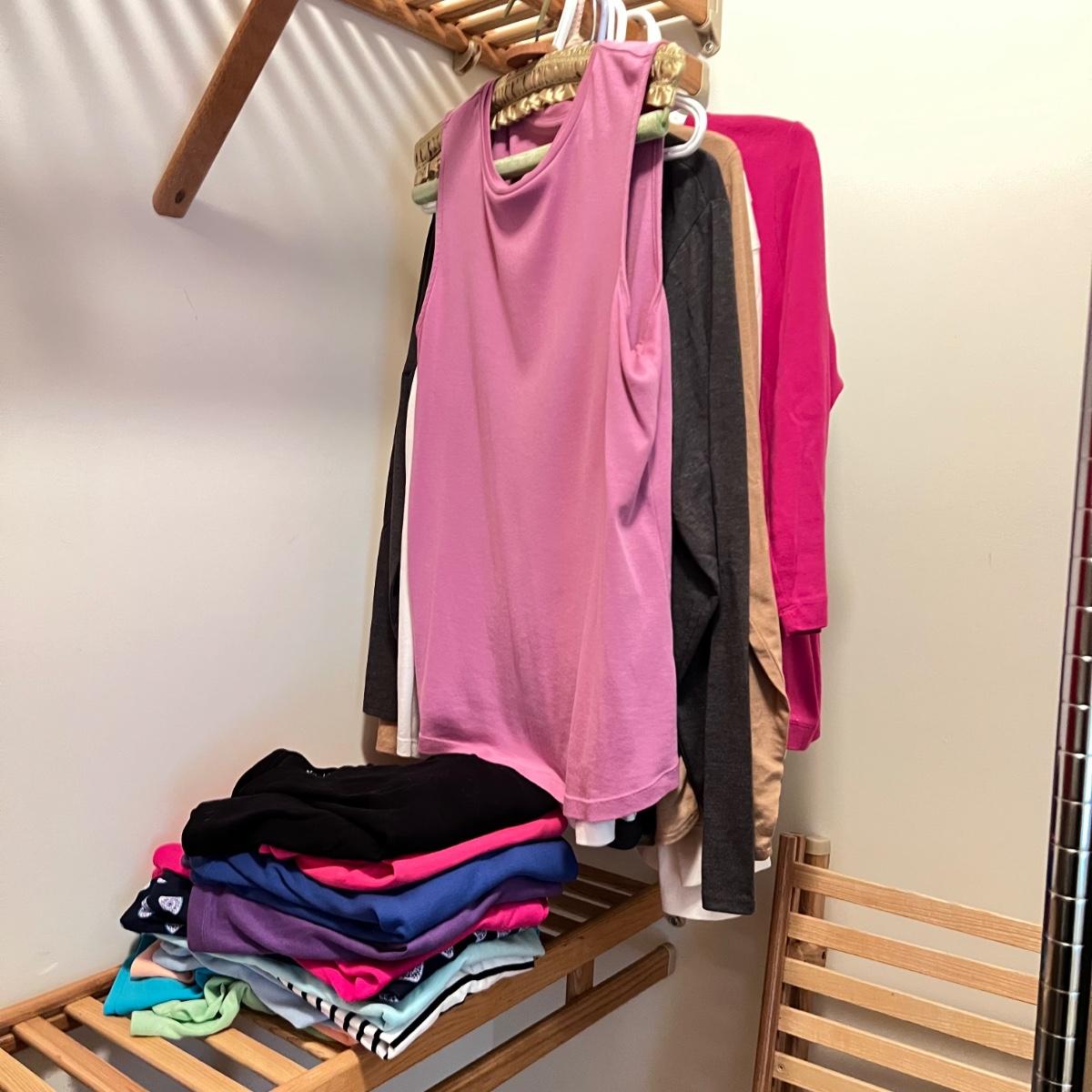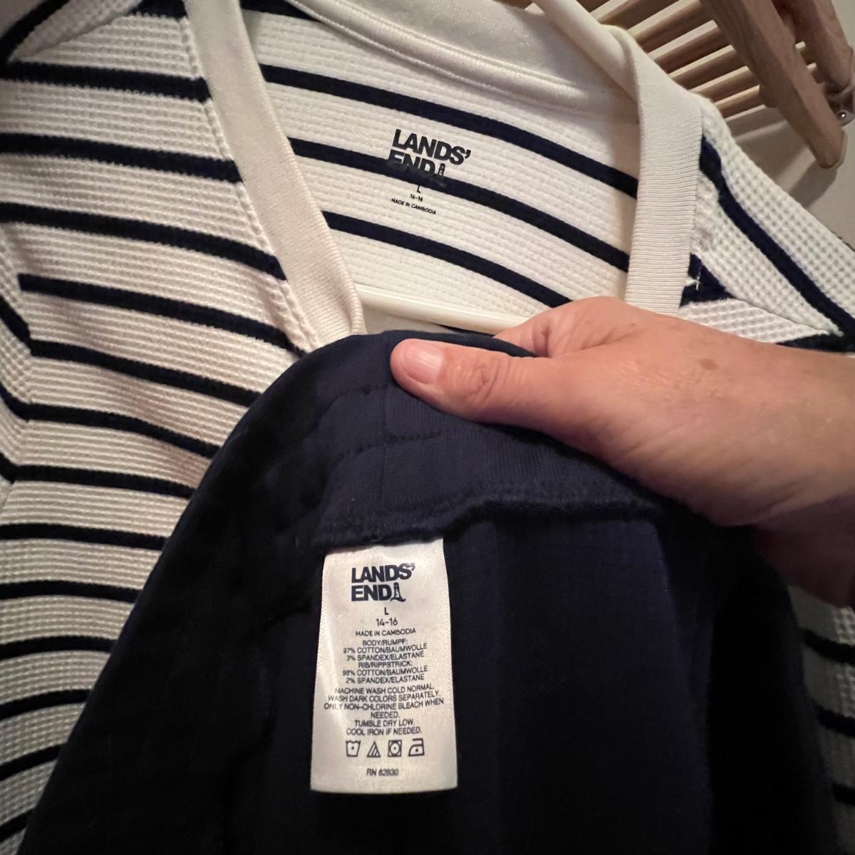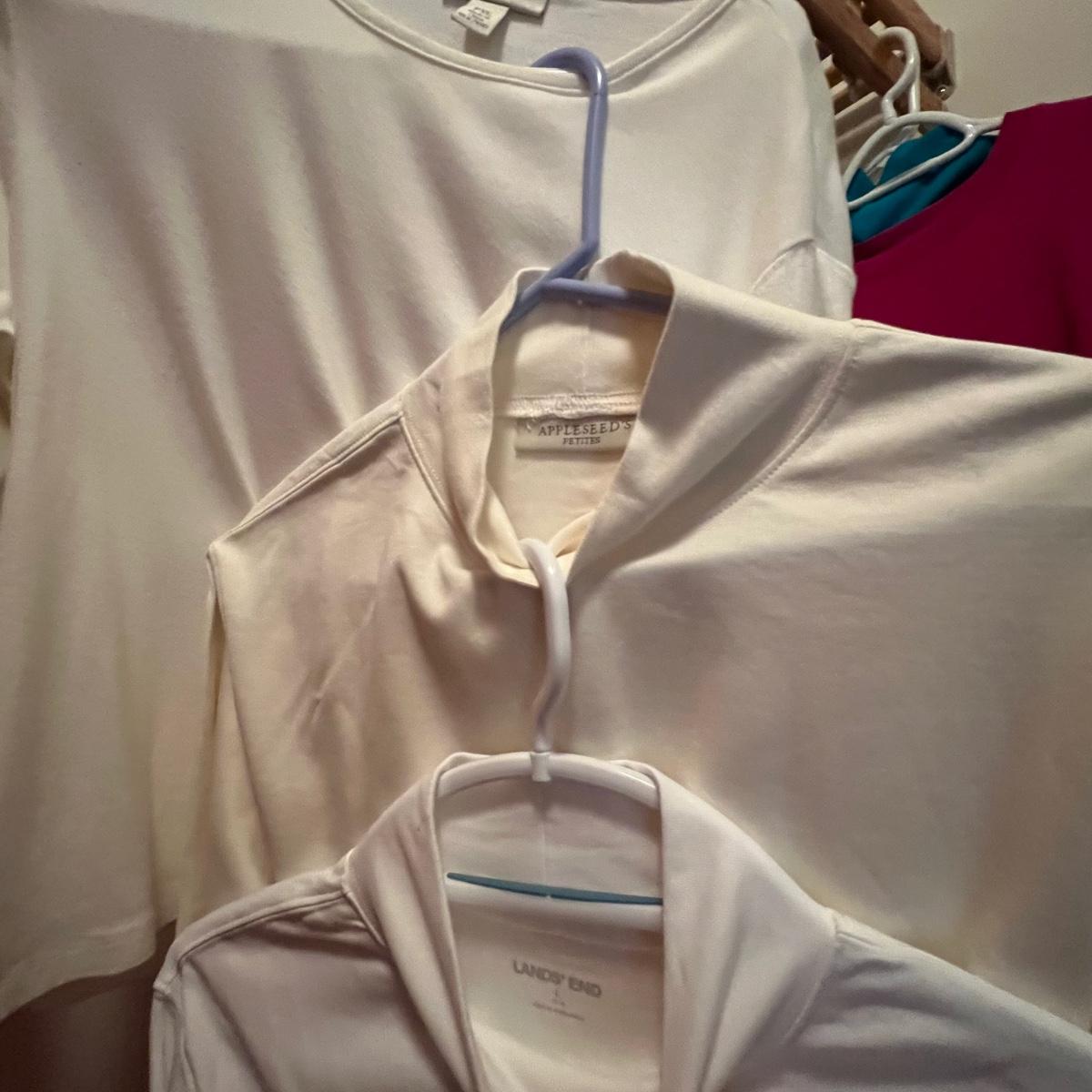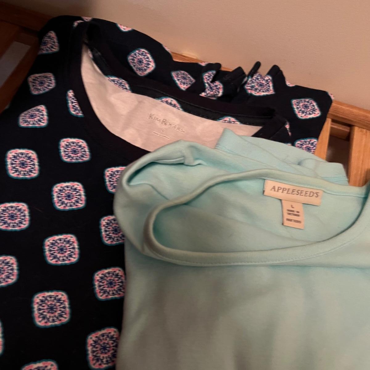 Camisoles plus short and long sleeved tee’s in this lot with great brand names. Sizes are mostly L and XL with a few generously sized mediums. The Lands End striped top has a matching pair of soft pull on pants.Hangers are not included.