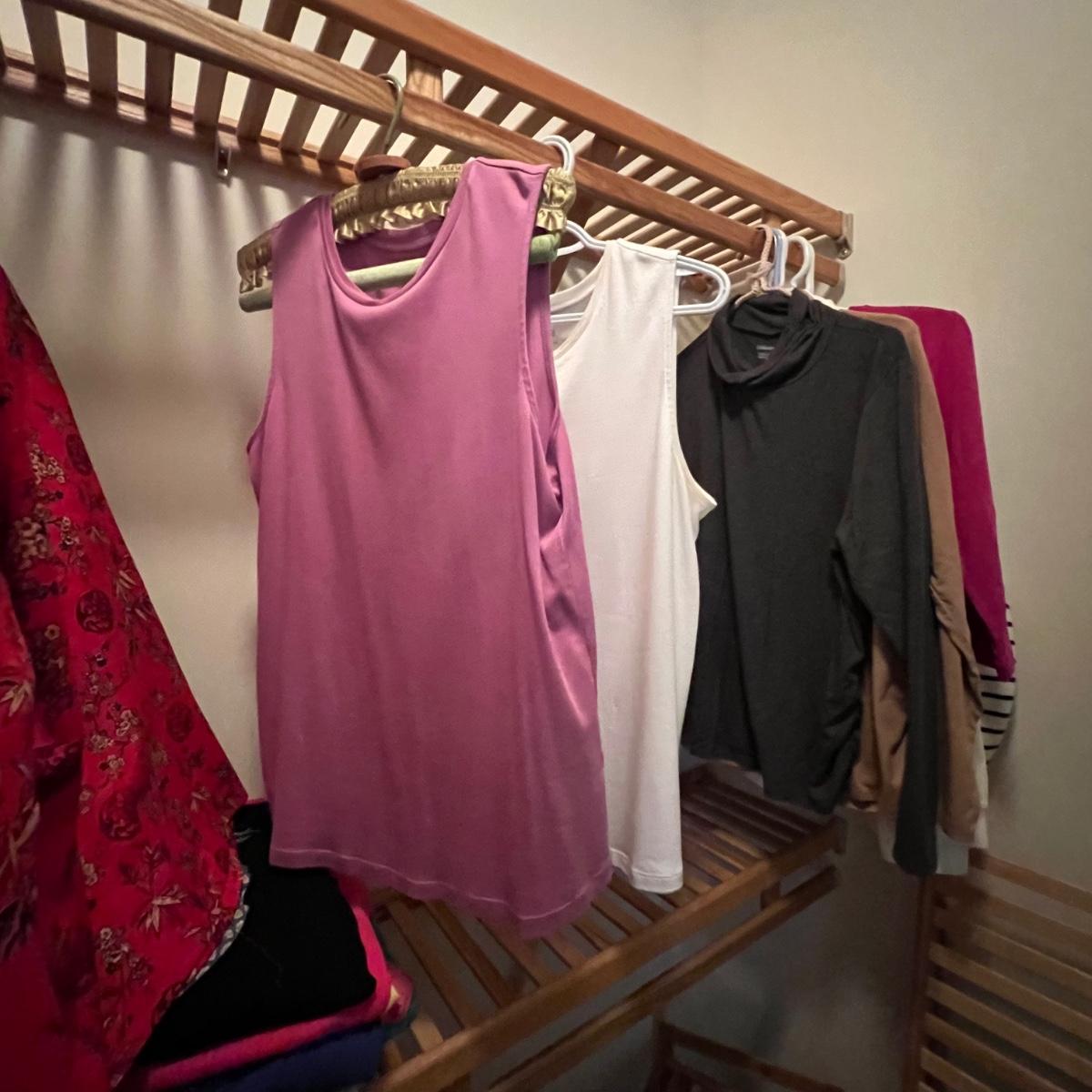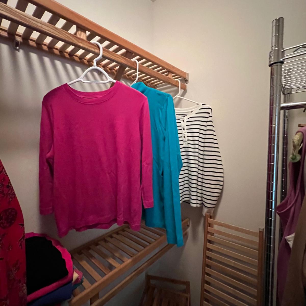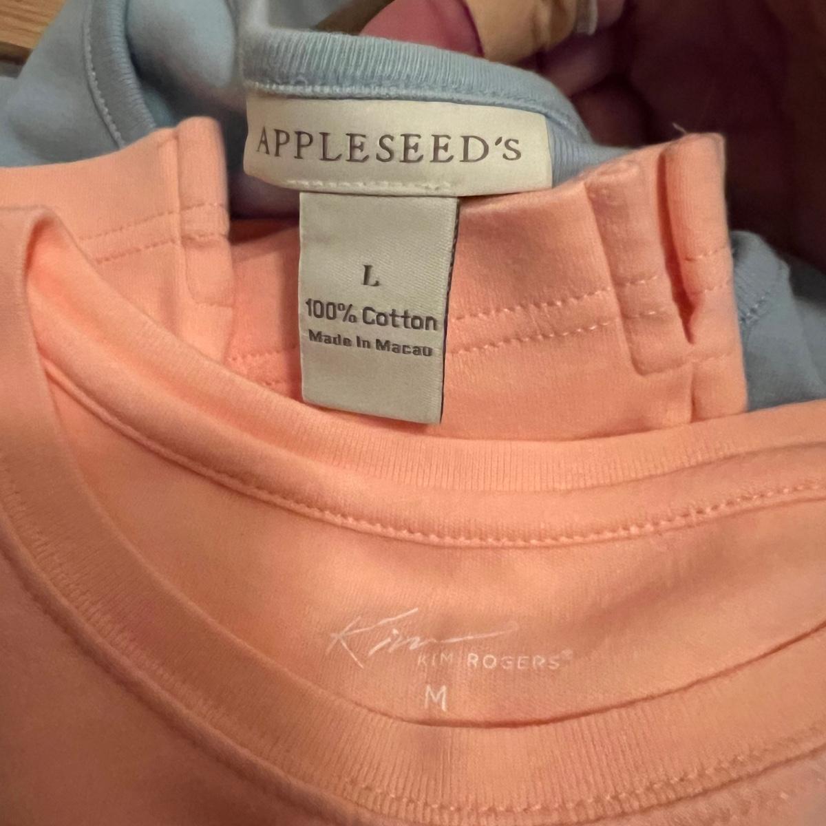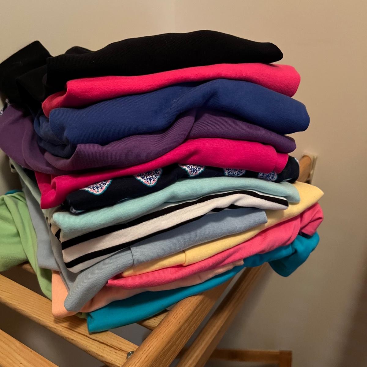 Camisoles plus short and long sleeved tee’s in this lot with great brand names. Sizes are mostly L and XL with a few generously sized mediums. The Lands End striped top has a matching pair of soft pull on pants.Hangers are not included.
