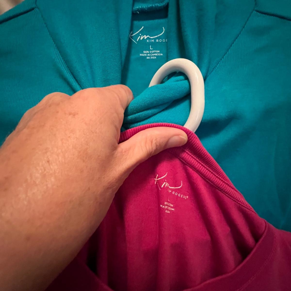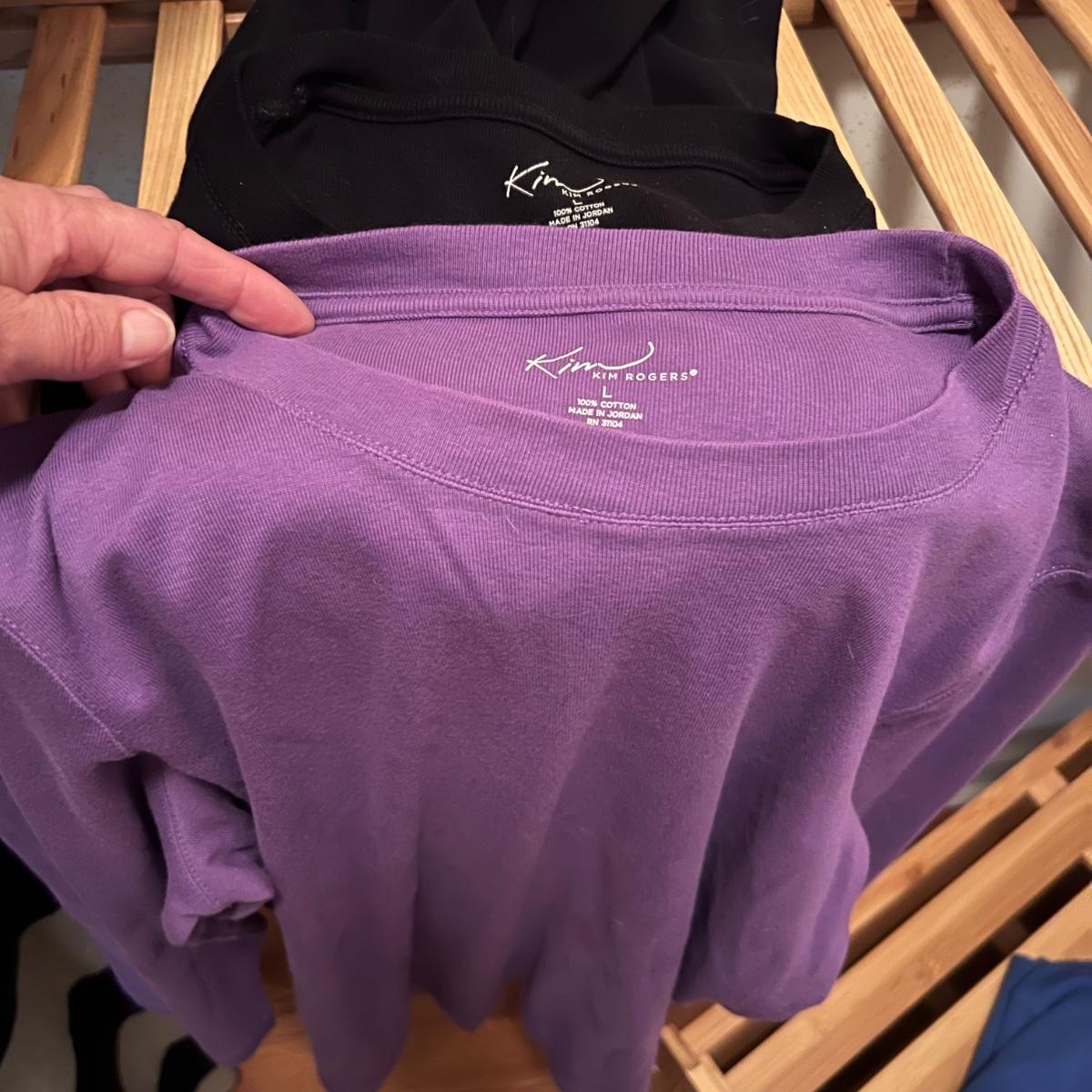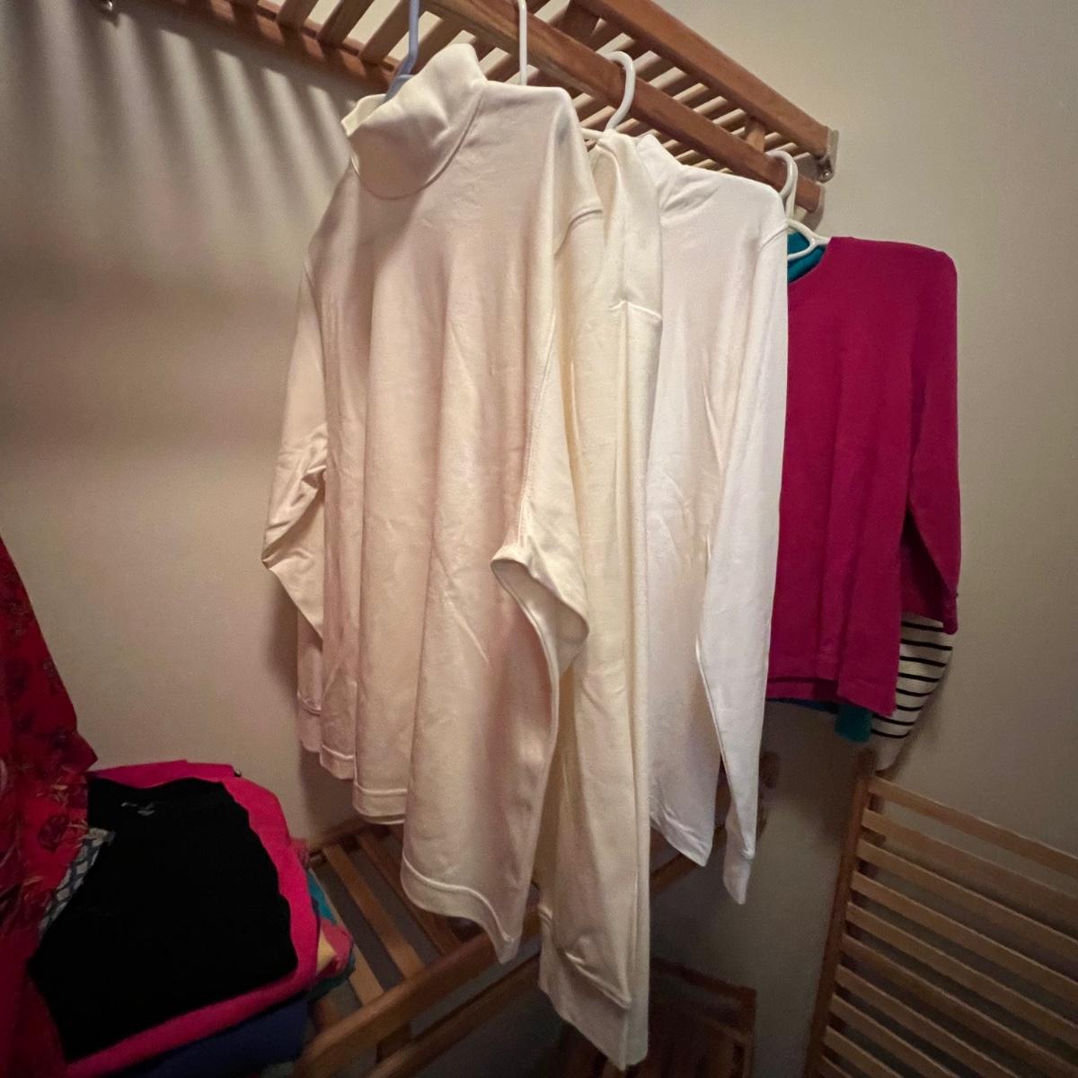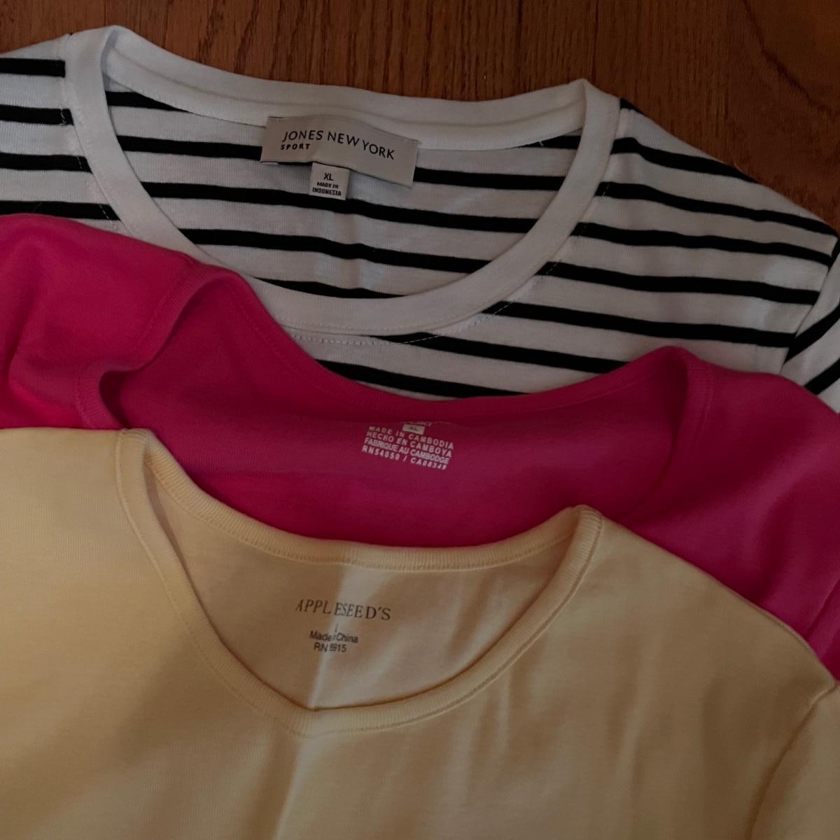 Camisoles plus short and long sleeved tee’s in this lot with great brand names. Sizes are mostly L and XL with a few generously sized mediums. The Lands End striped top has a matching pair of soft pull on pants.Hangers are not included.