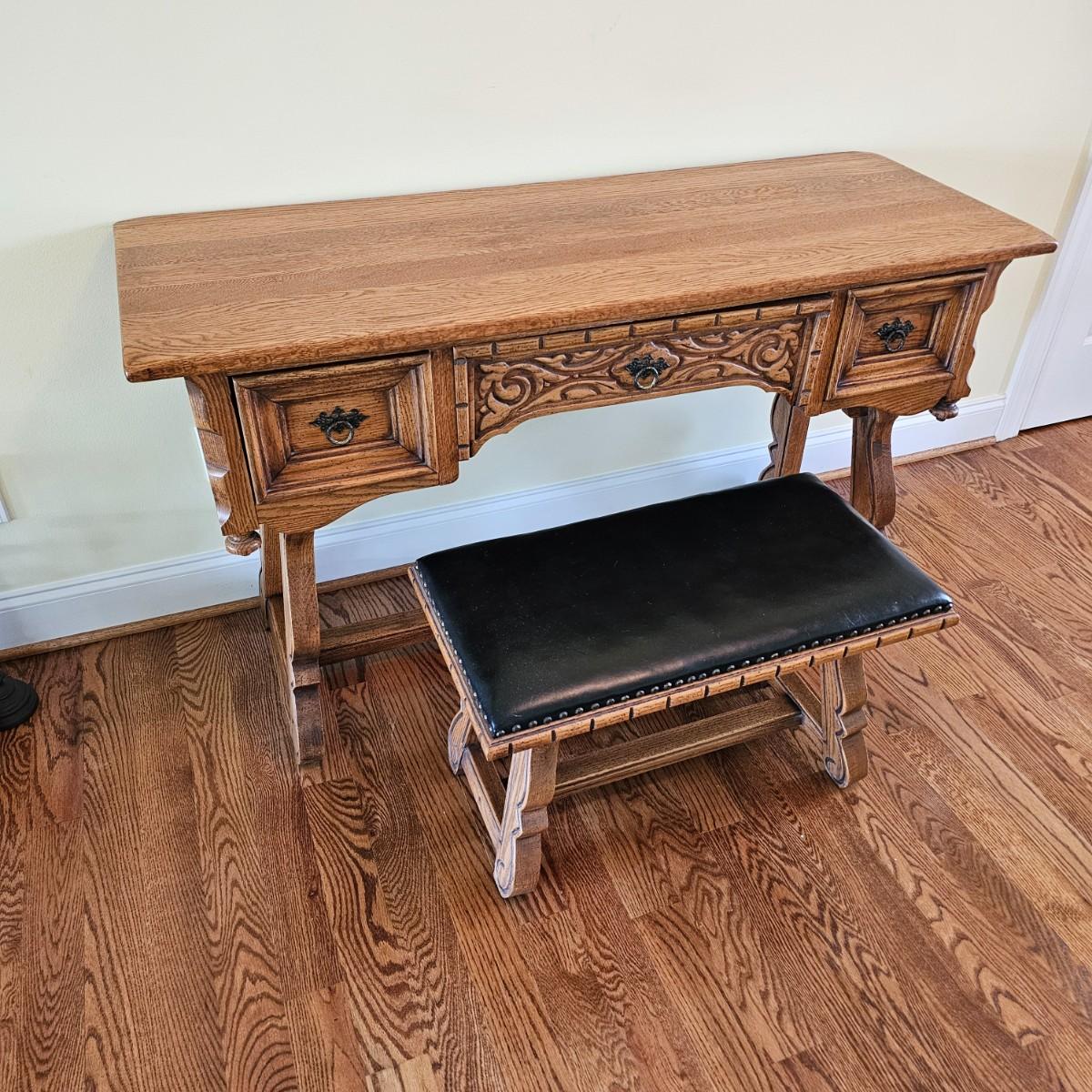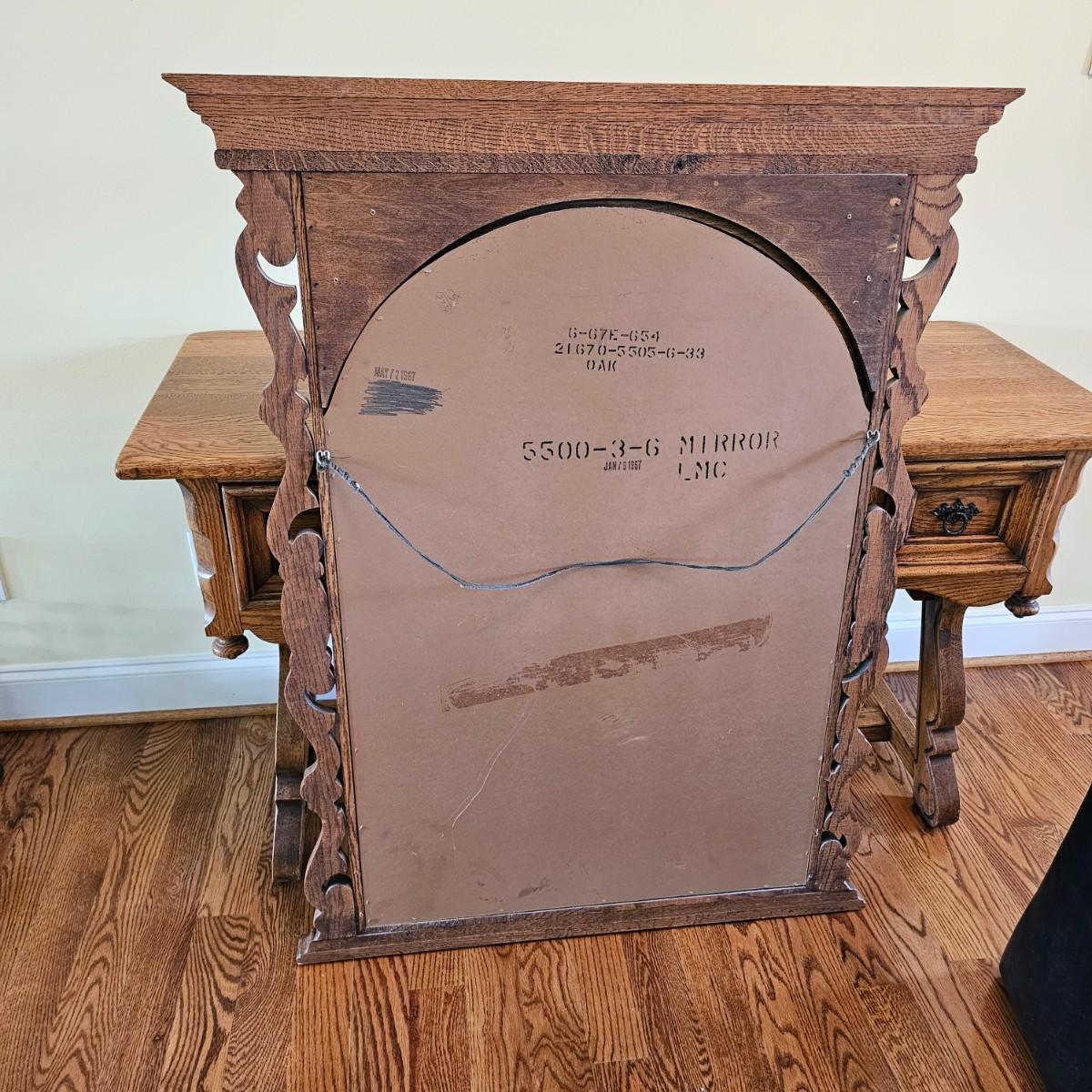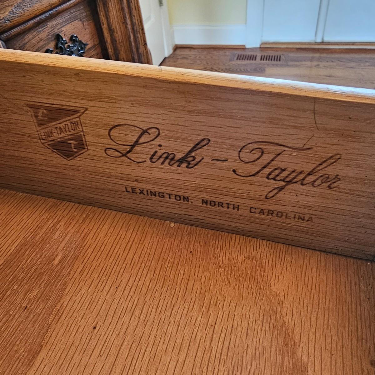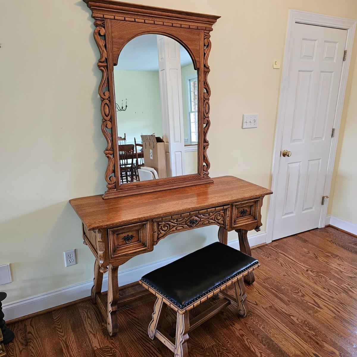 Solid oak vanity and pieces by Link-Taylor of Lexington N.C. All items have heavy decorative carving. Vanity has three drawers with dovetail joints. Vanity measures 20" x 54" x 31"H. Bench is 15" x 28" x 17"H. Seat may be leather. Mirror is 3" x 37.5" x 47.5"H. Light wear on top of Vanity. See other matching Link-Taylor furniture in this auction. See photos for details. Local pickup only. Winning bidder must bring assistance to help move and load this item due to its weight and/or size. Items are on first floor.