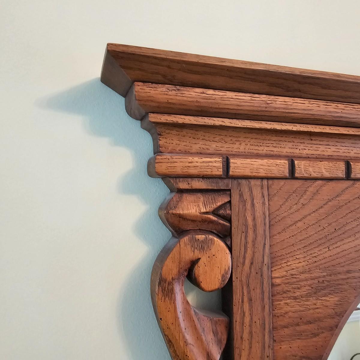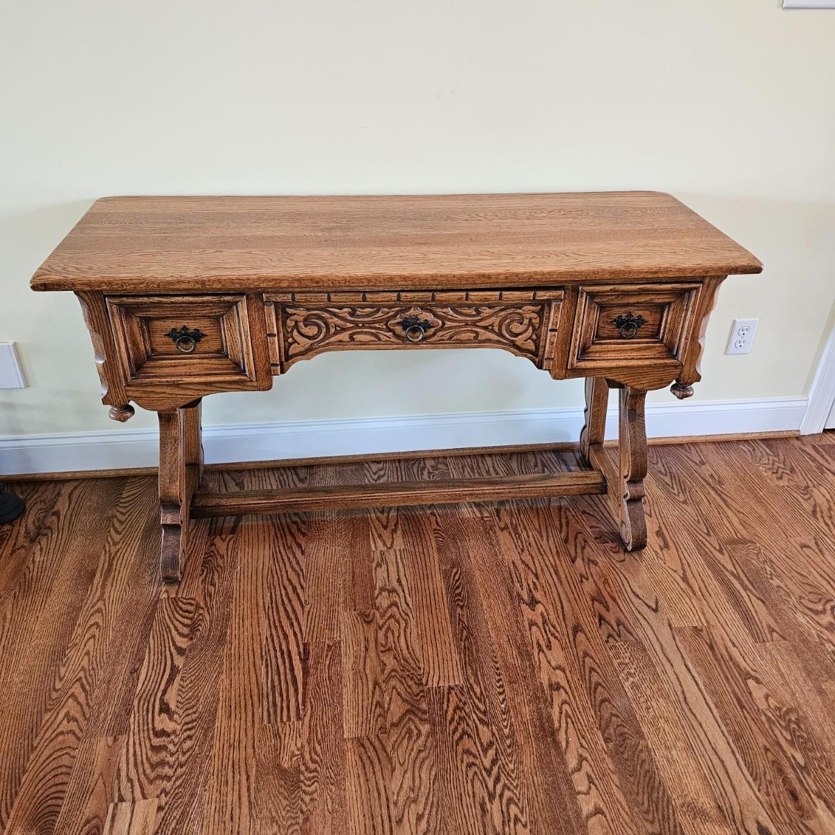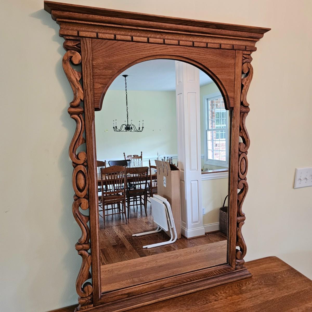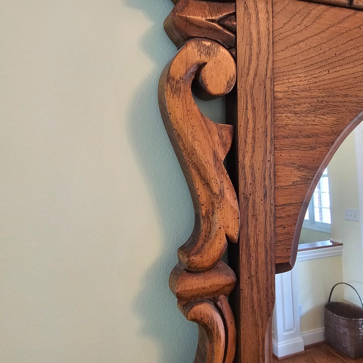 Solid oak vanity and pieces by Link-Taylor of Lexington N.C. All items have heavy decorative carving. Vanity has three drawers with dovetail joints. Vanity measures 20" x 54" x 31"H. Bench is 15" x 28" x 17"H. Seat may be leather. Mirror is 3" x 37.5" x 47.5"H. Light wear on top of Vanity. See other matching Link-Taylor furniture in this auction. See photos for details. Local pickup only. Winning bidder must bring assistance to help move and load this item due to its weight and/or size. Items are on first floor.