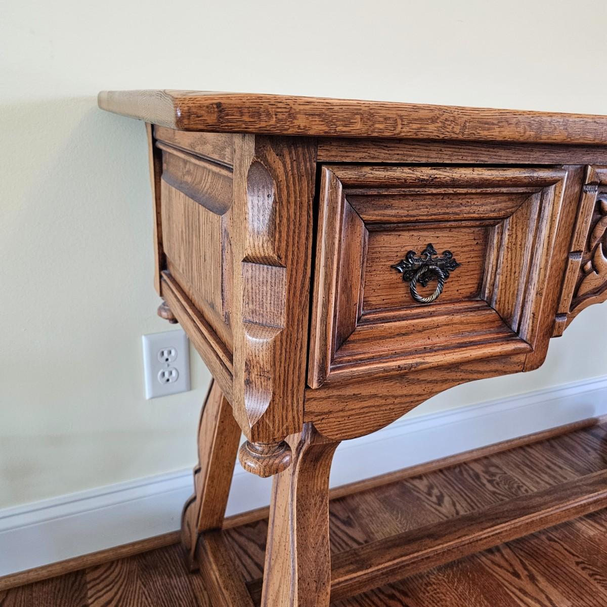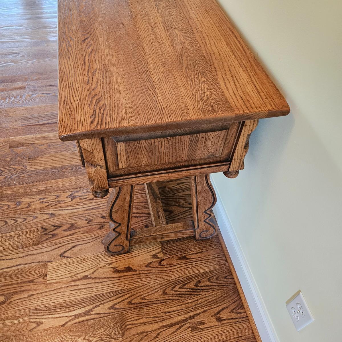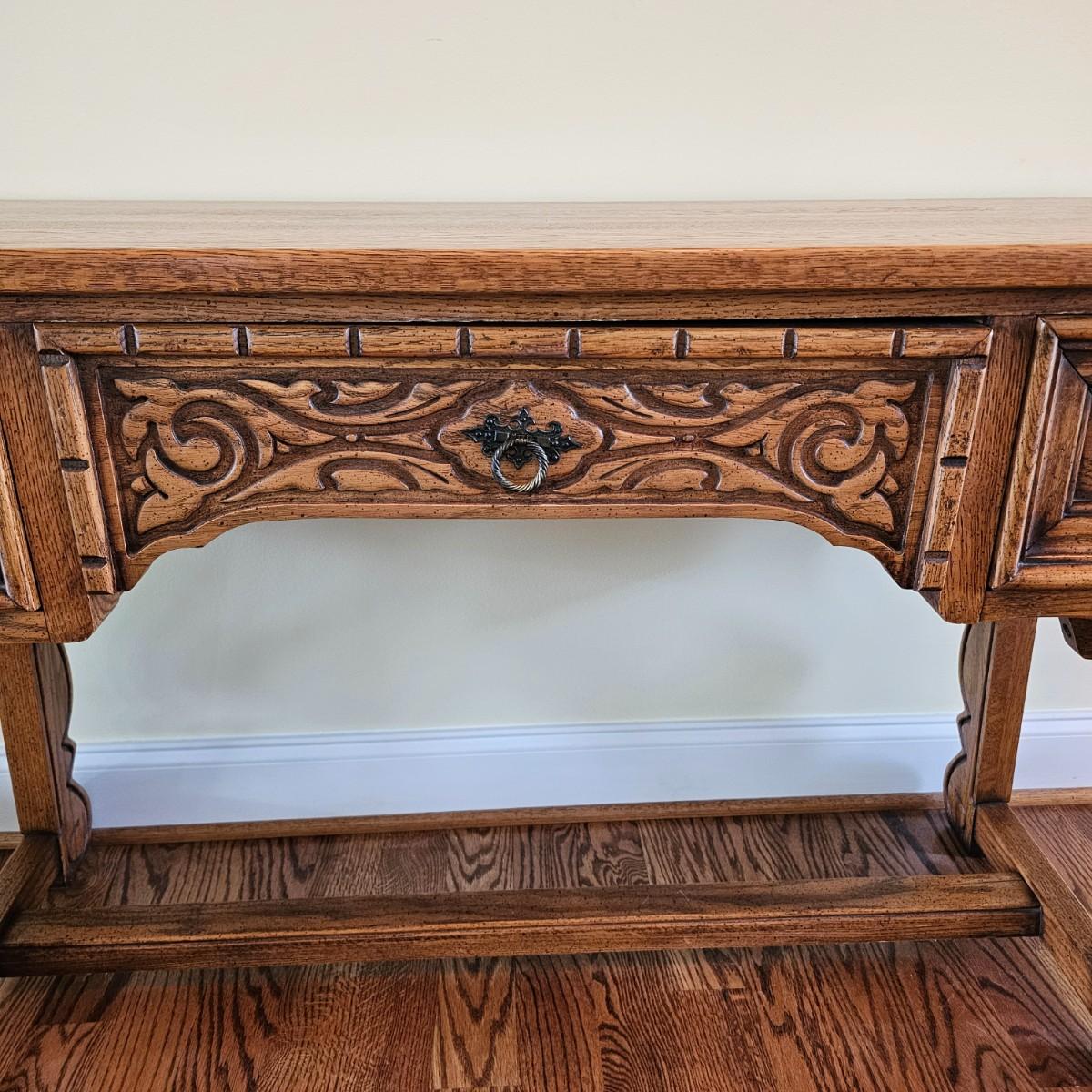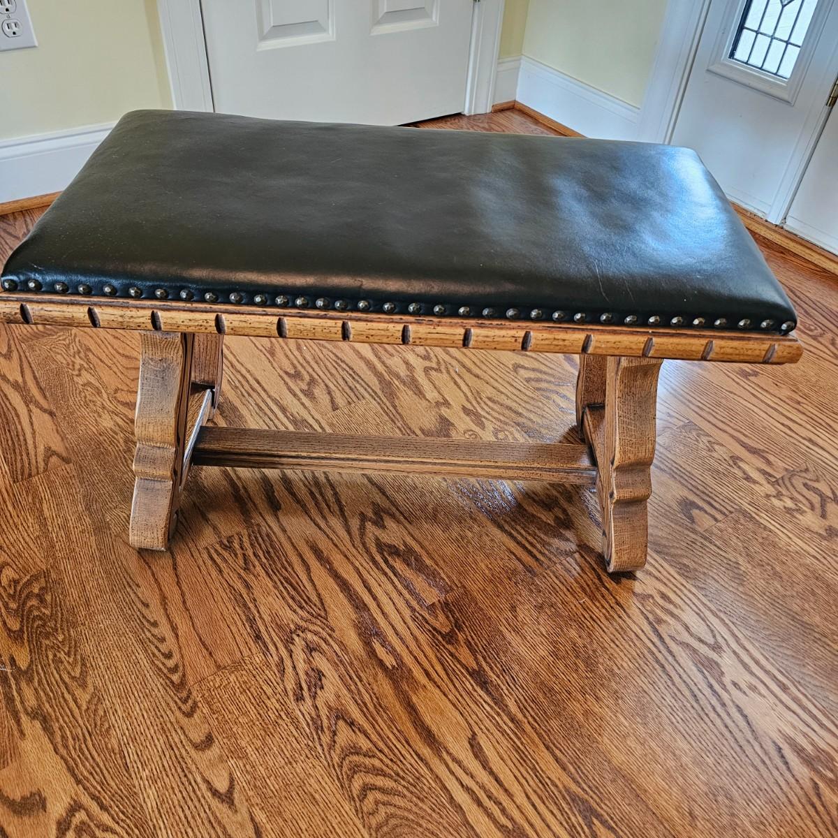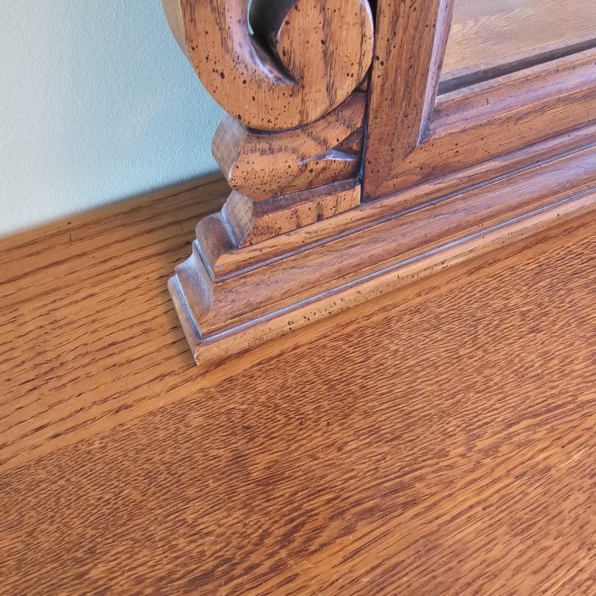 Solid oak vanity and pieces by Link-Taylor of Lexington N.C. All items have heavy decorative carving. Vanity has three drawers with dovetail joints. Vanity measures 20" x 54" x 31"H. Bench is 15" x 28" x 17"H. Seat may be leather. Mirror is 3" x 37.5" x 47.5"H. Light wear on top of Vanity. See other matching Link-Taylor furniture in this auction. See photos for details. Local pickup only. Winning bidder must bring assistance to help move and load this item due to its weight and/or size. Items are on first floor.