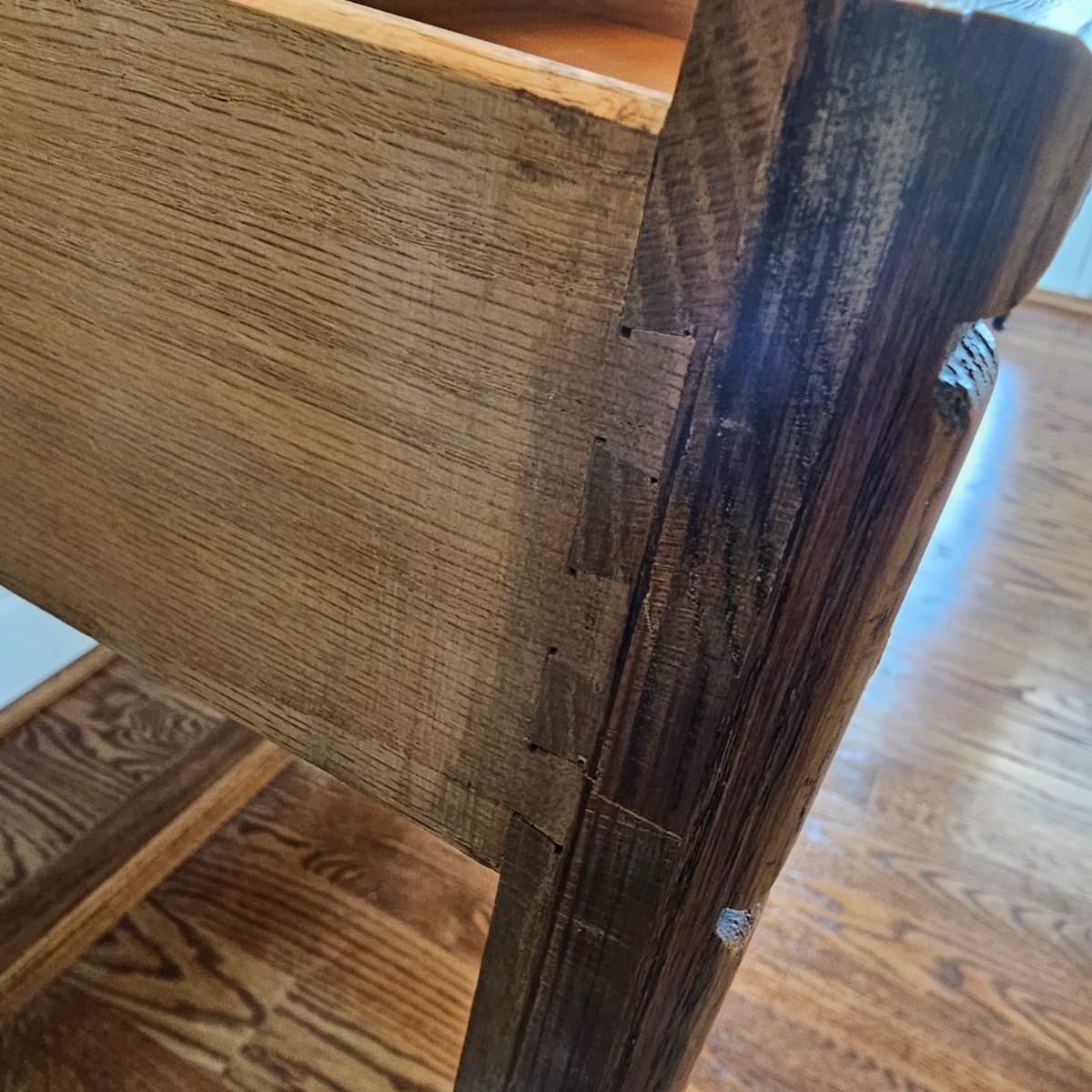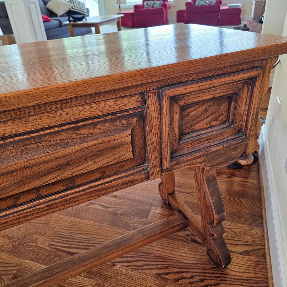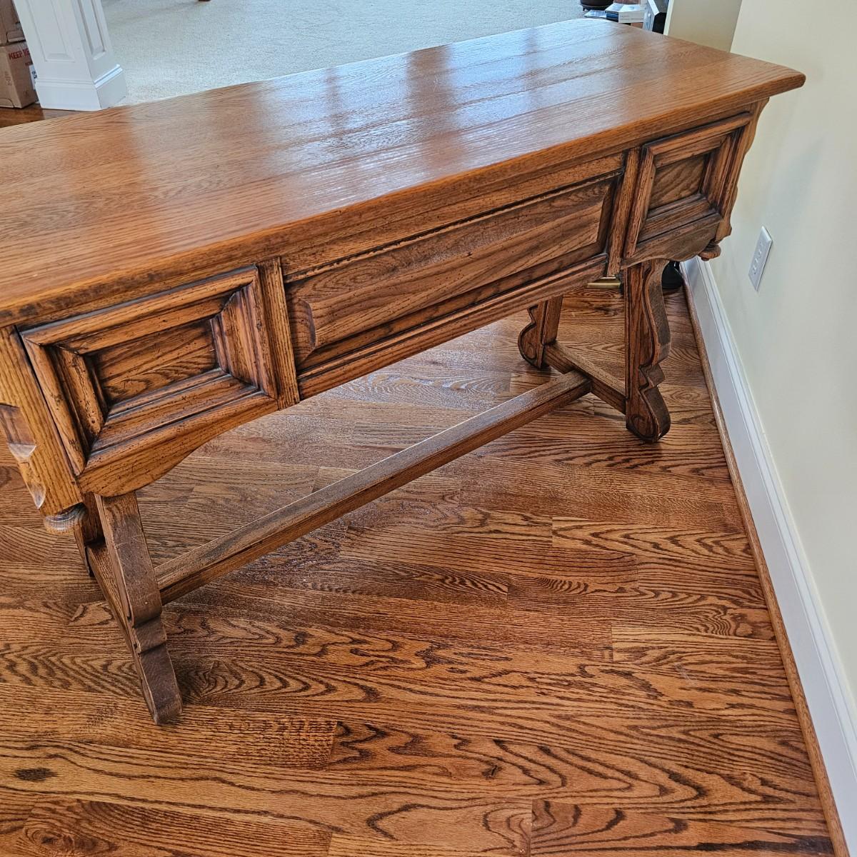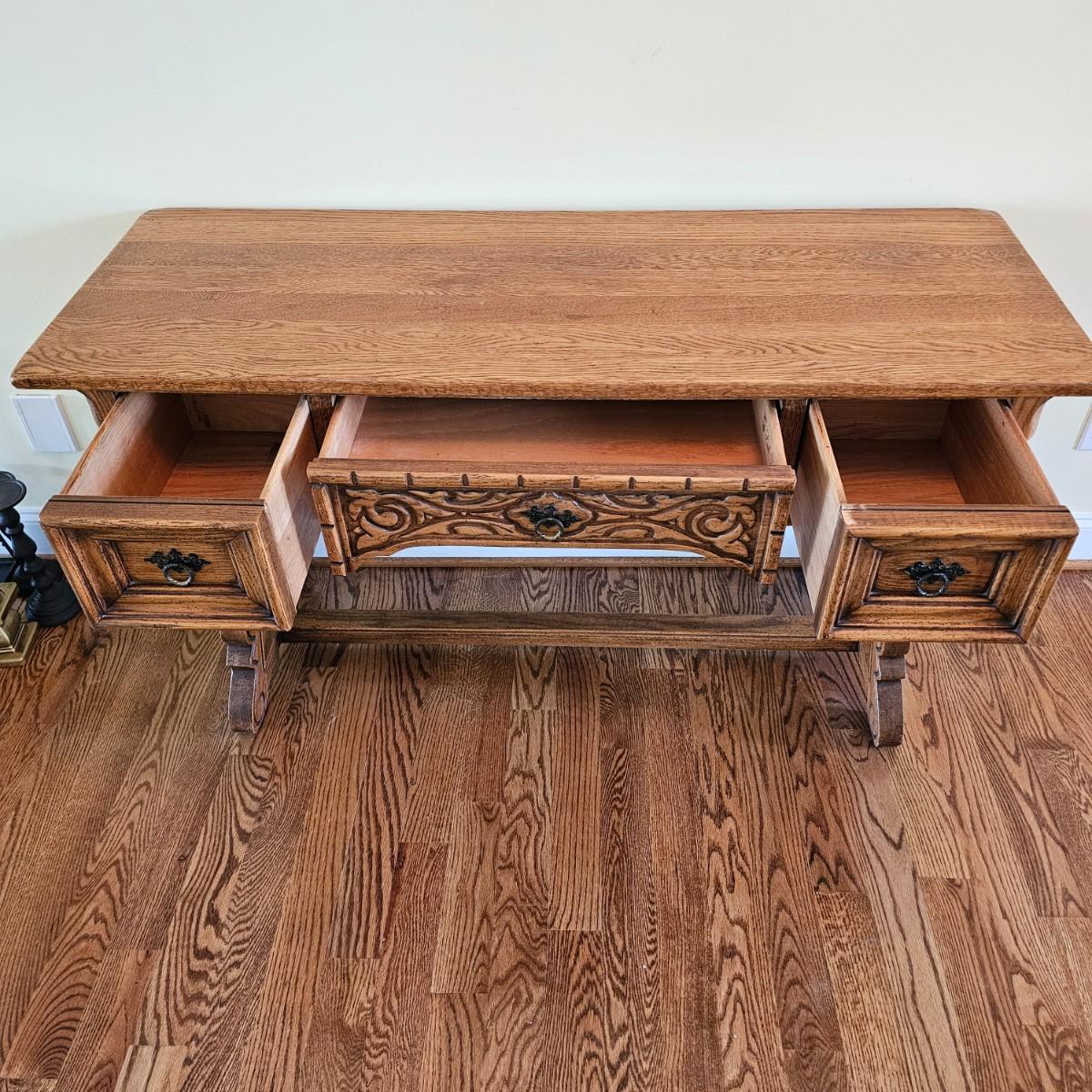 Solid oak vanity and pieces by Link-Taylor of Lexington N.C. All items have heavy decorative carving. Vanity has three drawers with dovetail joints. Vanity measures 20" x 54" x 31"H. Bench is 15" x 28" x 17"H. Seat may be leather. Mirror is 3" x 37.5" x 47.5"H. Light wear on top of Vanity. See other matching Link-Taylor furniture in this auction. See photos for details. Local pickup only. Winning bidder must bring assistance to help move and load this item due to its weight and/or size. Items are on first floor.