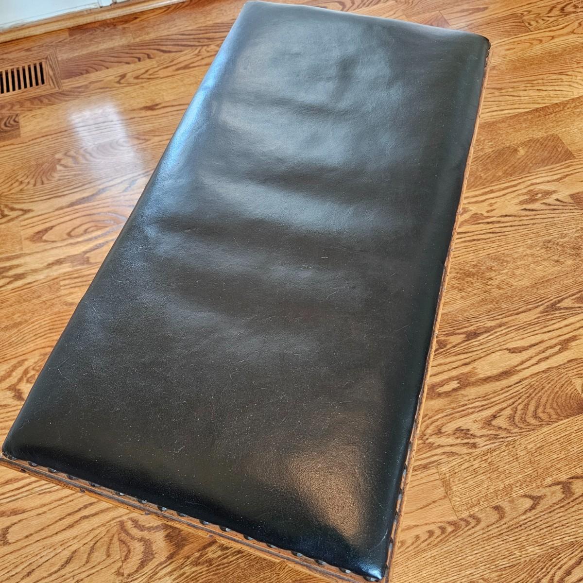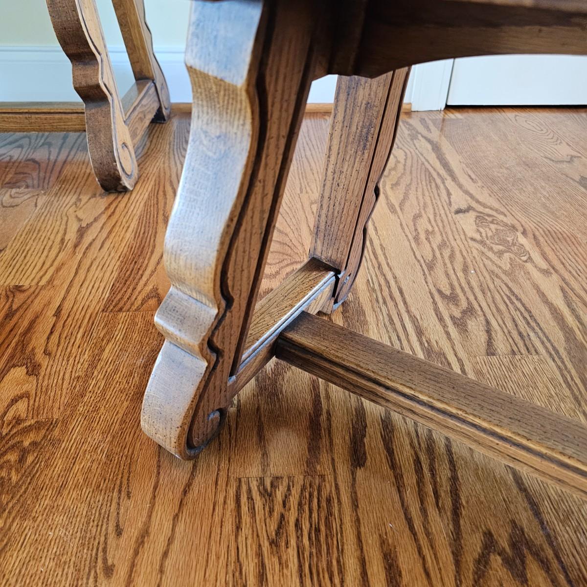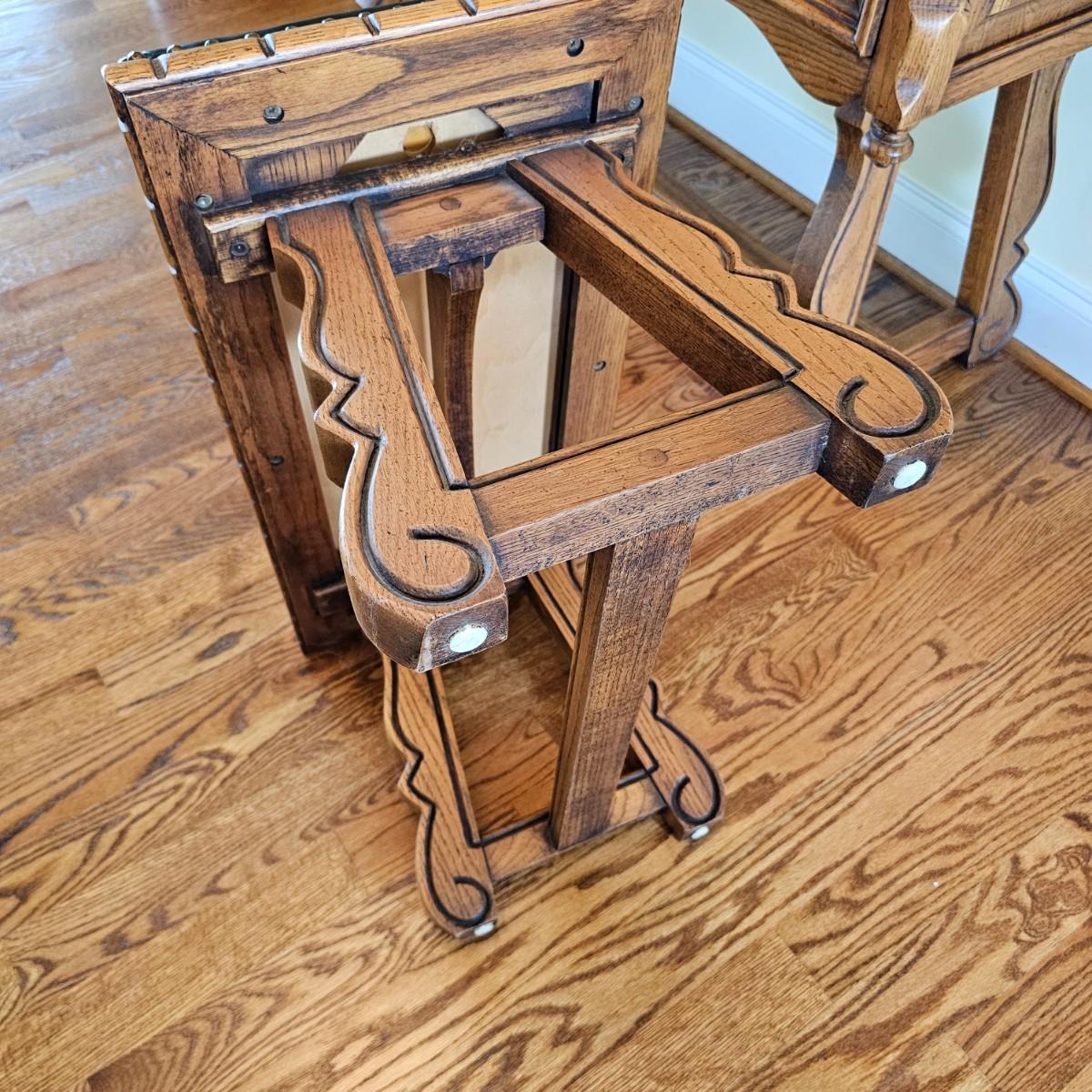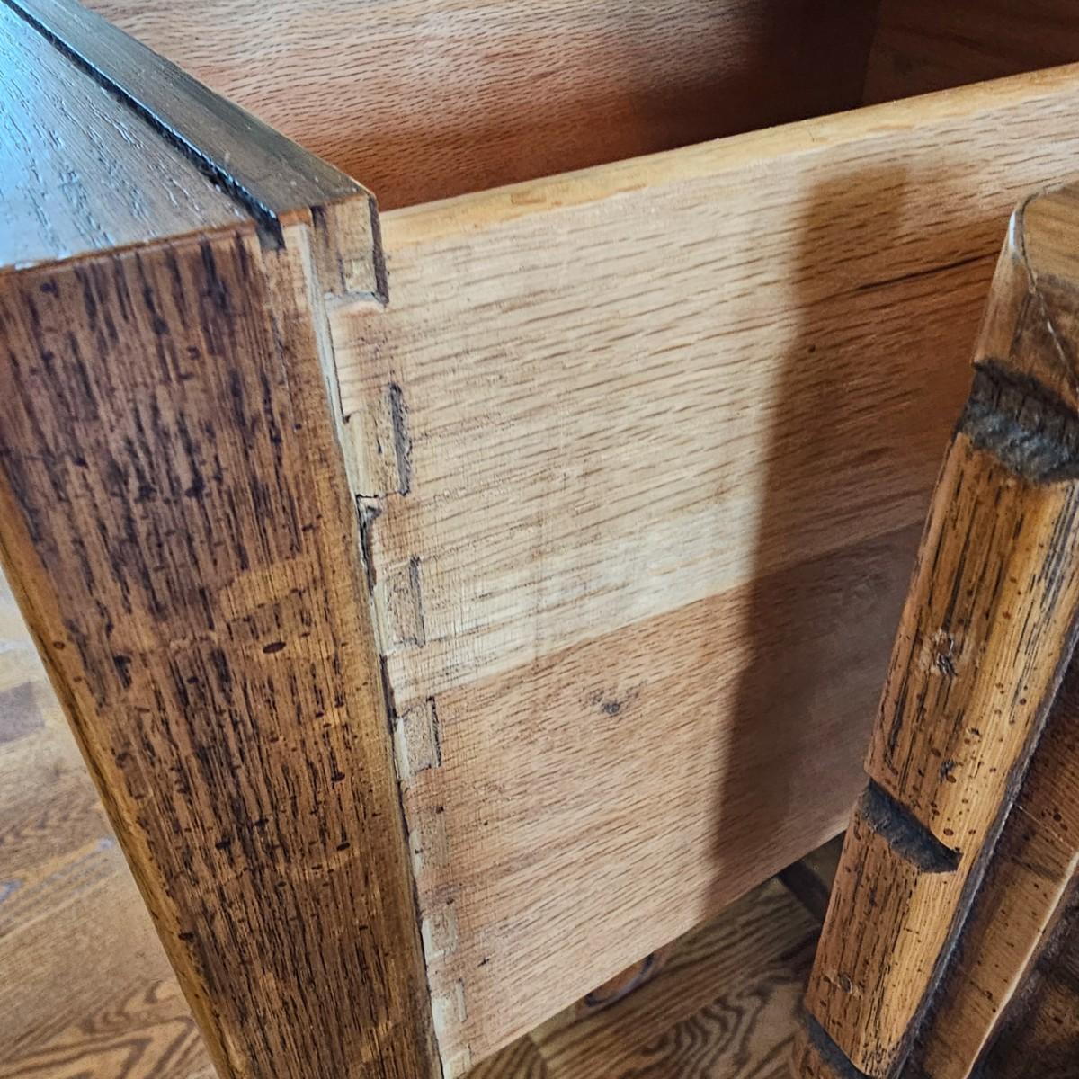 Solid oak vanity and pieces by Link-Taylor of Lexington N.C. All items have heavy decorative carving. Vanity has three drawers with dovetail joints. Vanity measures 20" x 54" x 31"H. Bench is 15" x 28" x 17"H. Seat may be leather. Mirror is 3" x 37.5" x 47.5"H. Light wear on top of Vanity. See other matching Link-Taylor furniture in this auction. See photos for details. Local pickup only. Winning bidder must bring assistance to help move and load this item due to its weight and/or size. Items are on first floor.