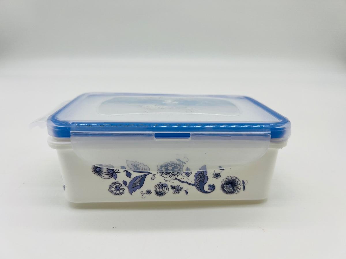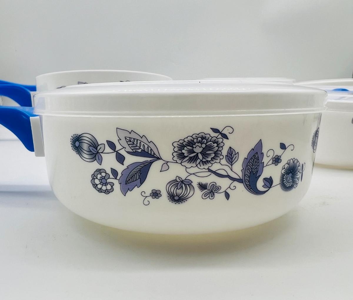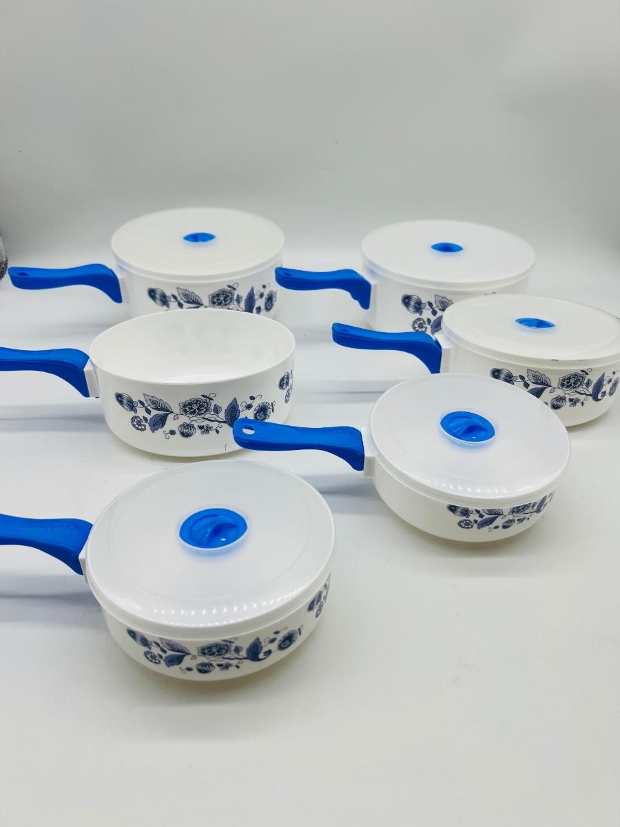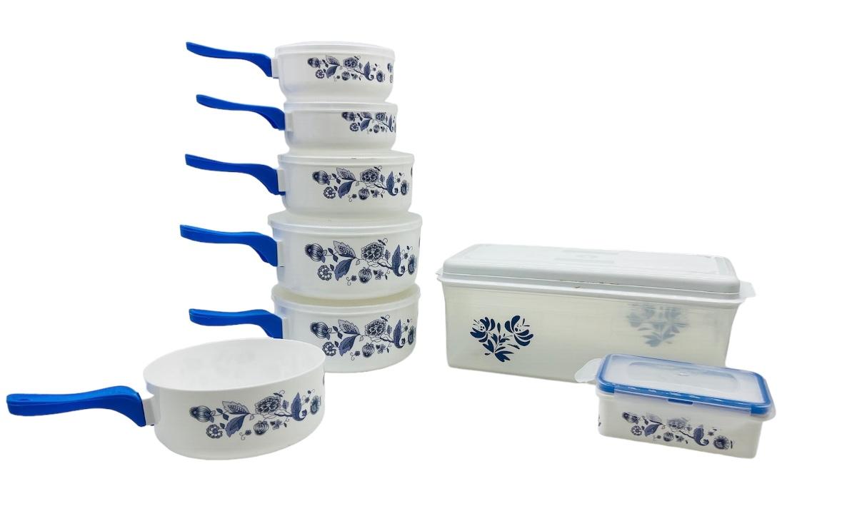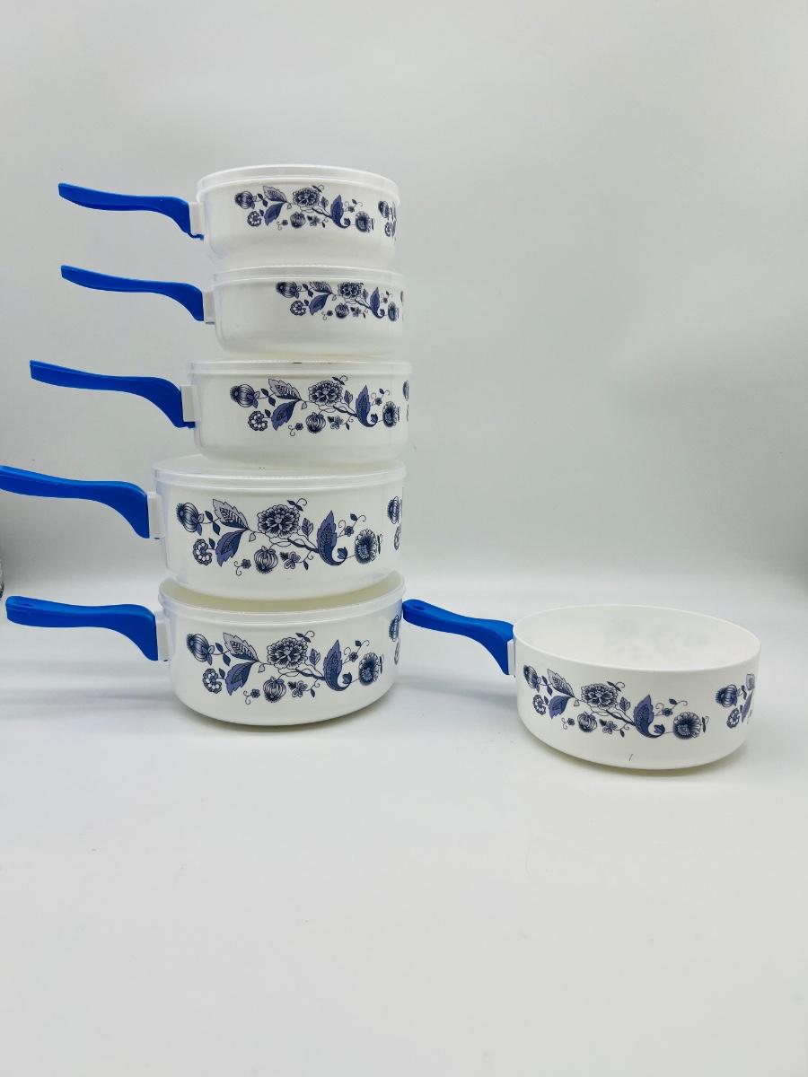 This is made to mimick the good ole days but is plastic. Blue handles are removable and can be used for refrigeration. 8 pieces total. One lid is missing, see picture.