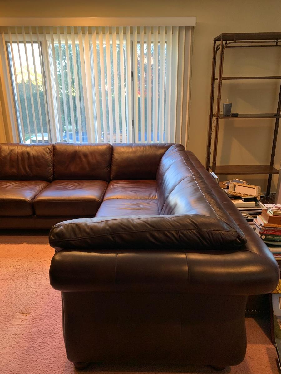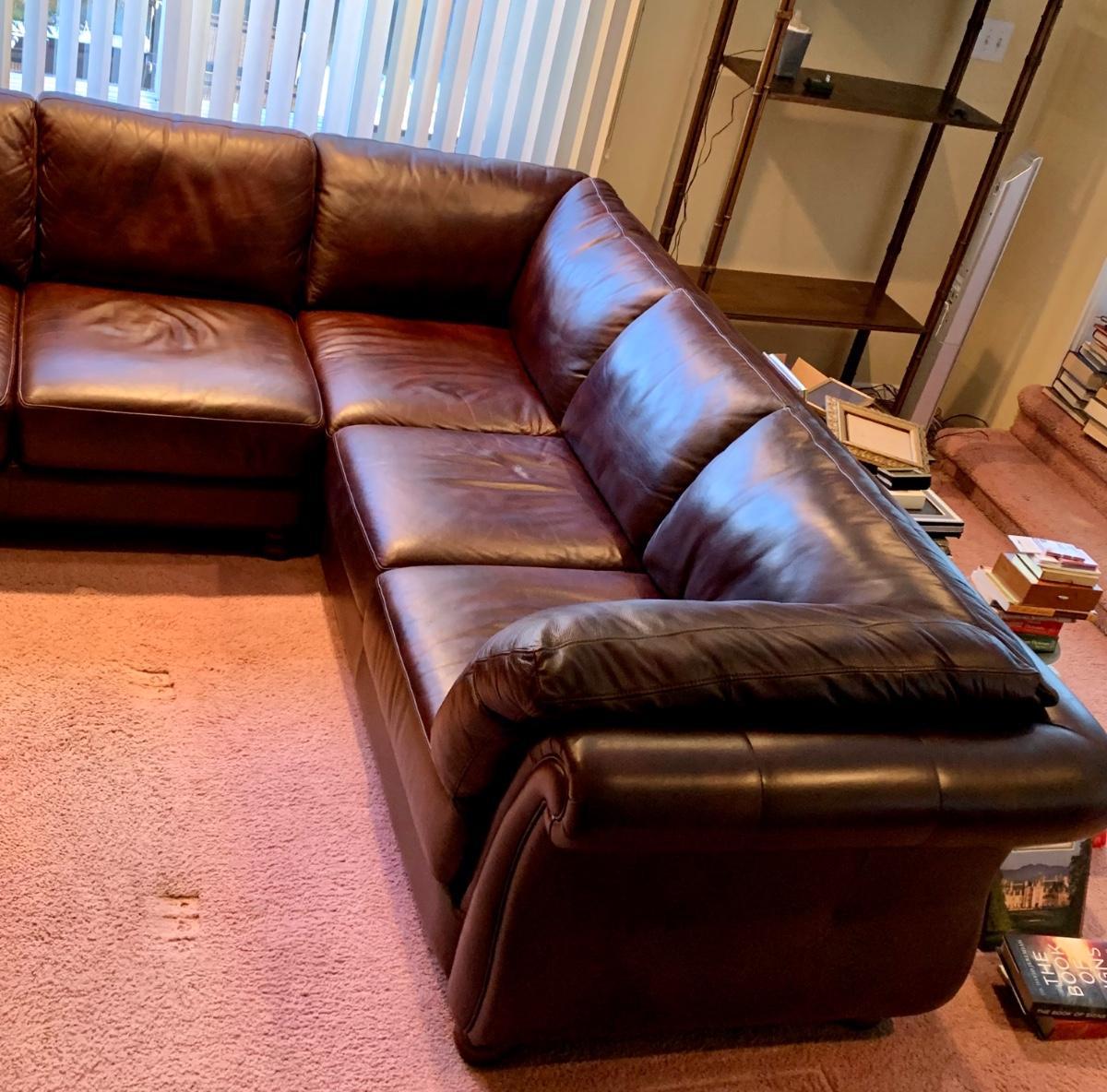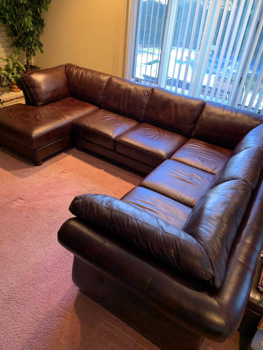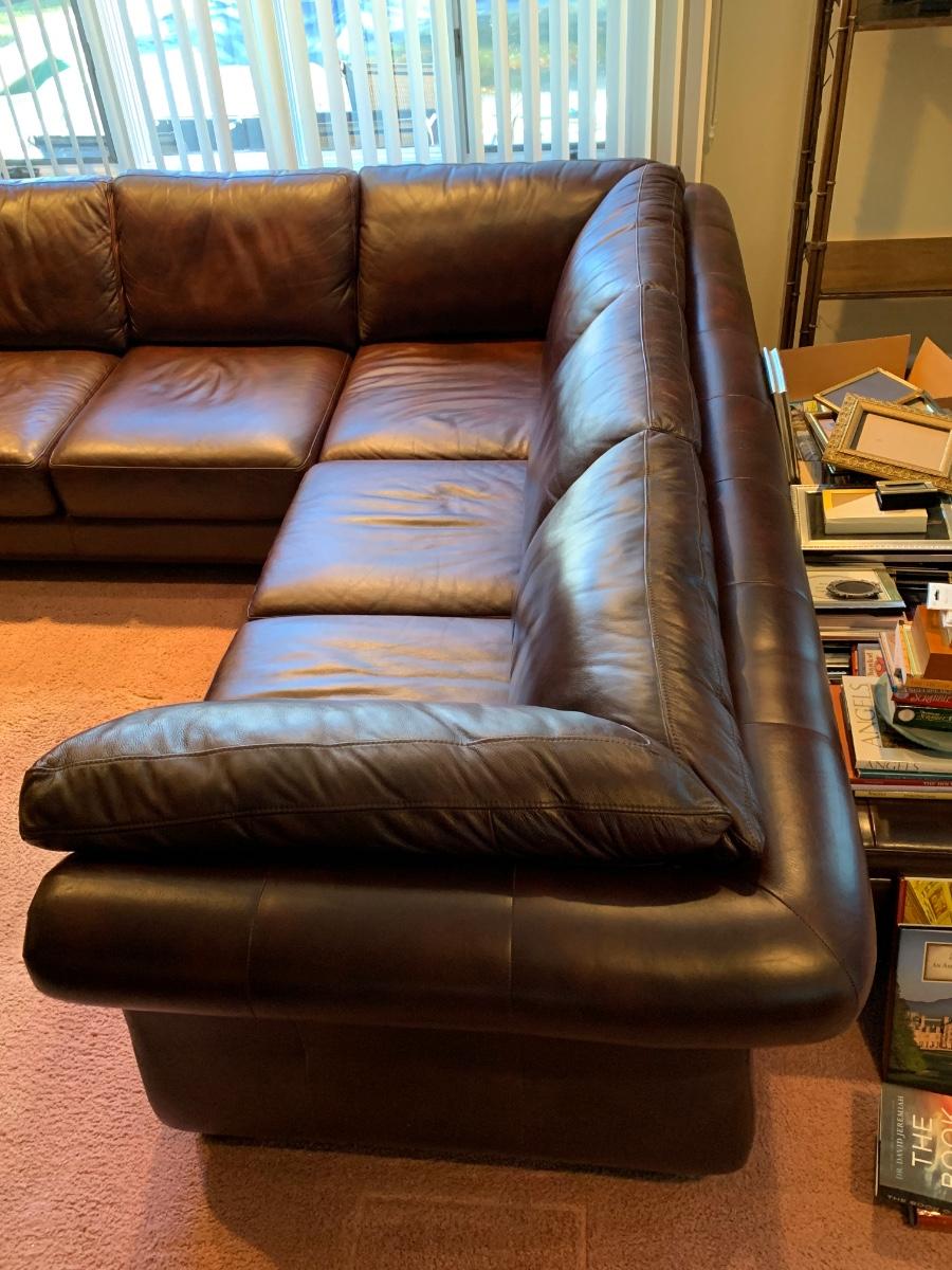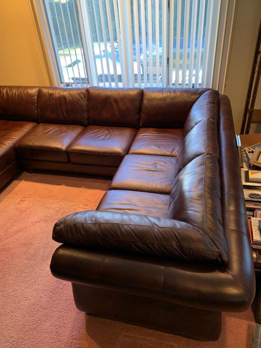 This leather sectional is beautiful, comfortable and in remarkable condition. It is a large piece of furniture with outstanding craftsmanship. Seat cushions are strapped into place and the back pillows zipper. The back of the sofa is fashioned in curved/tufted pattern (please see pictures).