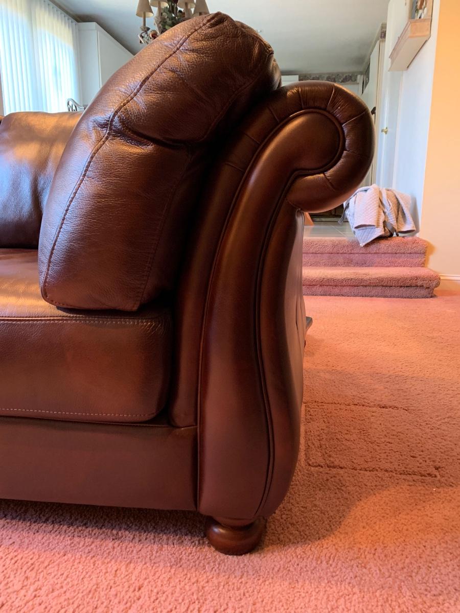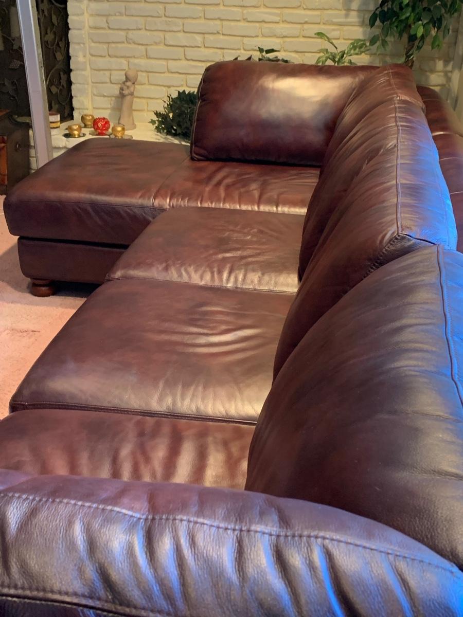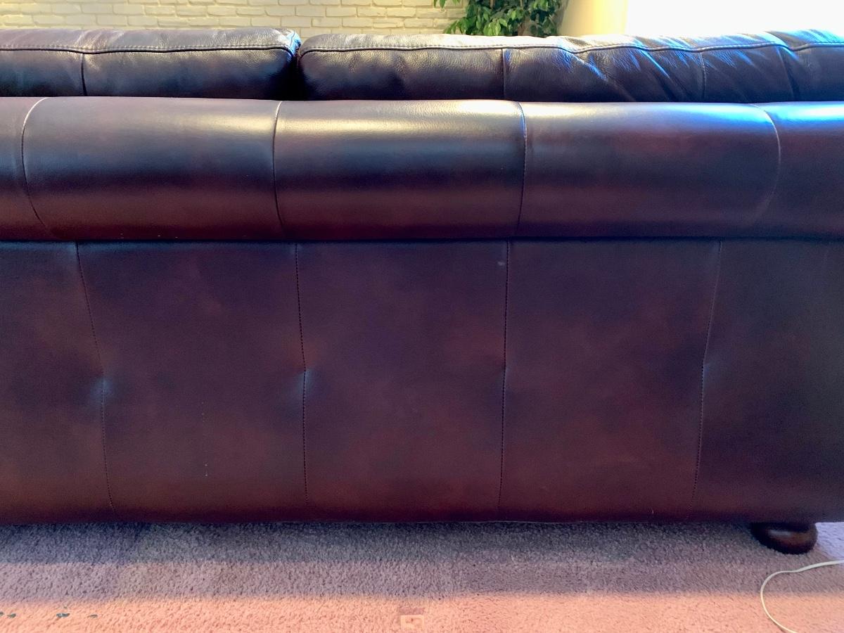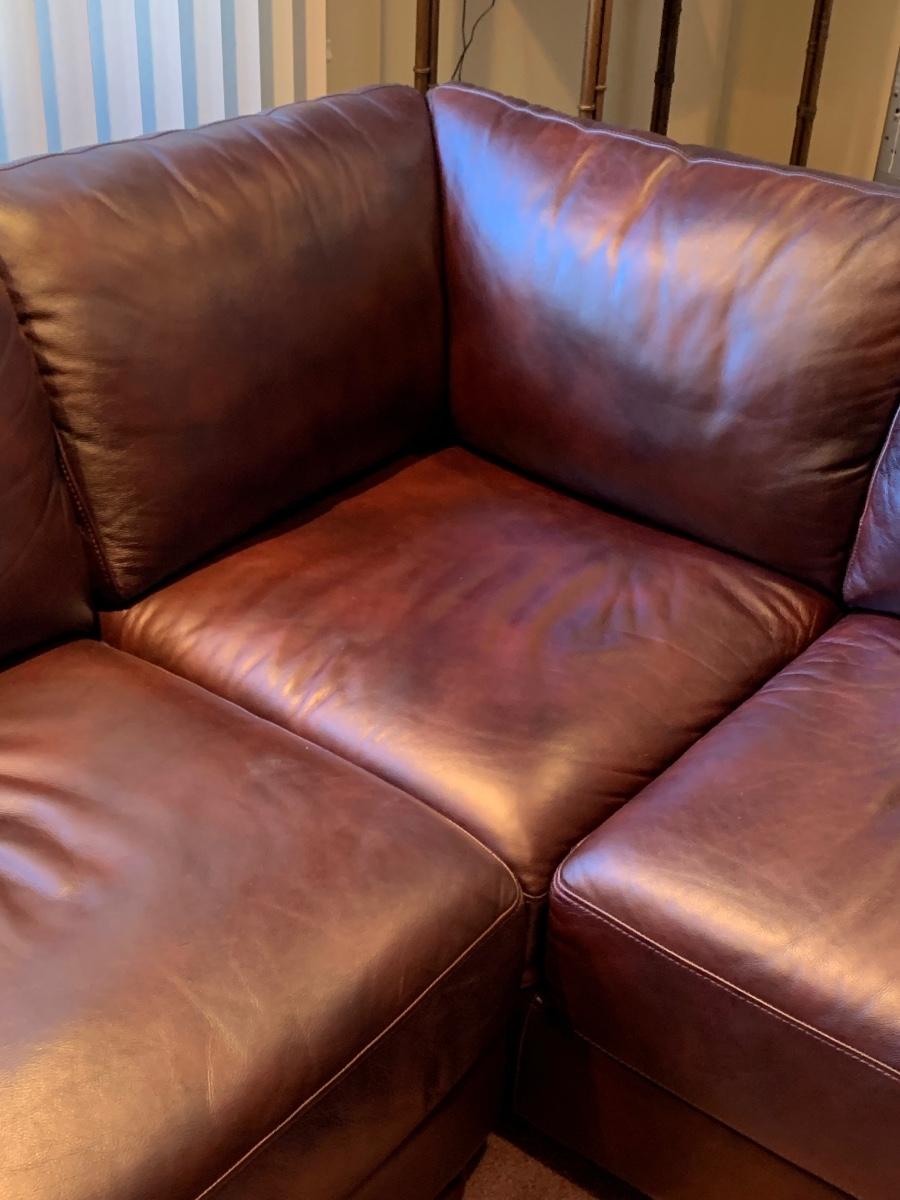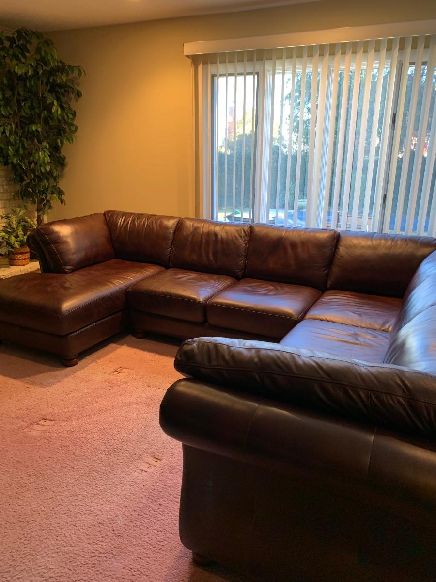 This leather sectional is beautiful, comfortable and in remarkable condition. It is a large piece of furniture with outstanding craftsmanship. Seat cushions are strapped into place and the back pillows zipper. The back of the sofa is fashioned in curved/tufted pattern (please see pictures).