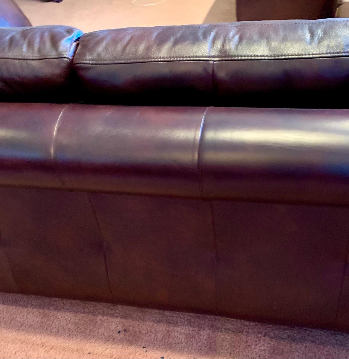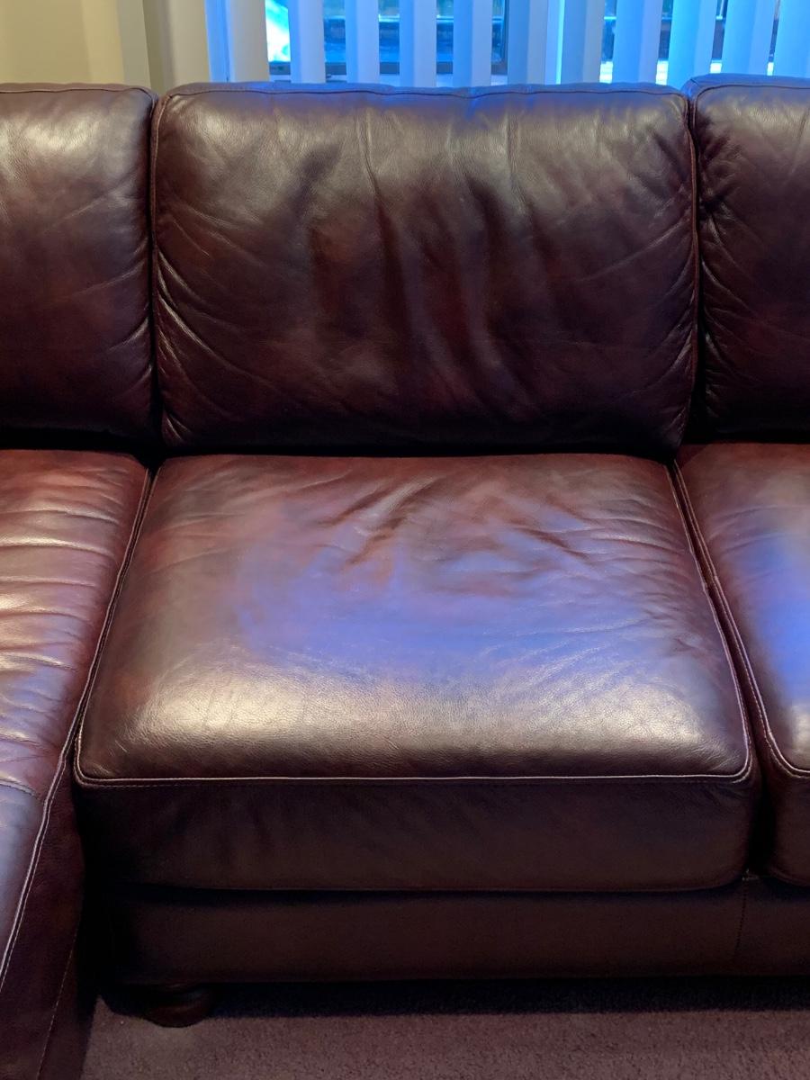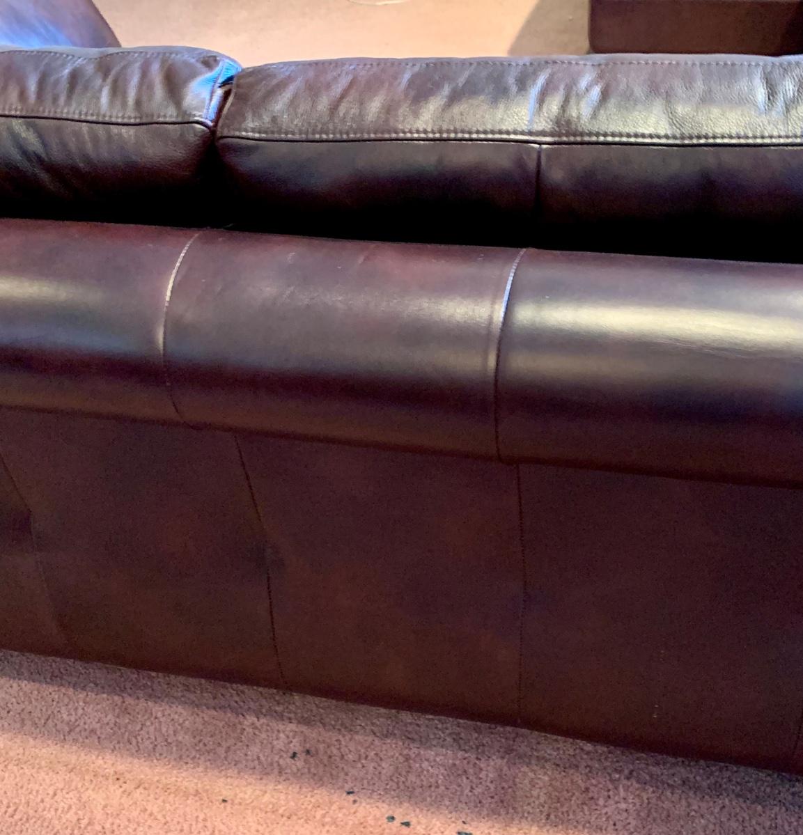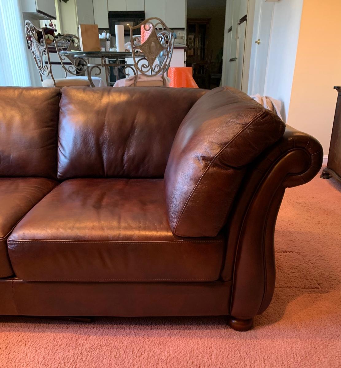 This leather sectional is beautiful, comfortable and in remarkable condition. It is a large piece of furniture with outstanding craftsmanship. Seat cushions are strapped into place and the back pillows zipper. The back of the sofa is fashioned in curved/tufted pattern (please see pictures).