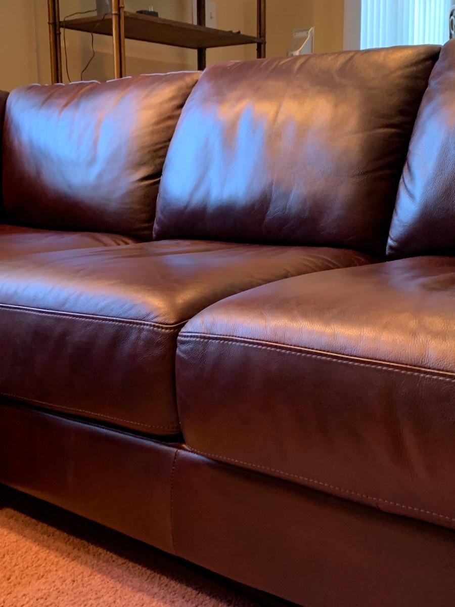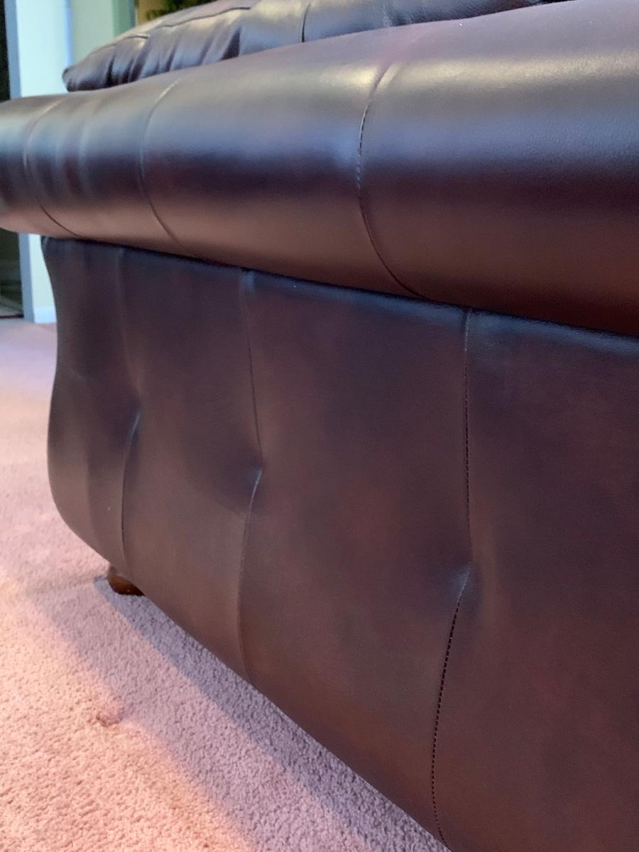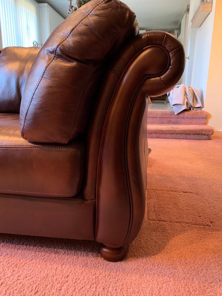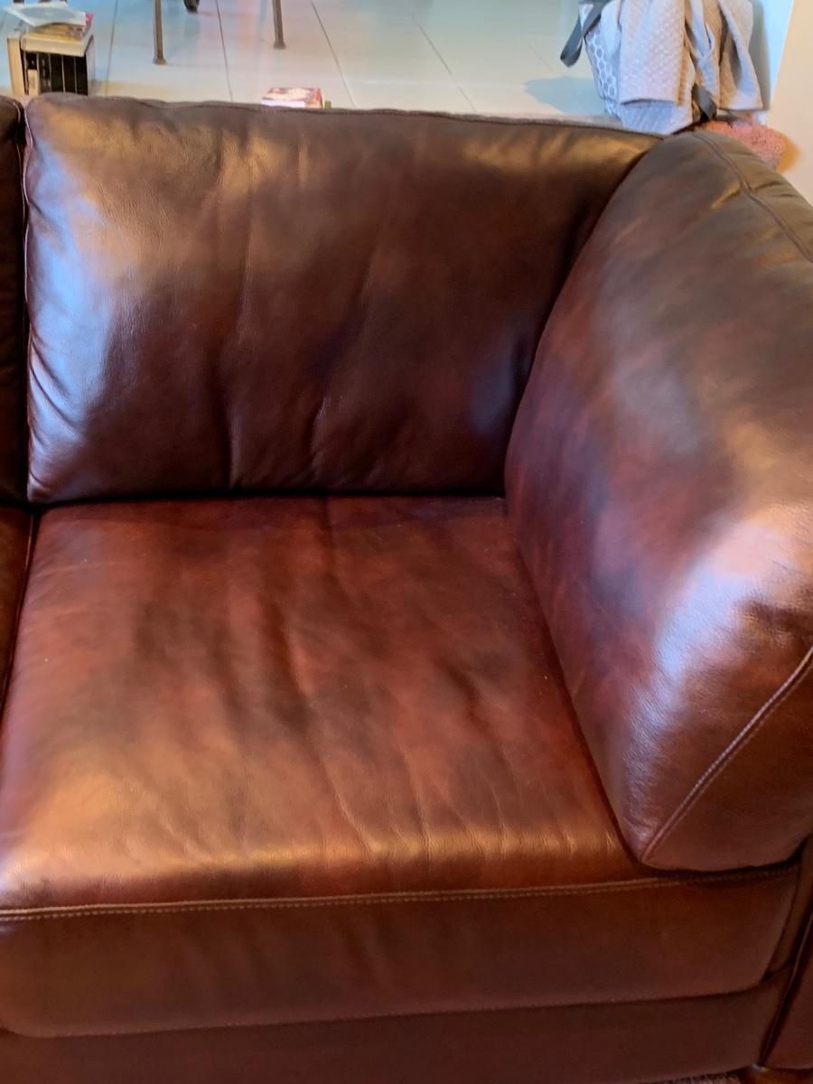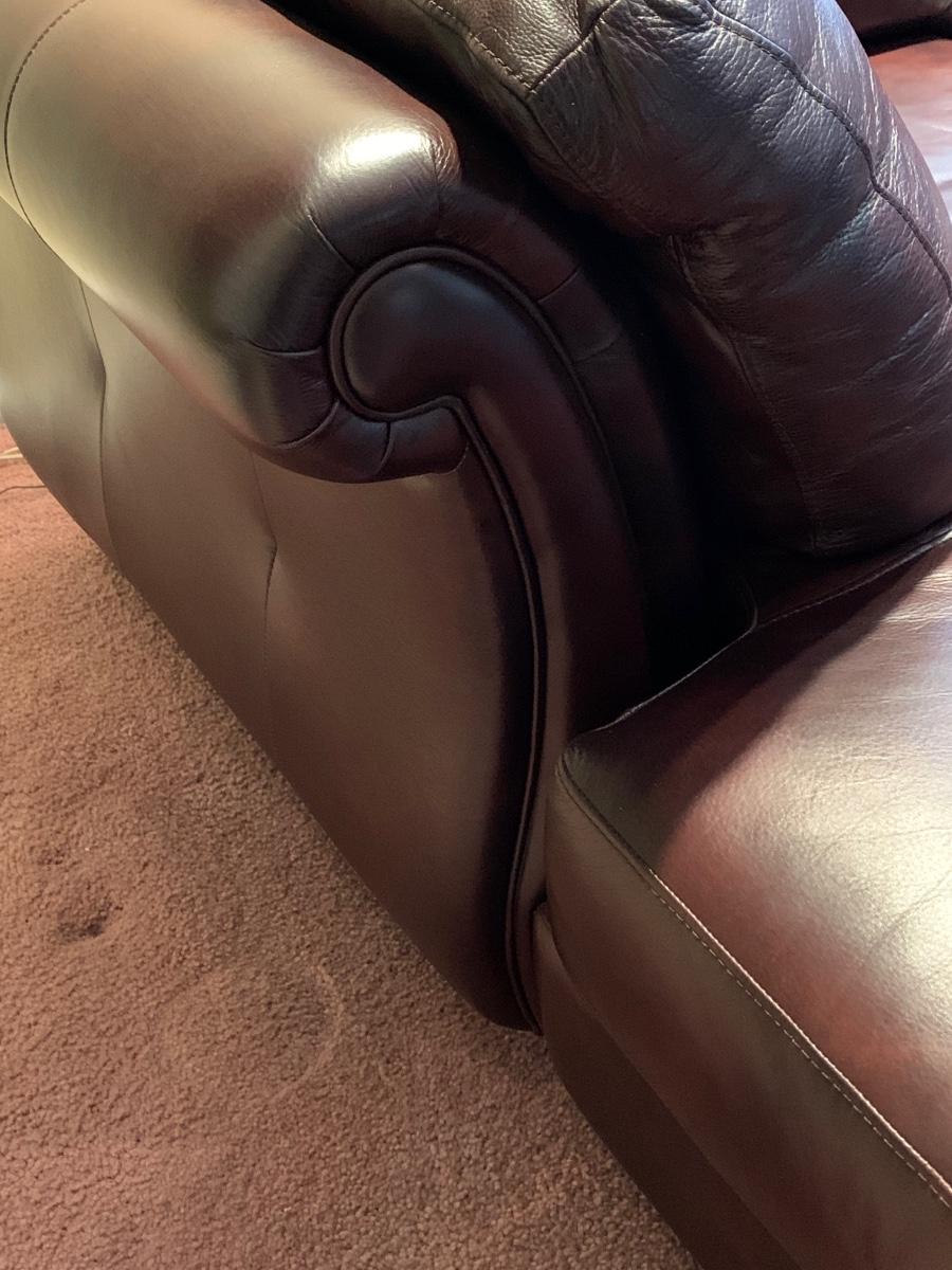 This leather sectional is beautiful, comfortable and in remarkable condition. It is a large piece of furniture with outstanding craftsmanship. Seat cushions are strapped into place and the back pillows zipper. The back of the sofa is fashioned in curved/tufted pattern (please see pictures).