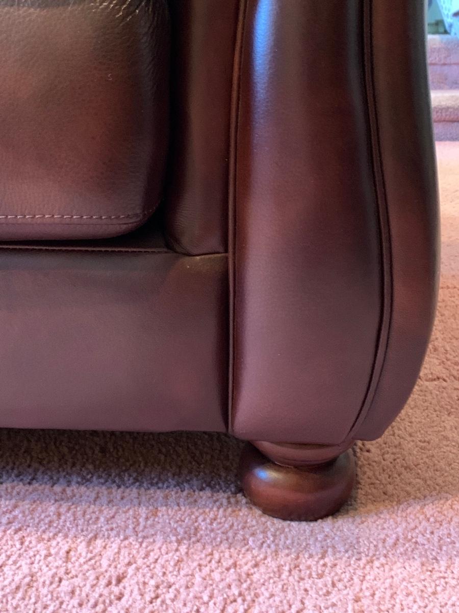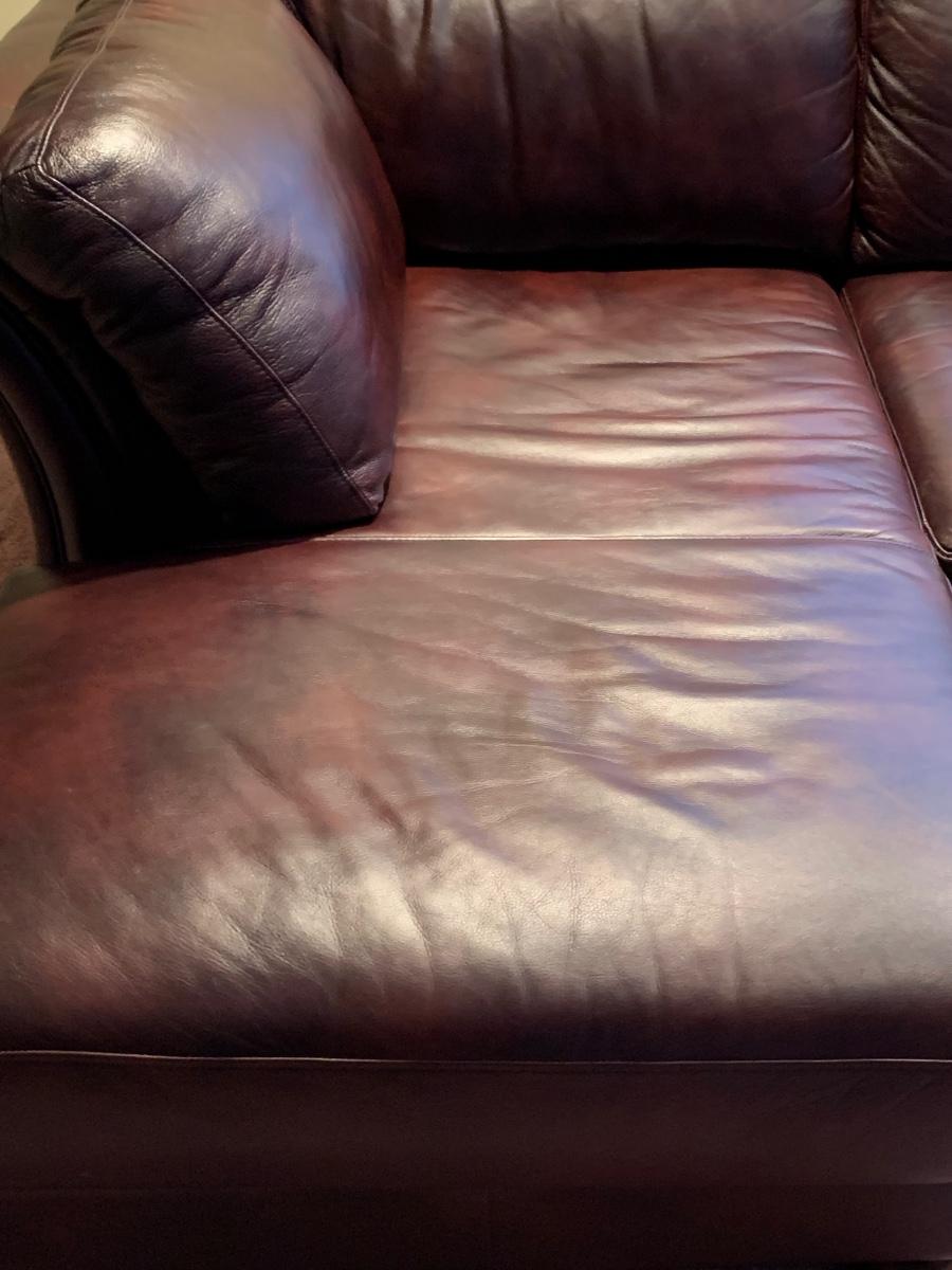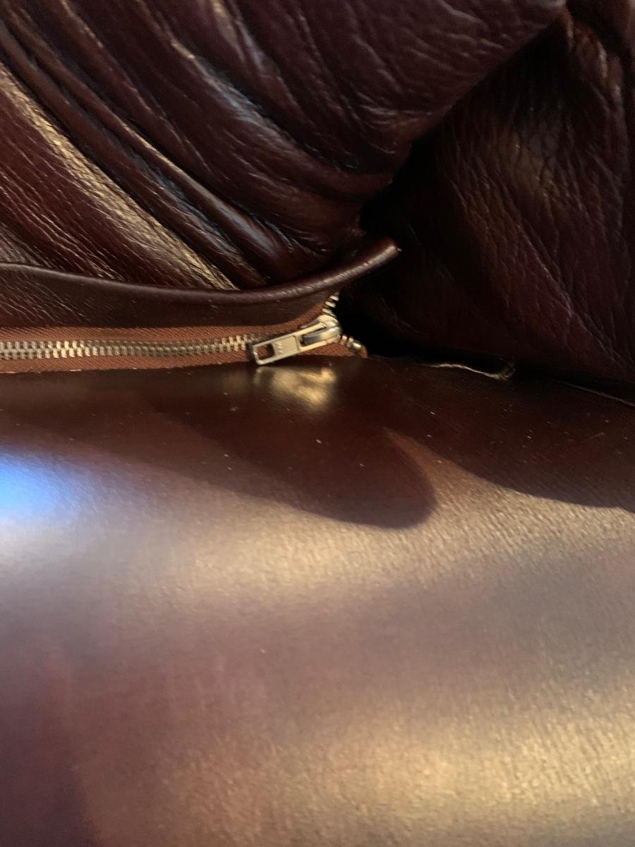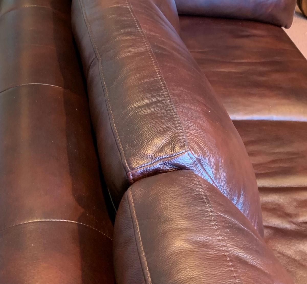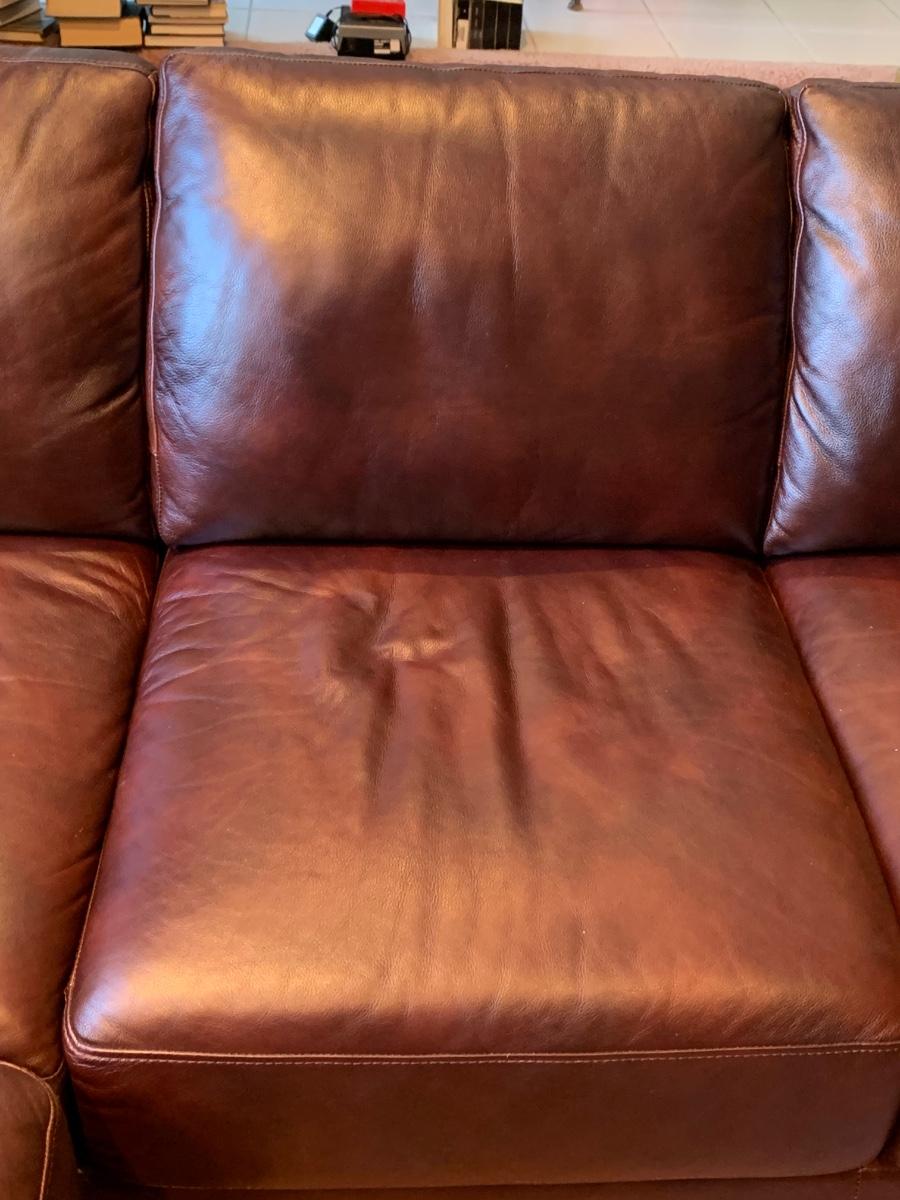 This leather sectional is beautiful, comfortable and in remarkable condition. It is a large piece of furniture with outstanding craftsmanship. Seat cushions are strapped into place and the back pillows zipper. The back of the sofa is fashioned in curved/tufted pattern (please see pictures).