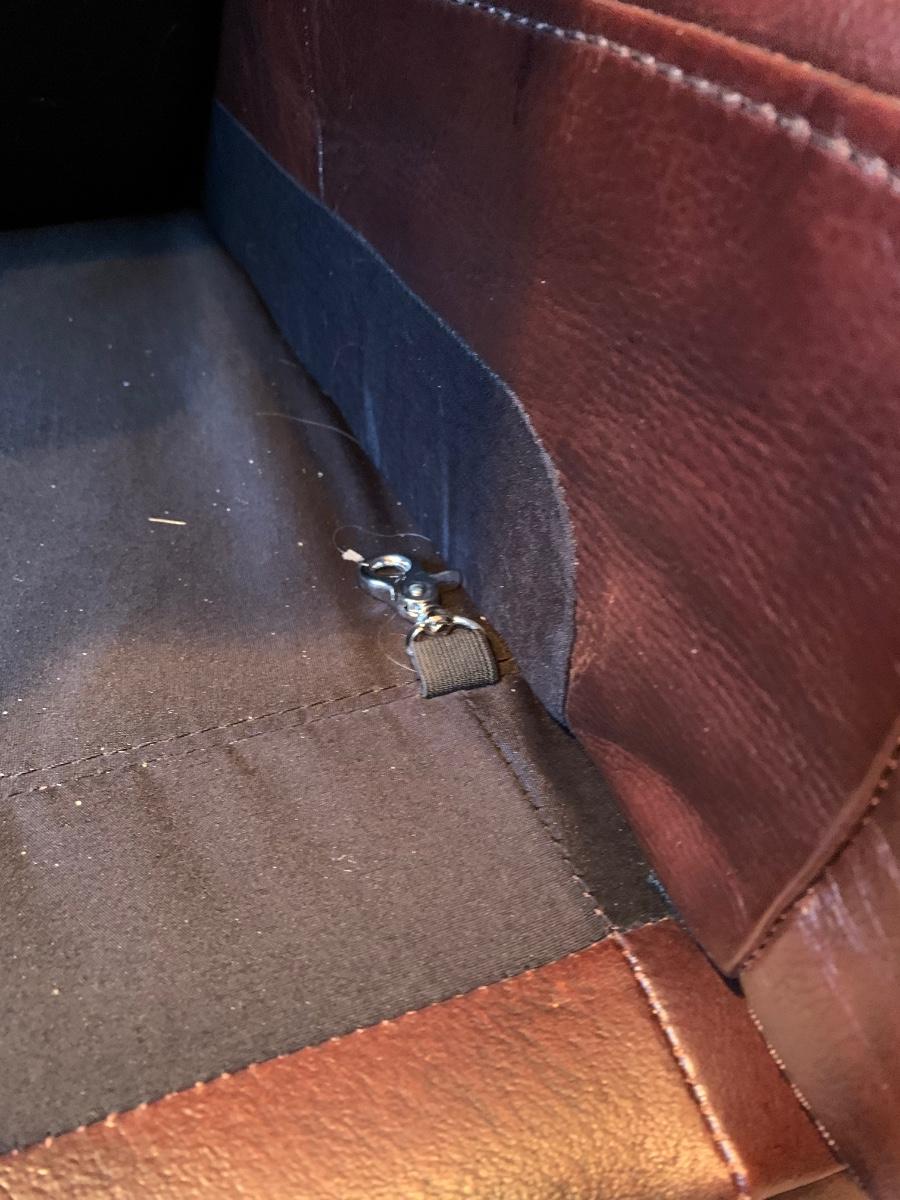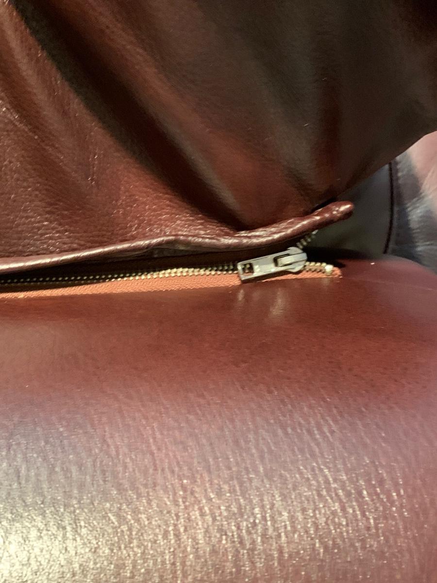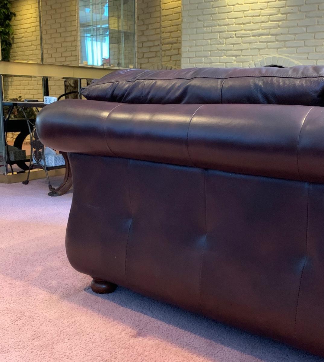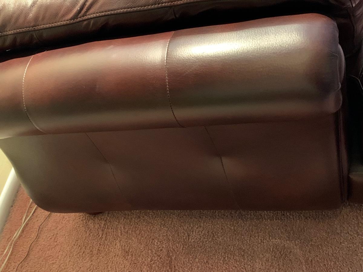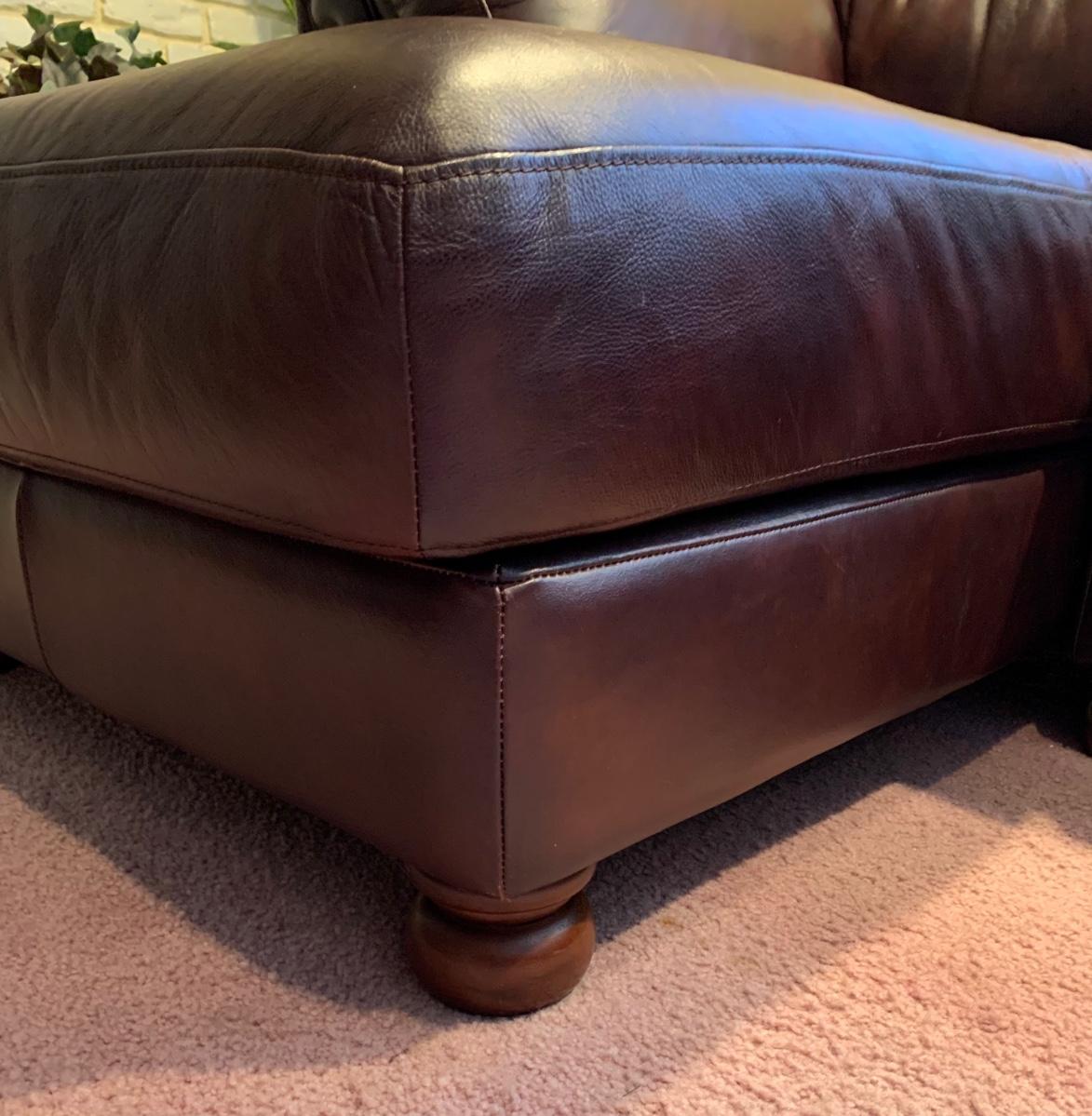 This leather sectional is beautiful, comfortable and in remarkable condition. It is a large piece of furniture with outstanding craftsmanship. Seat cushions are strapped into place and the back pillows zipper. The back of the sofa is fashioned in curved/tufted pattern (please see pictures).