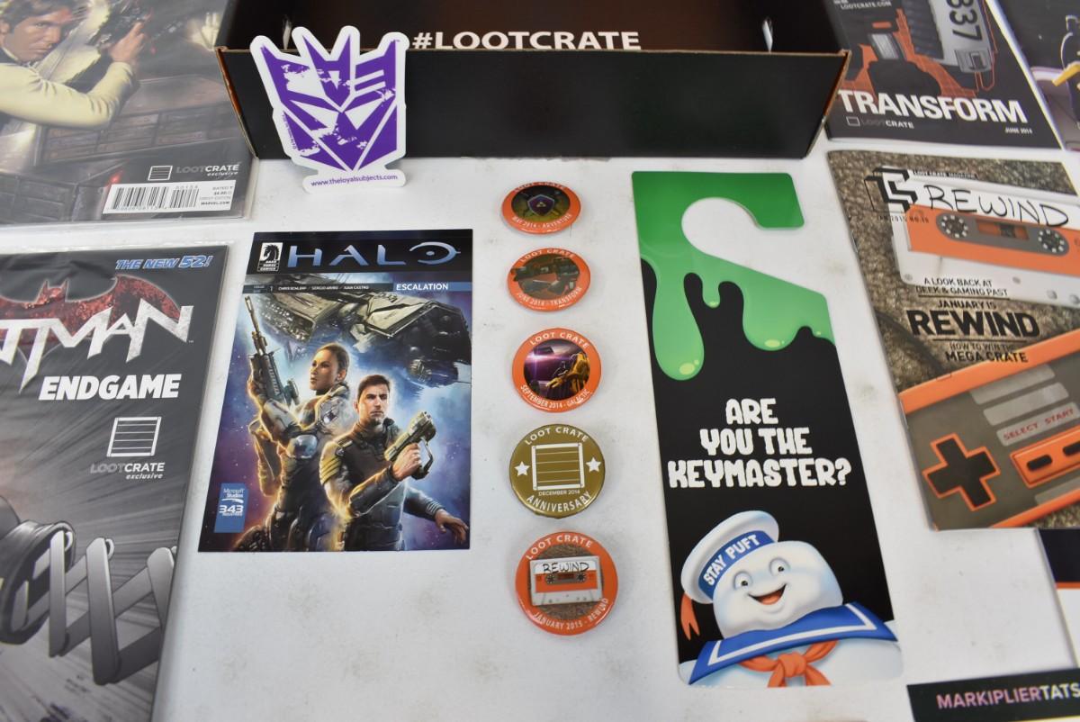 Loot Crate Collection with Pins from May 14, June 14 , September 14, December 14 & January 15: Pac-Man Poster, Ghostbusters Hanger, Sunglasses, Stickers