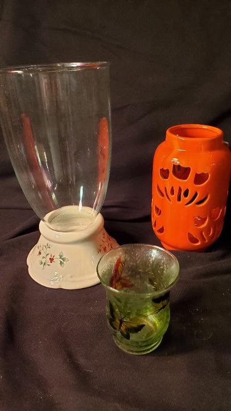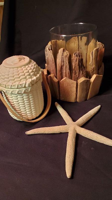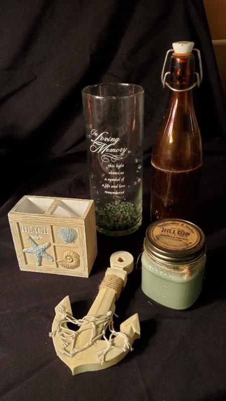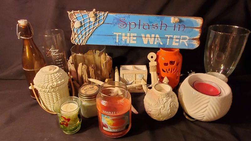 Beachy sign and decor, Yankee Candle, Party Lite, and Lenox candle holders and candles.