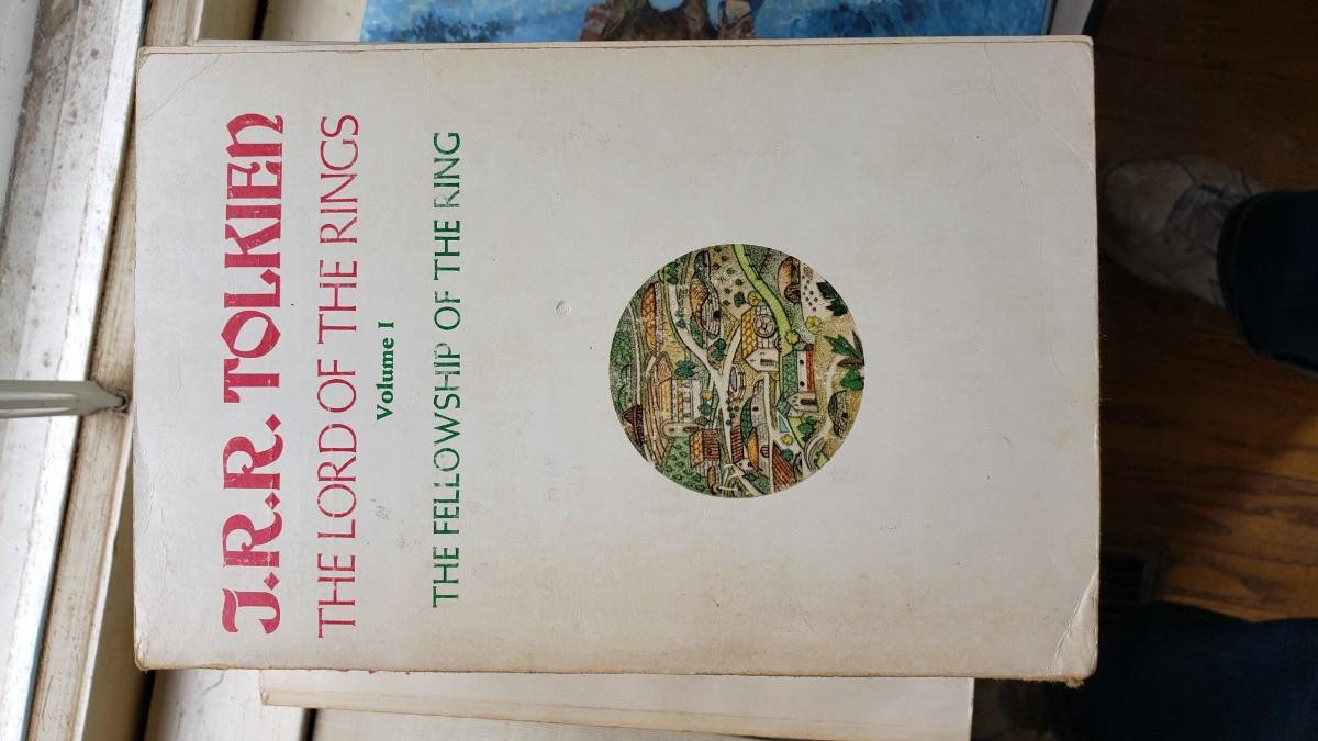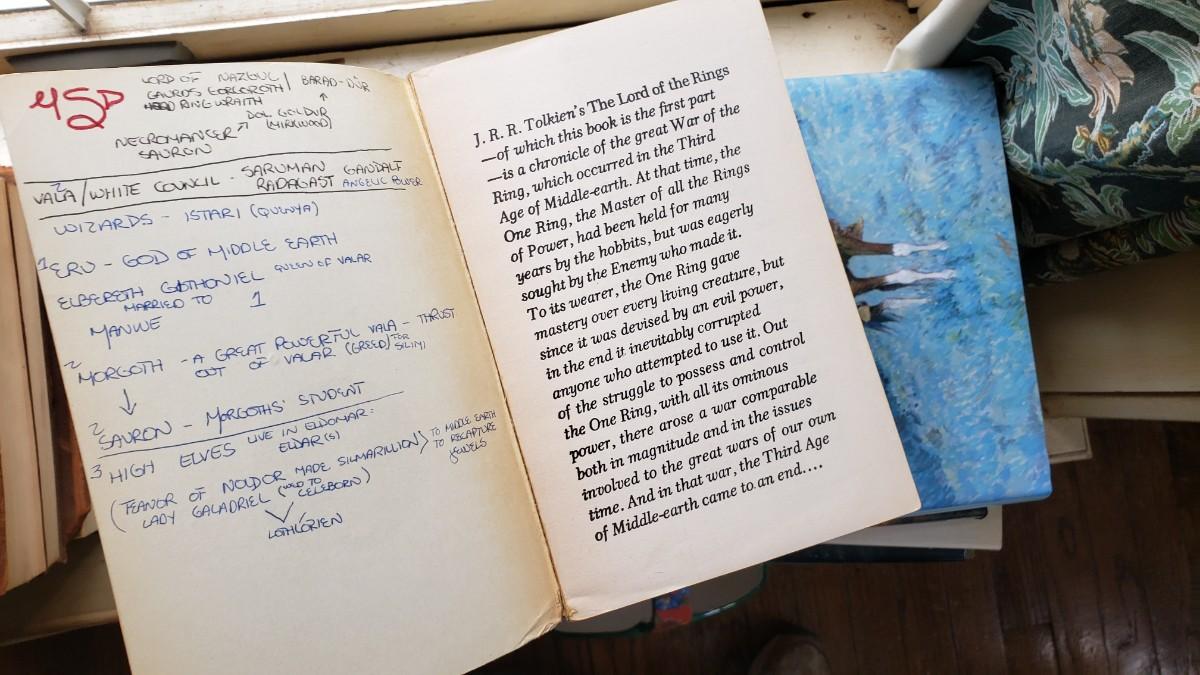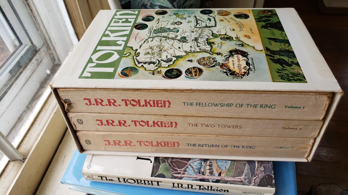 Vintage paperback Lord of the Rings and The Hobbit with some writing in the books and underlining