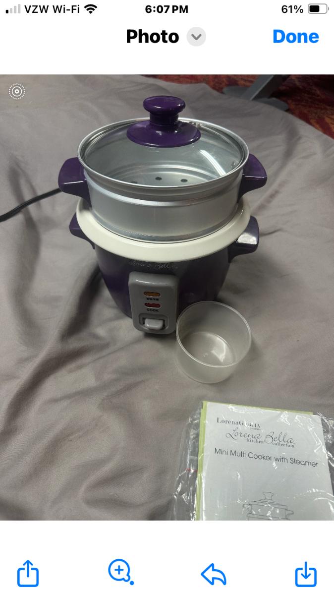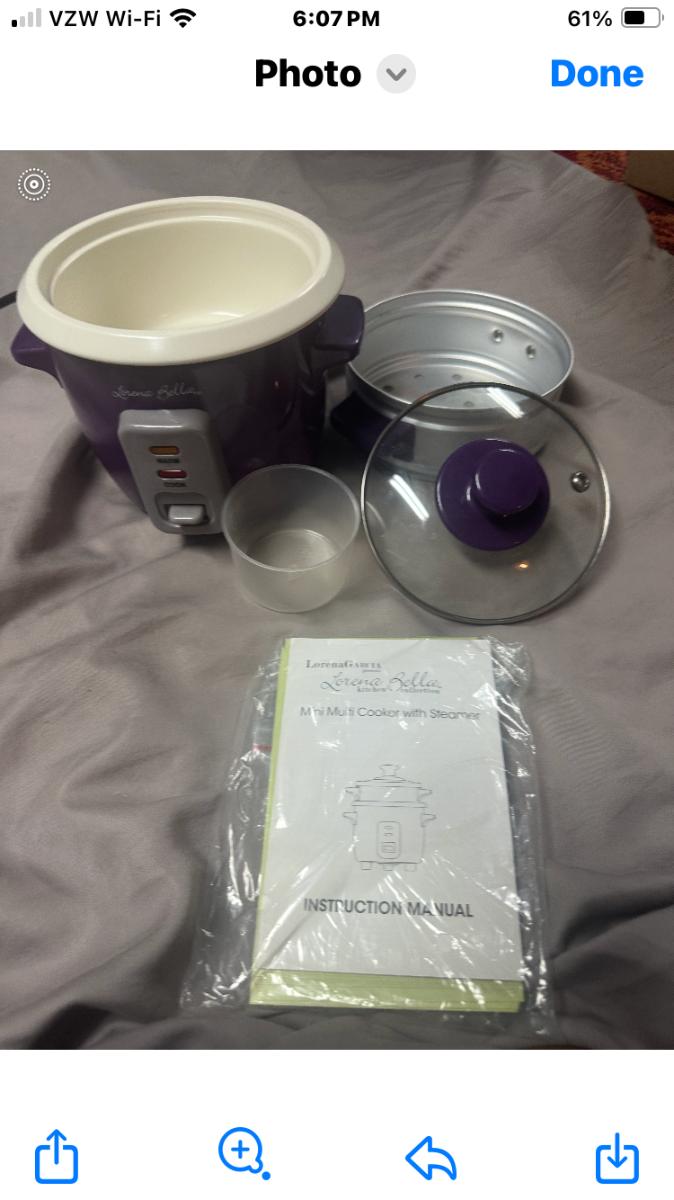 This is a Lorena Garcia "Lorena Bella" Mini Multi Cooker and Steamer, a compact one-touch electric rice cooker/multi-cooker originally sold through HSN in the mid-2010s. It features a small capacity (approximately 4 cups cooked rice / 2 cups uncooked), ceramic nonstick inner pot, vented glass lid, included steamer basket for vegetables/seafood, simple cook/warm switch, measuring cup, and automatic keep-warm function. The vibrant purple exterior with matching handles adds a fun pop of color. Your photo shows it in excellent barely-used condition, complete with the steamer tray, measuring cup, and original packaging/manual insert.