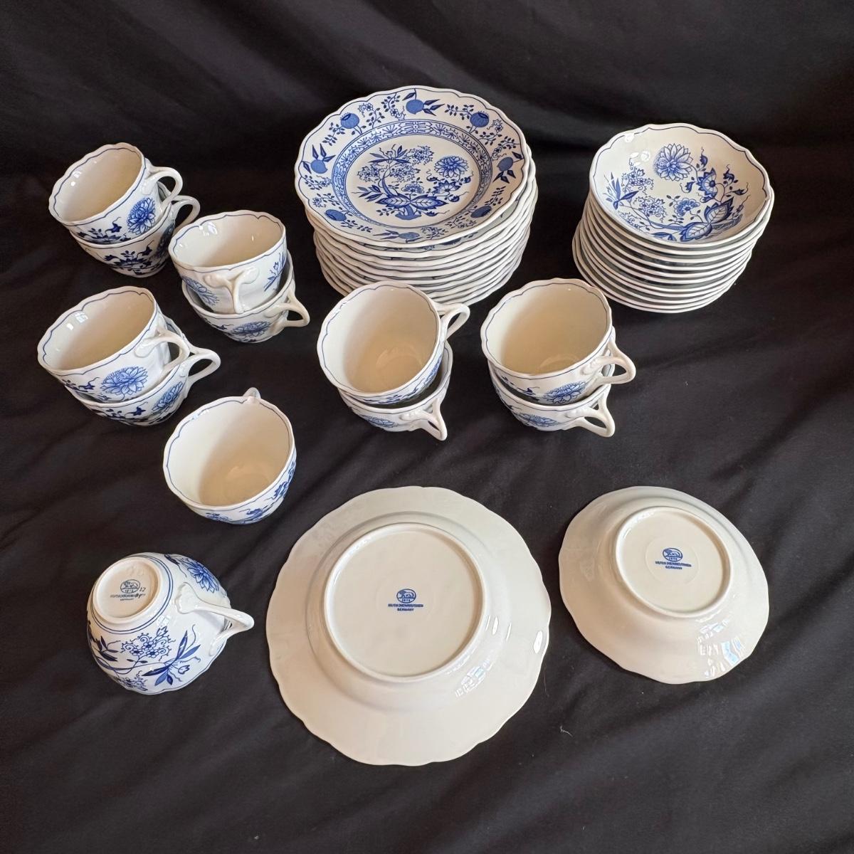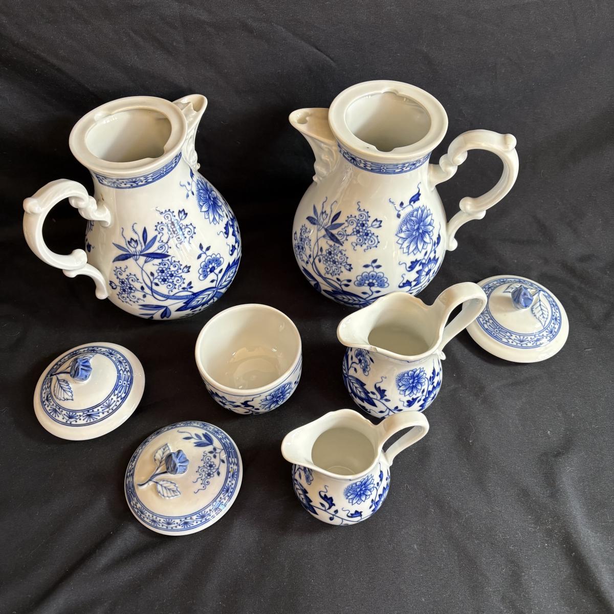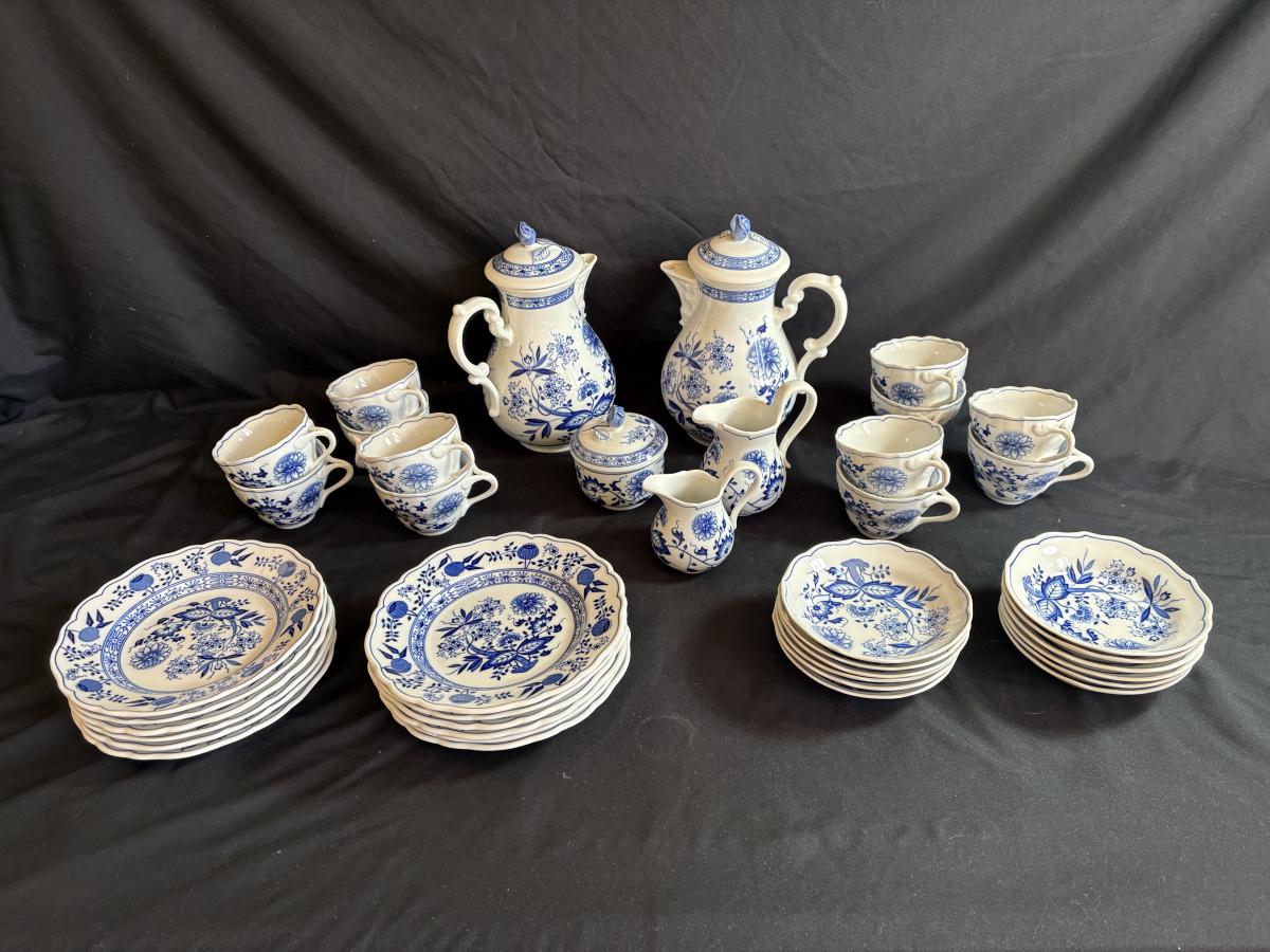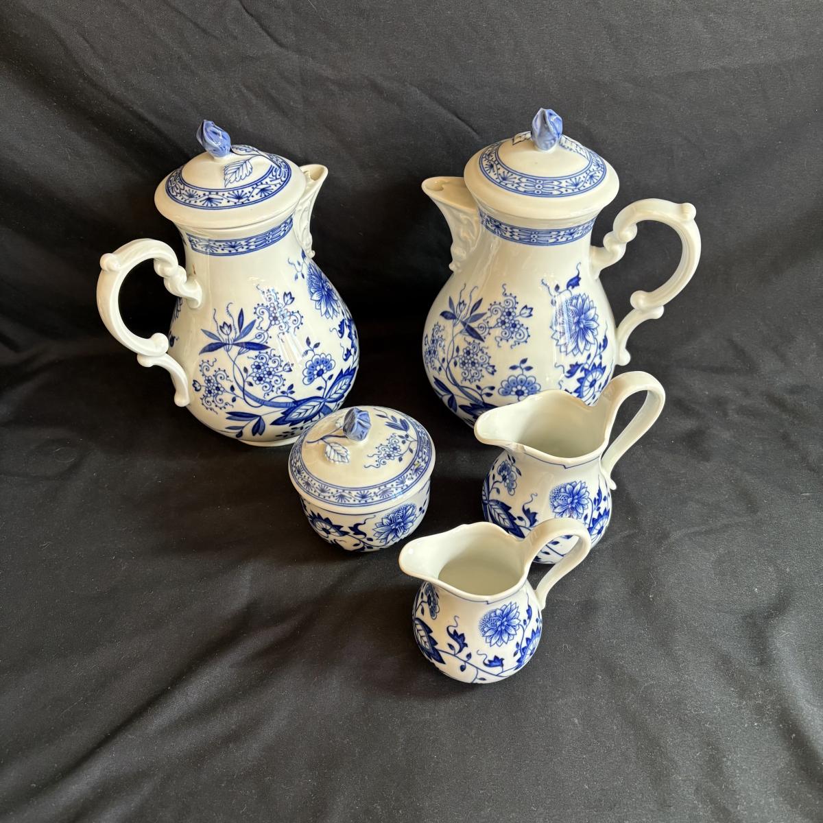 ‘Blue Onion’ pattern porcelain tea service by Lorenz Hutschenreuther. Two teapots are 7.5”H (10” w/lid). 12 3.5” teacups and 12 5.5” saucers. 12 7.5” dessert/sandwich plates, covered sugar bowl (3.25” x 2.25”H, 4.25”H w-lid.) Large and small creamers. Larger one has a small chip. Small chips on two of the saucers and one teacup.