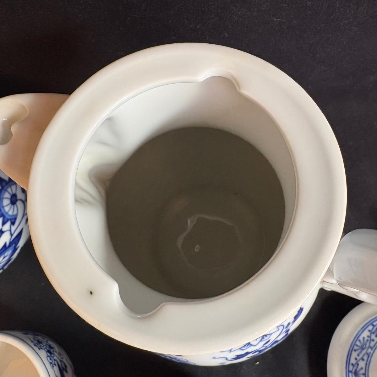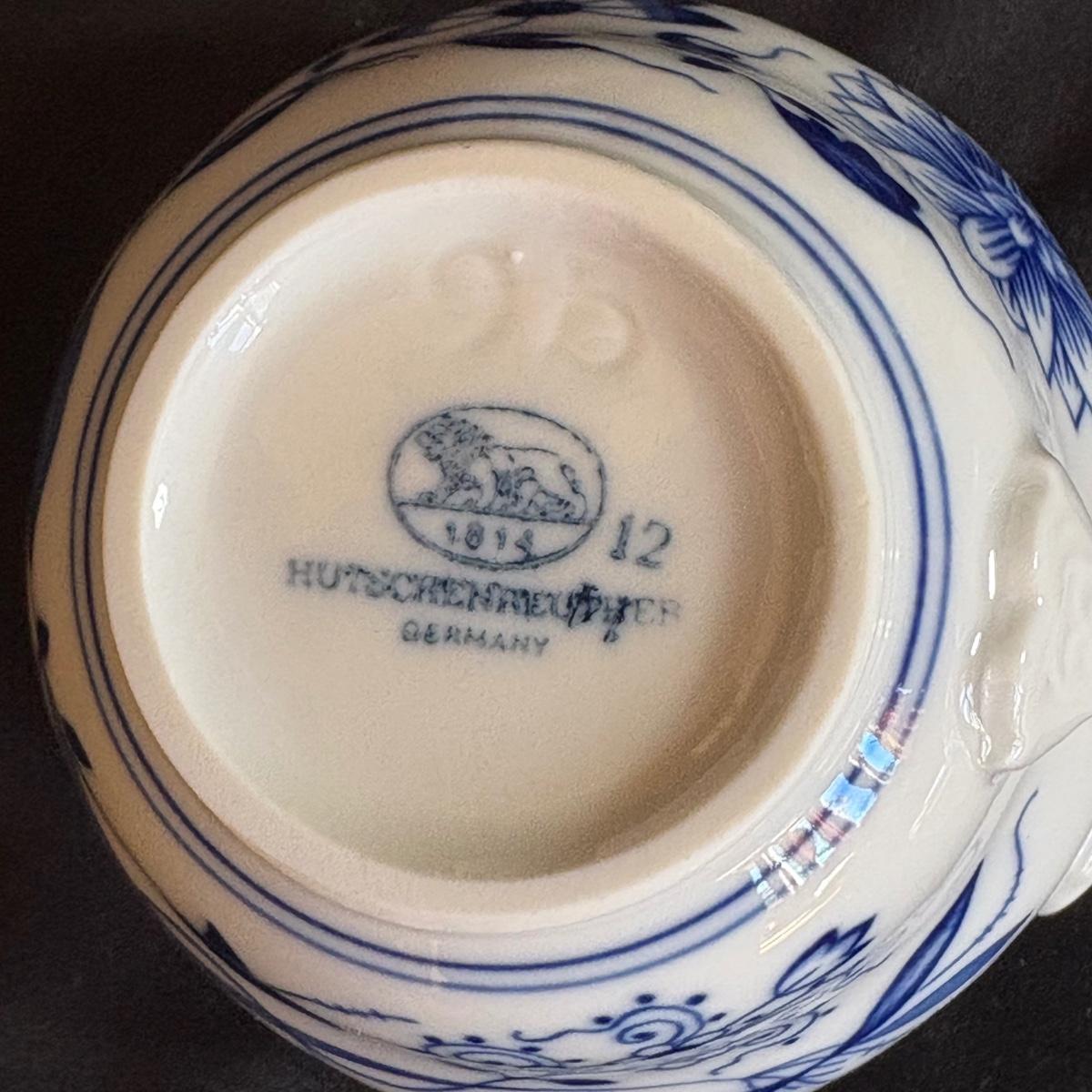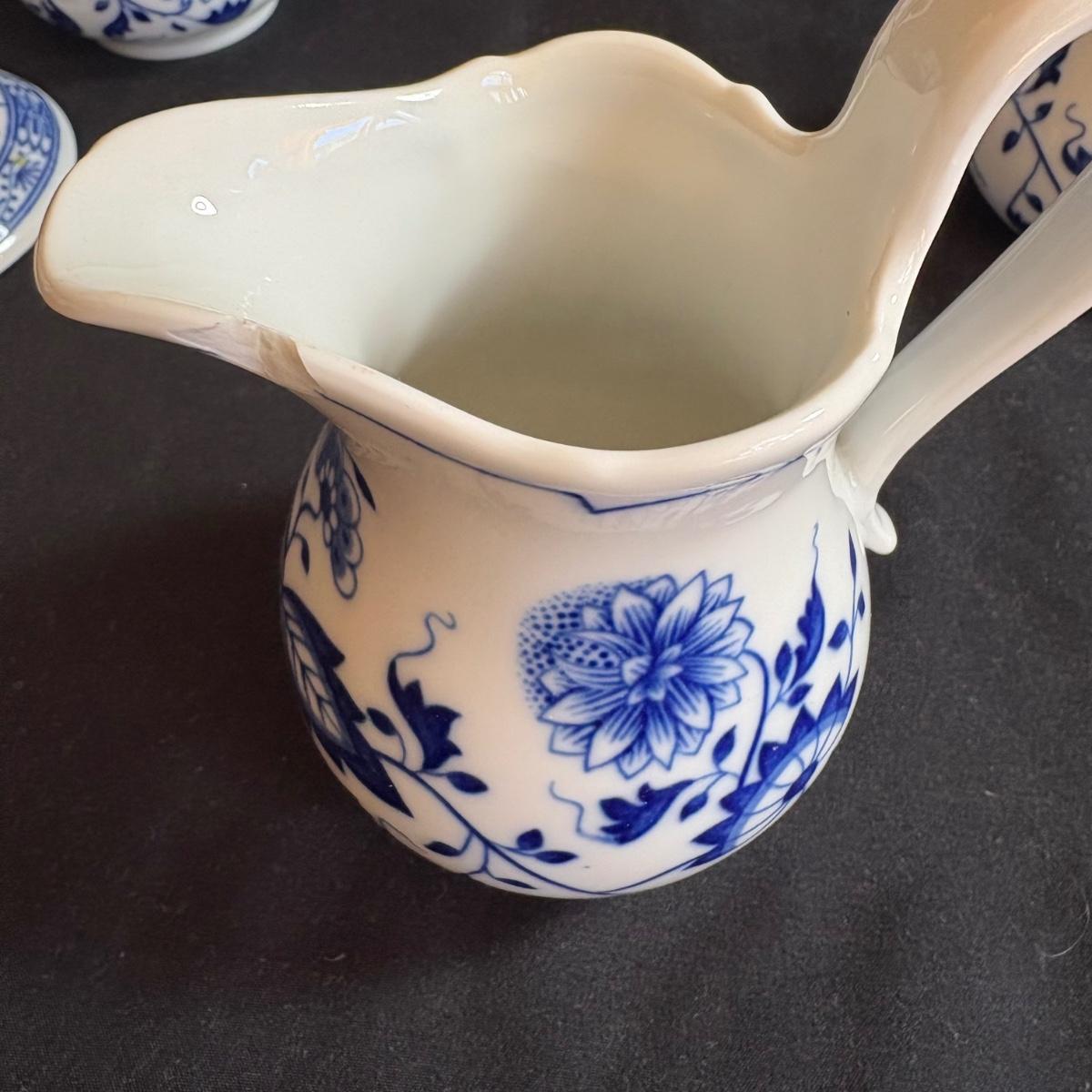 ‘Blue Onion’ pattern porcelain tea service by Lorenz Hutschenreuther. Two teapots are 7.5”H (10” w/lid). 12 3.5” teacups and 12 5.5” saucers. 12 7.5” dessert/sandwich plates, covered sugar bowl (3.25” x 2.25”H, 4.25”H w-lid.) Large and small creamers. Larger one has a small chip. Small chips on two of the saucers and one teacup.