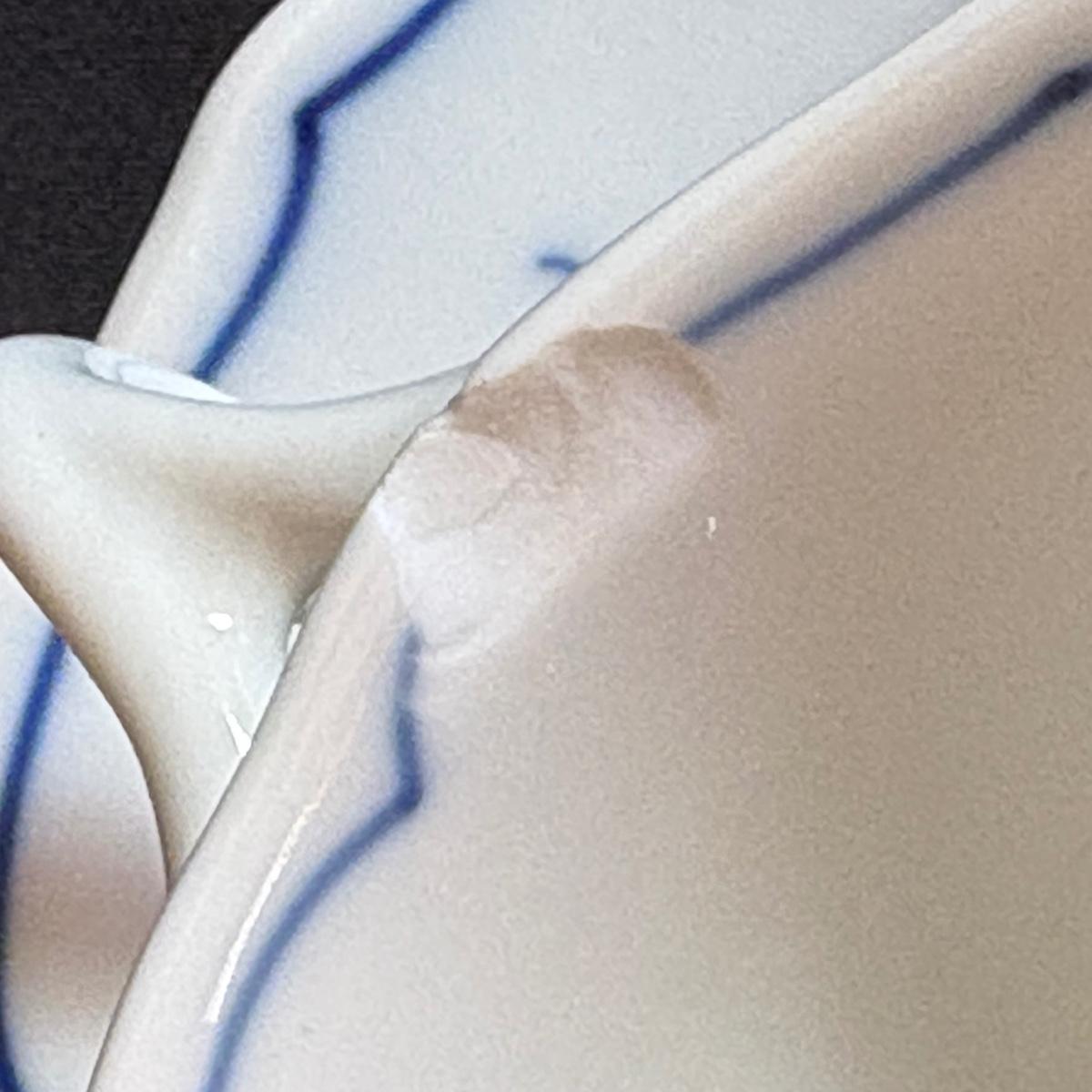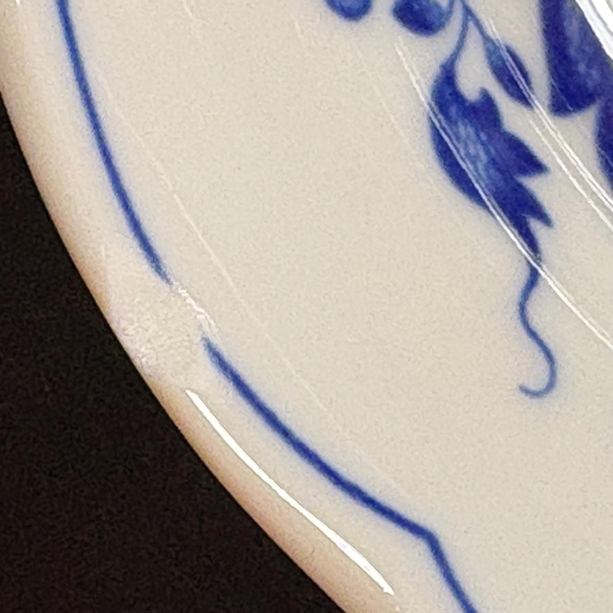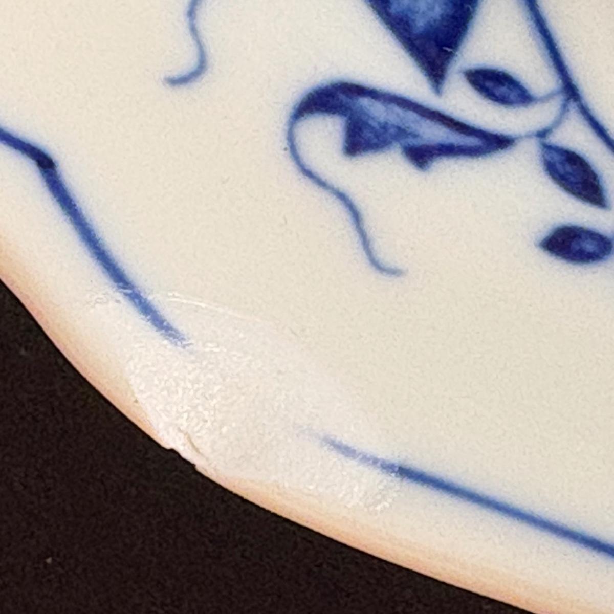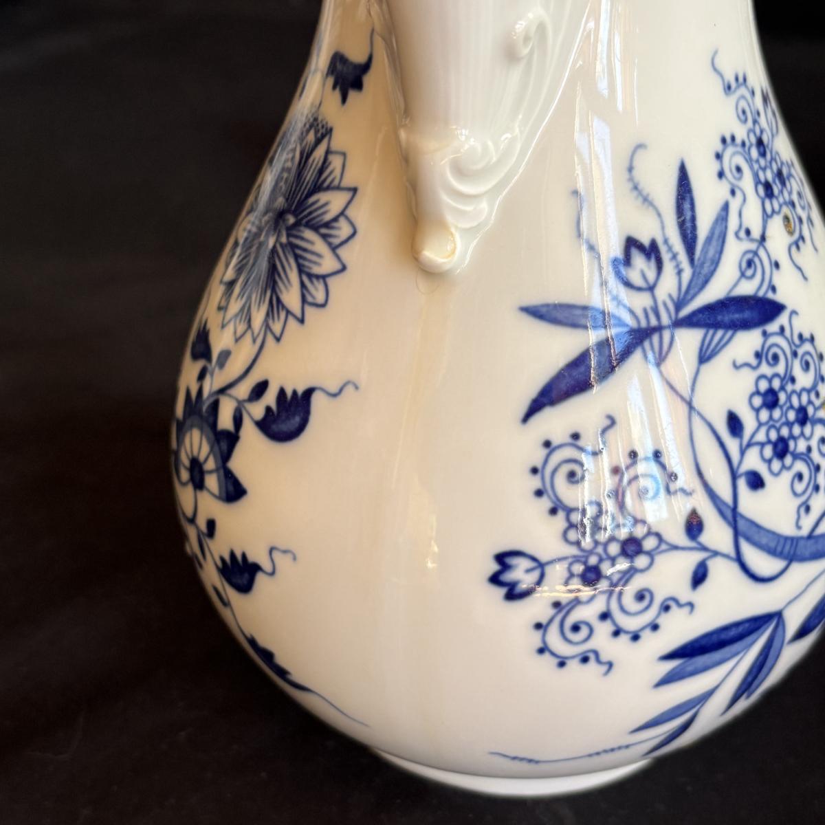‘Blue Onion’ pattern porcelain tea service by Lorenz Hutschenreuther. Two teapots are 7.5”H (10” w/lid). 12 3.5” teacups and 12 5.5” saucers. 12 7.5” dessert/sandwich plates, covered sugar bowl (3.25” x 2.25”H, 4.25”H w-lid.) Large and small creamers. Larger one has a small chip. Small chips on two of the saucers and one teacup.