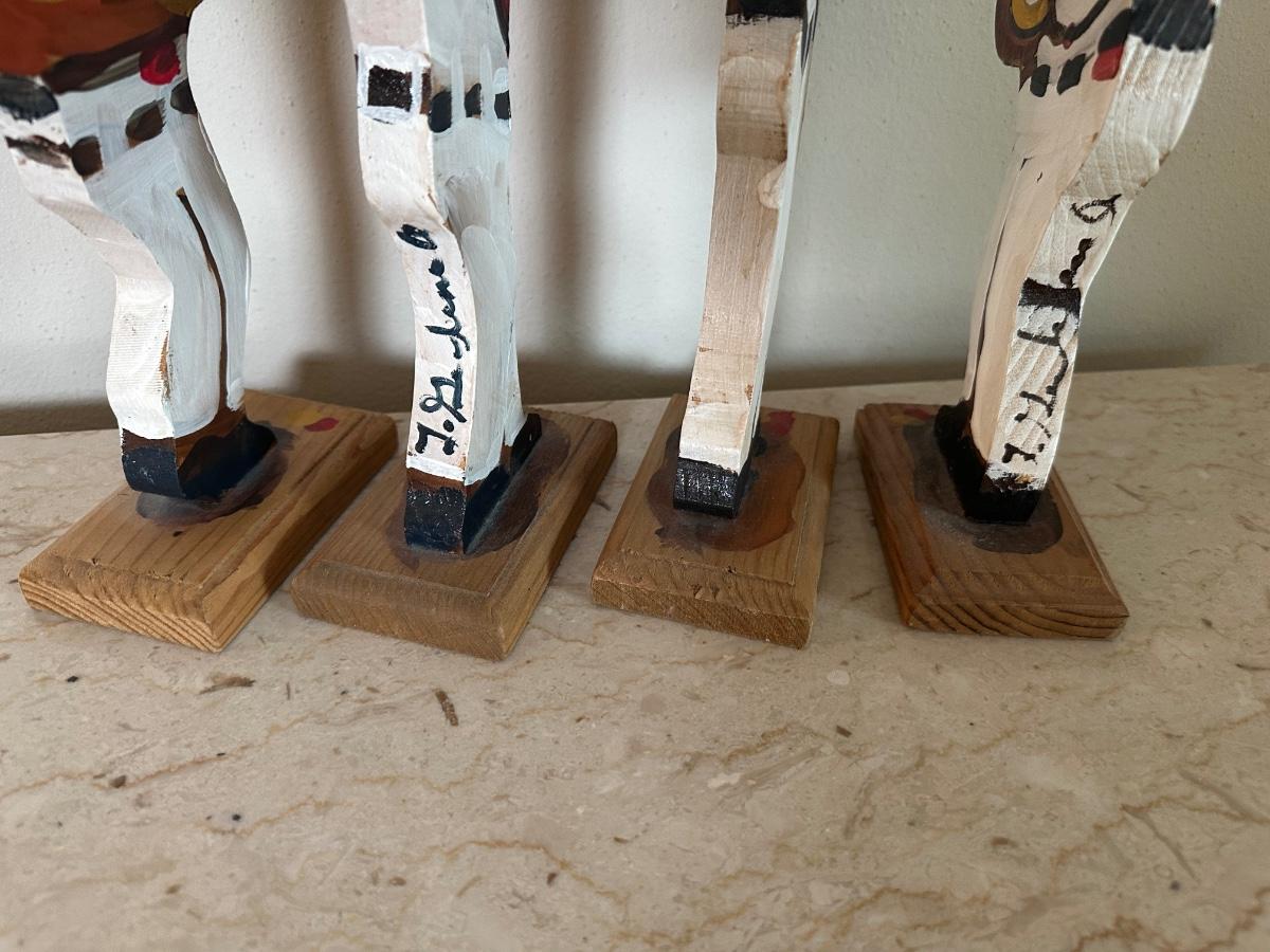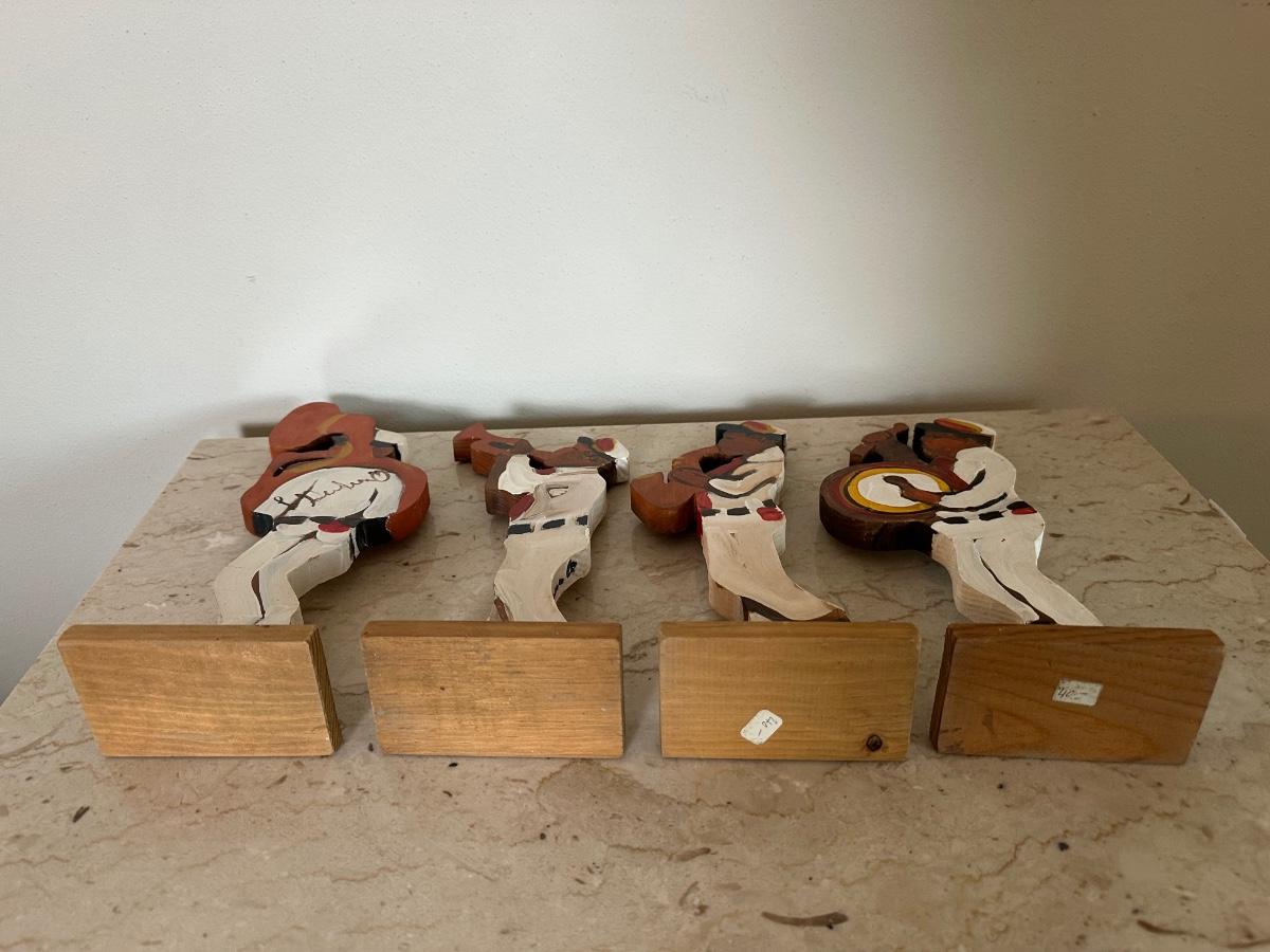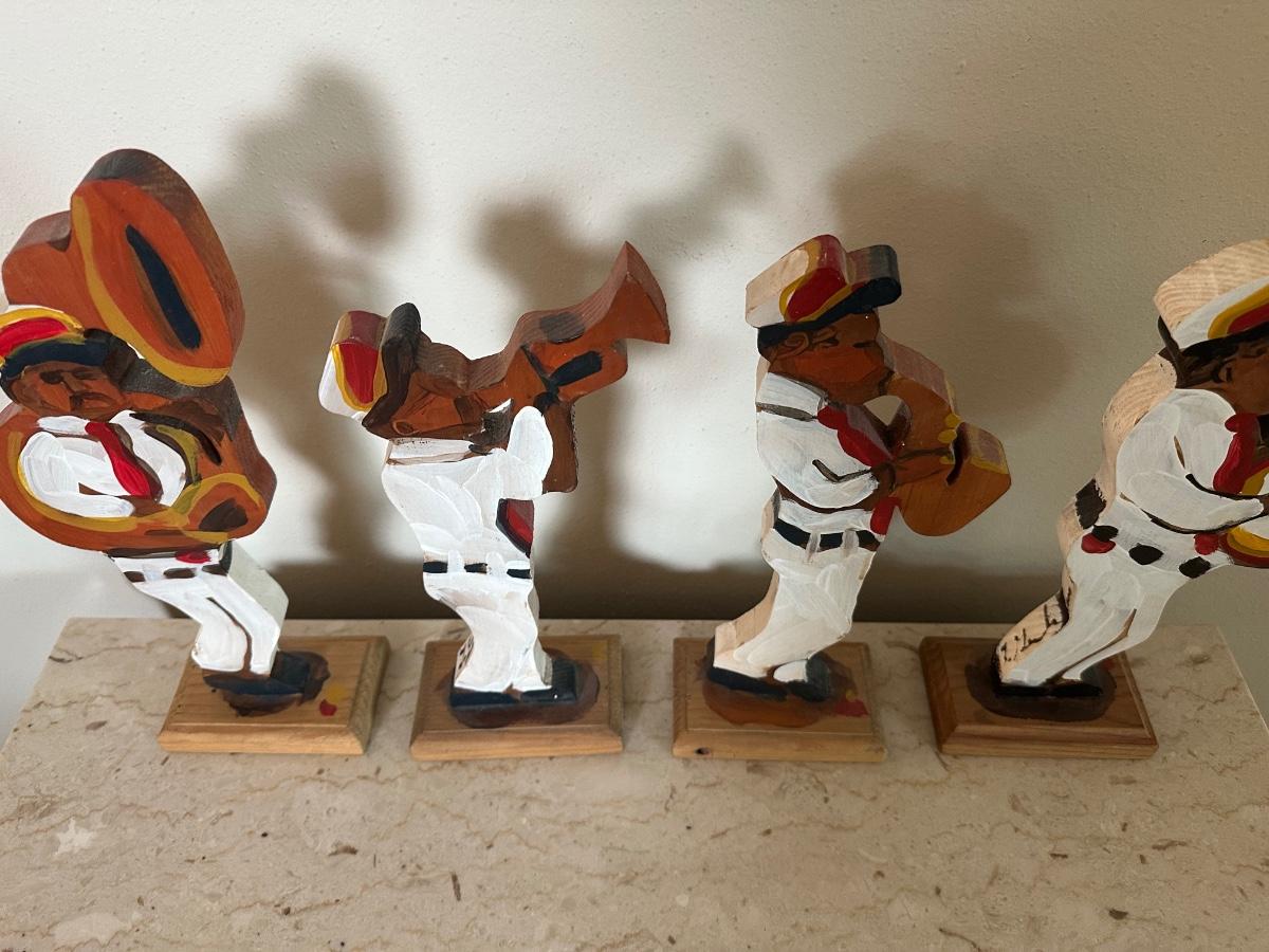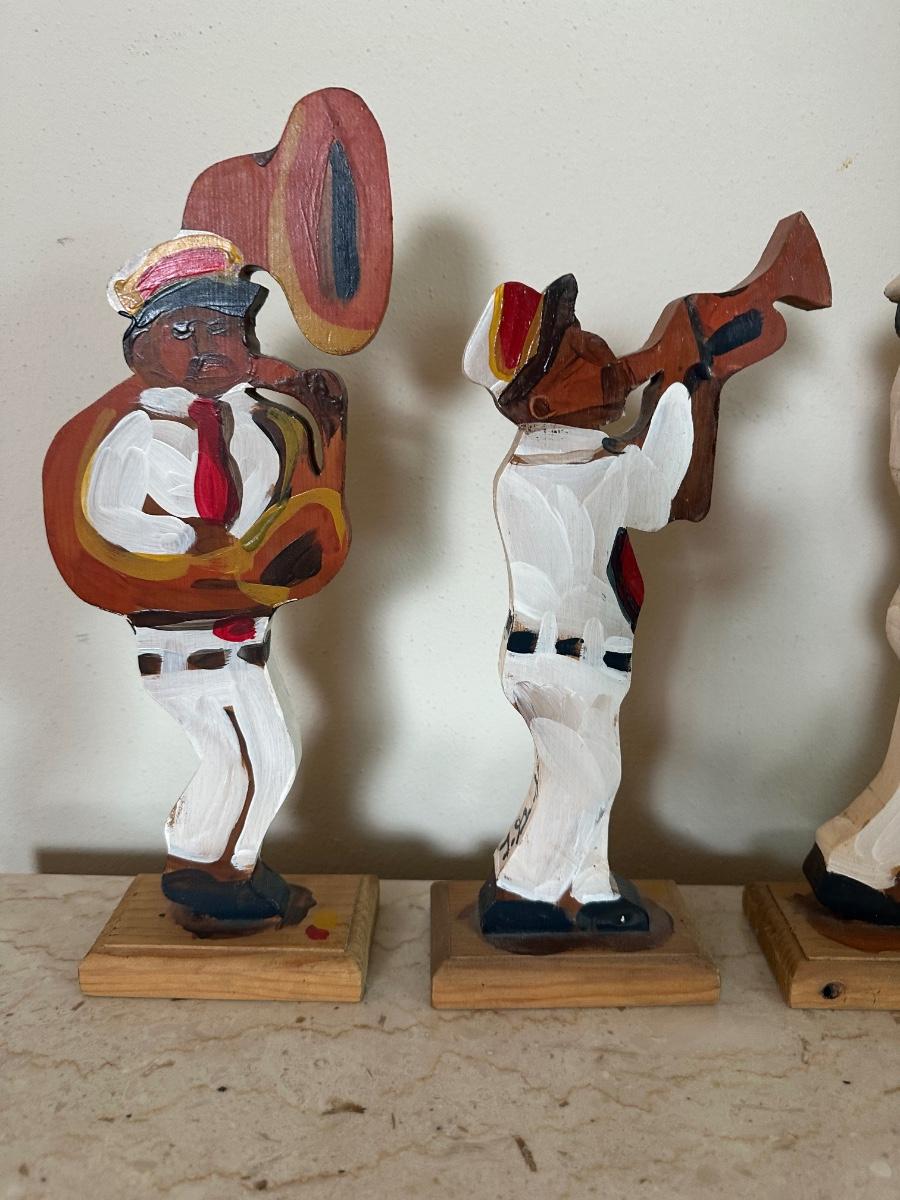 Set of four hand-carved and hand-painted wooden jazz musicians by Louisiana folk artist Lorraine Gendron. Signed on the sides of the legs.