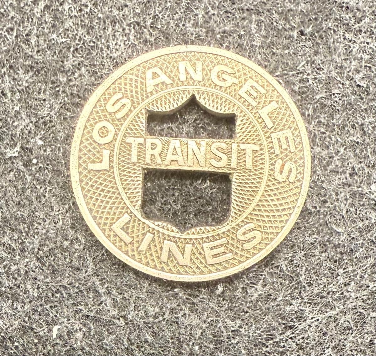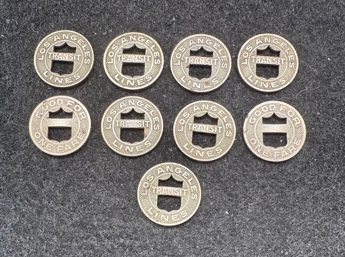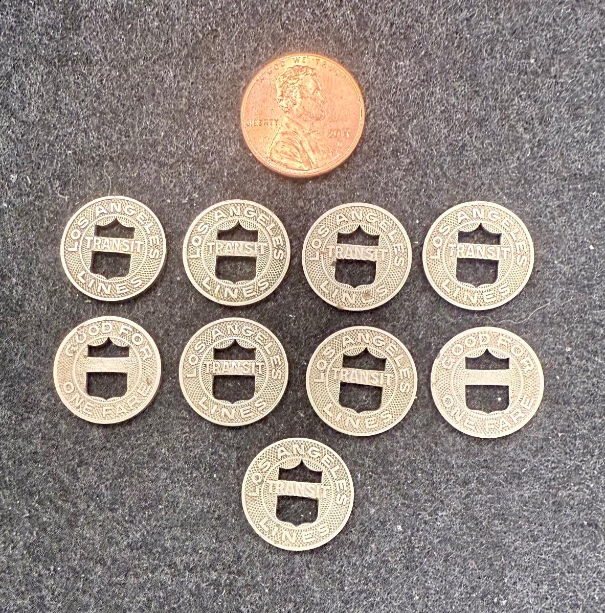 Lot of 9 transit tokens. Slightly smaller than a US dime. Rare, in very good condition. The Los Angeles Transit Lines ran from 1944 until about 1963, using rail cars which were fully replaced by busses at that time. These tokens are likely from the mid 1940's or 1950's.