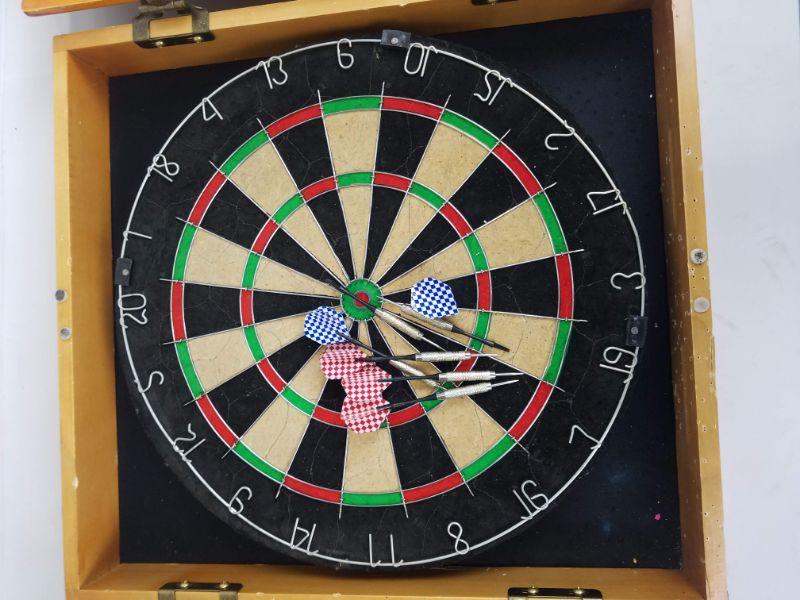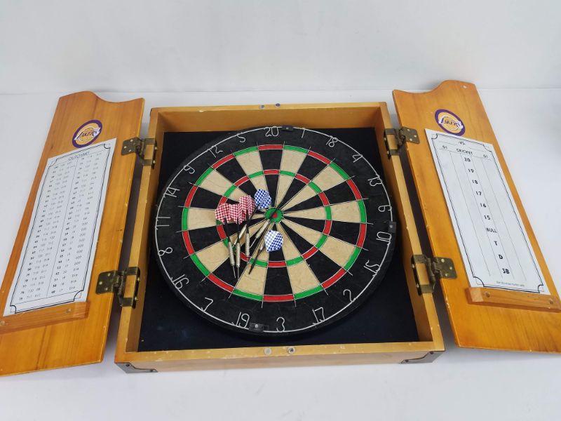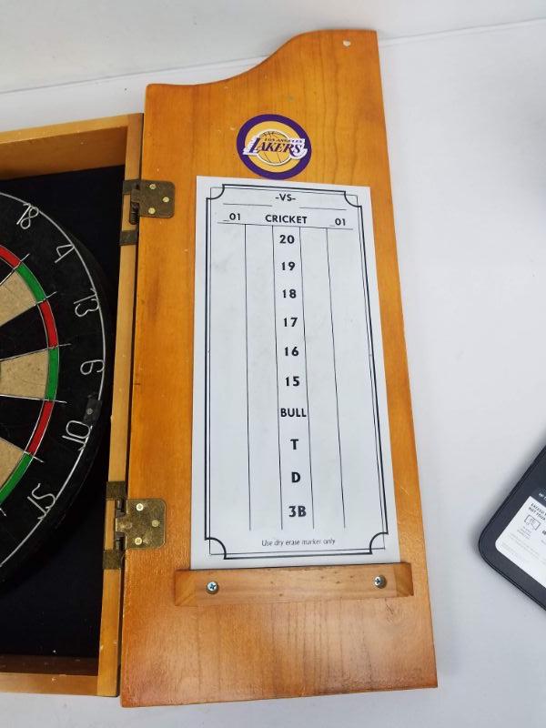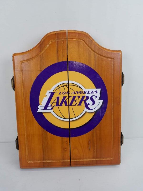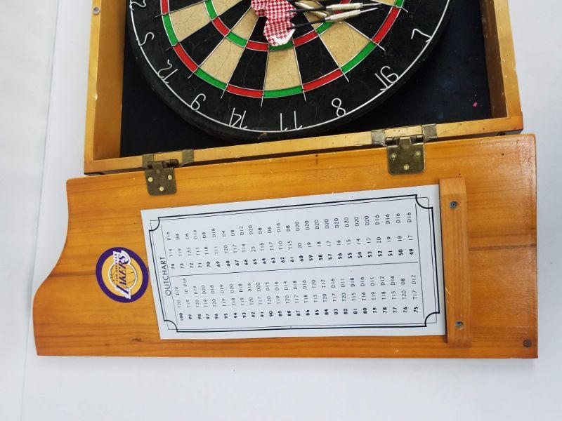 Los Angeles Lakers Dart Board Cabinet with 6 Darts. White Board Scoring