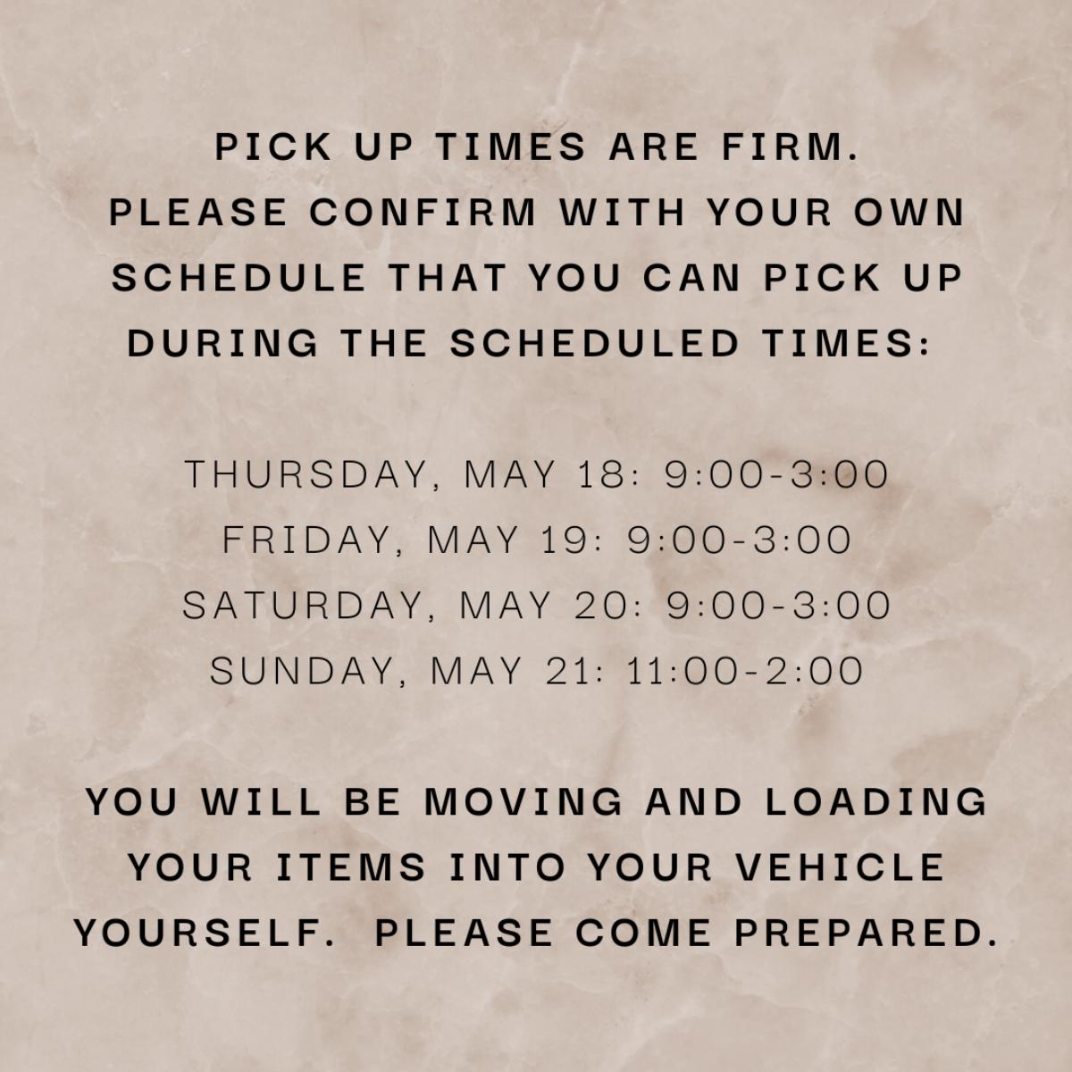 ALL ITEMS MUST BE PICKED UP IN PERSON NO LATER THAN MAY 21ST.  THERE ARE NO EXCEPTIONS.