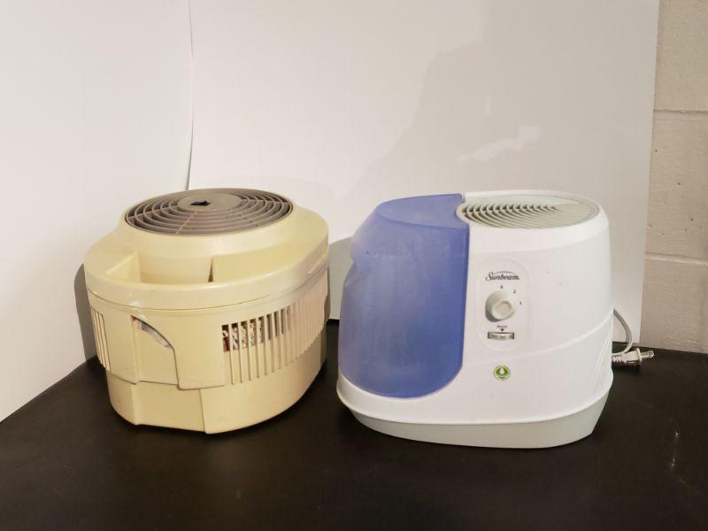 Lot of Humidifiers. Both h umidifiers are plastic and are approx 10" tall. Brands are Kaz & Sunbeam. Humidifiers power on but have not been tested beyond that.