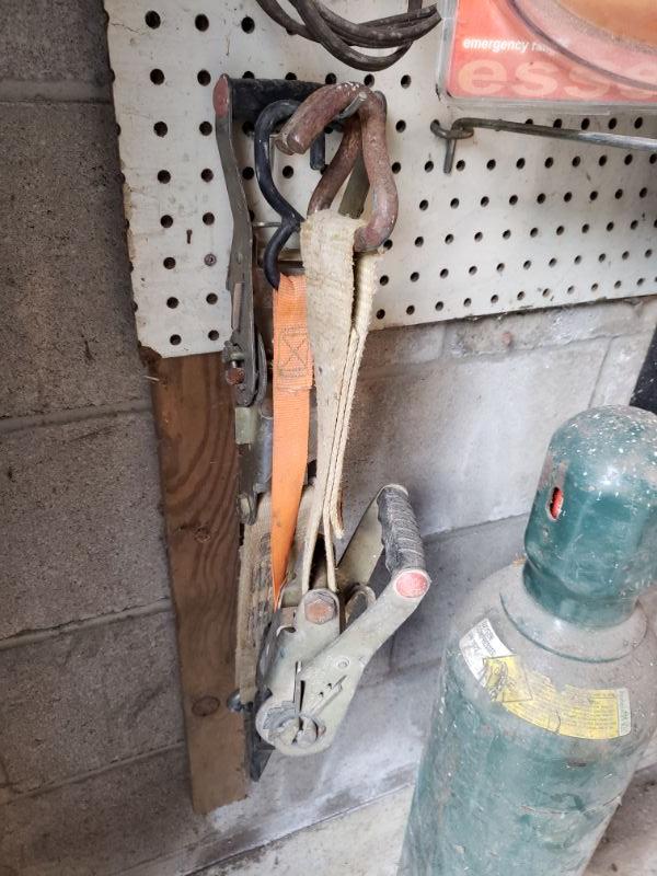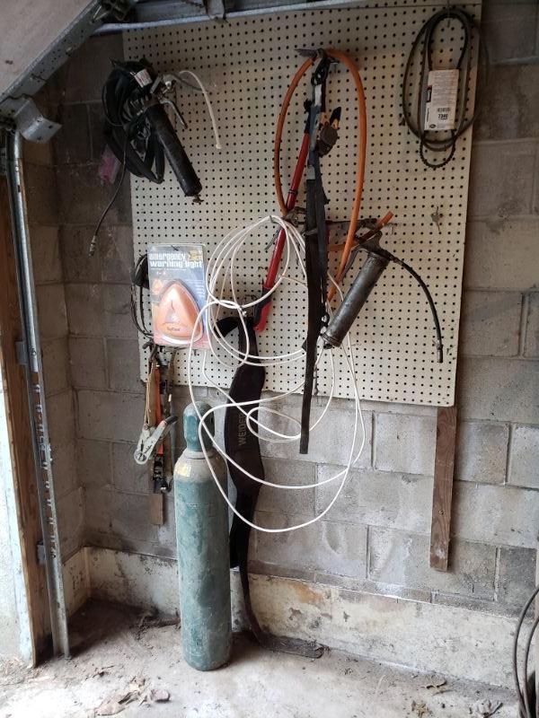 Assorted Garage Items Lot #1. Oxygen compressor, tow chains, belts, emergency lights. Approx 15 pieces in lot (weder weight belt not included) Lot #0009
