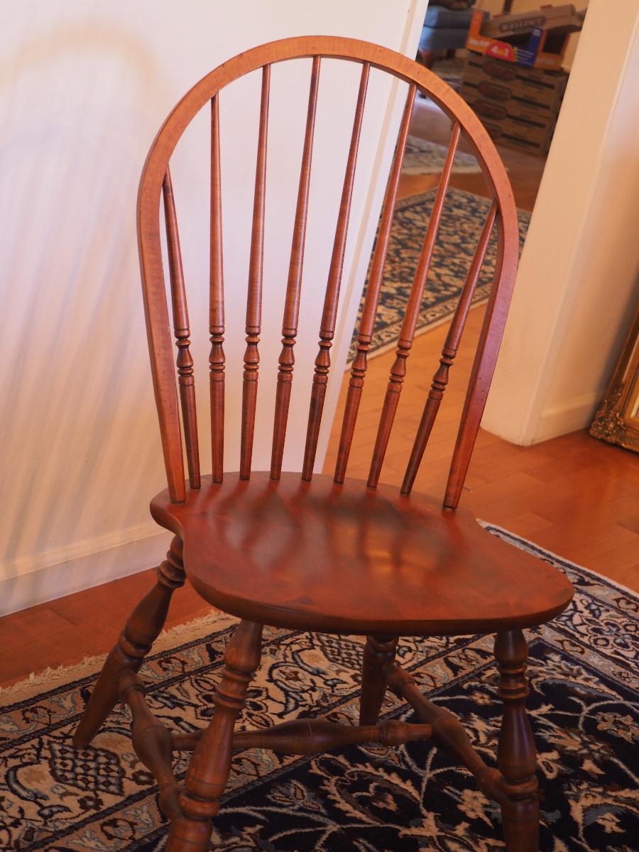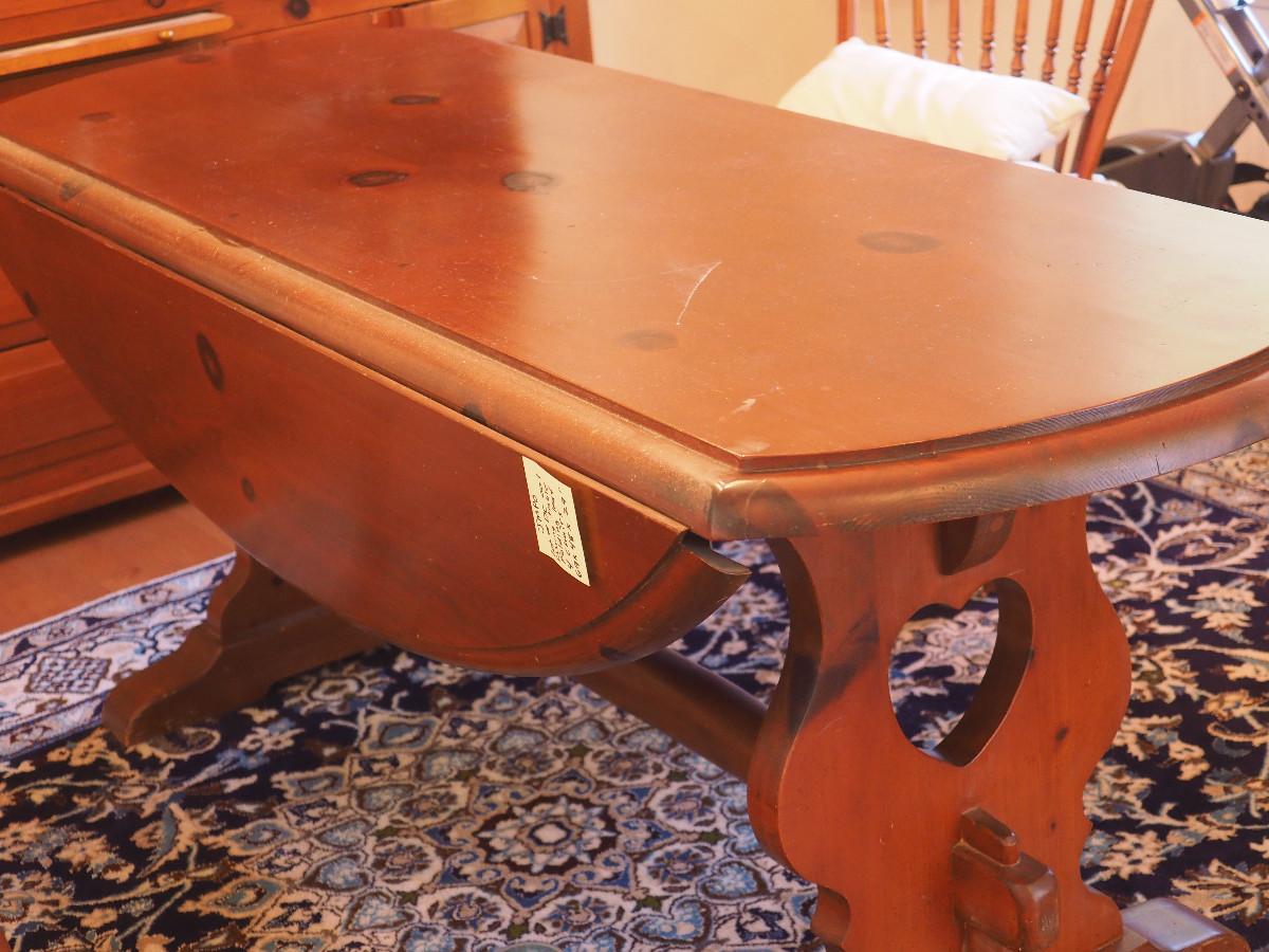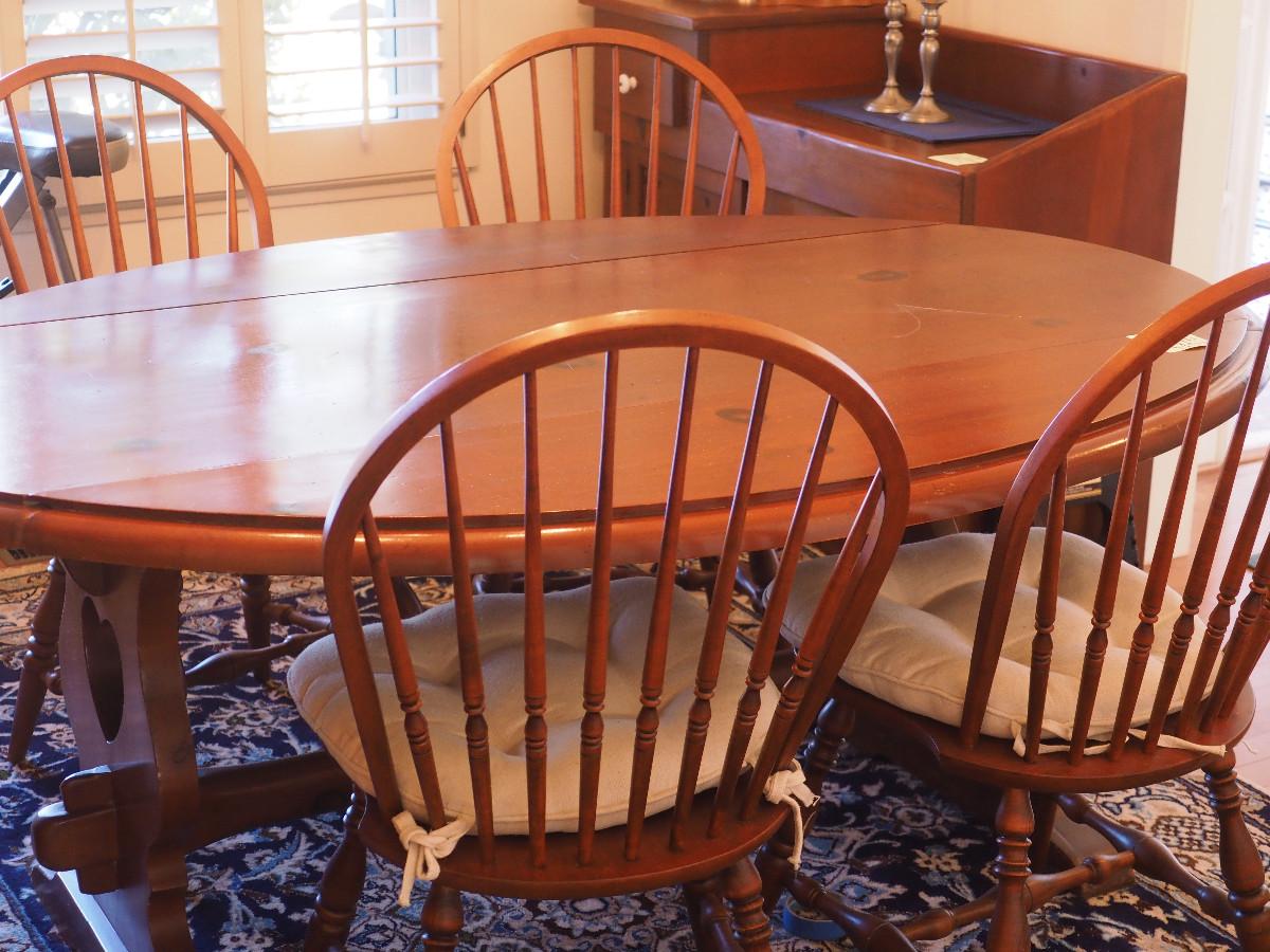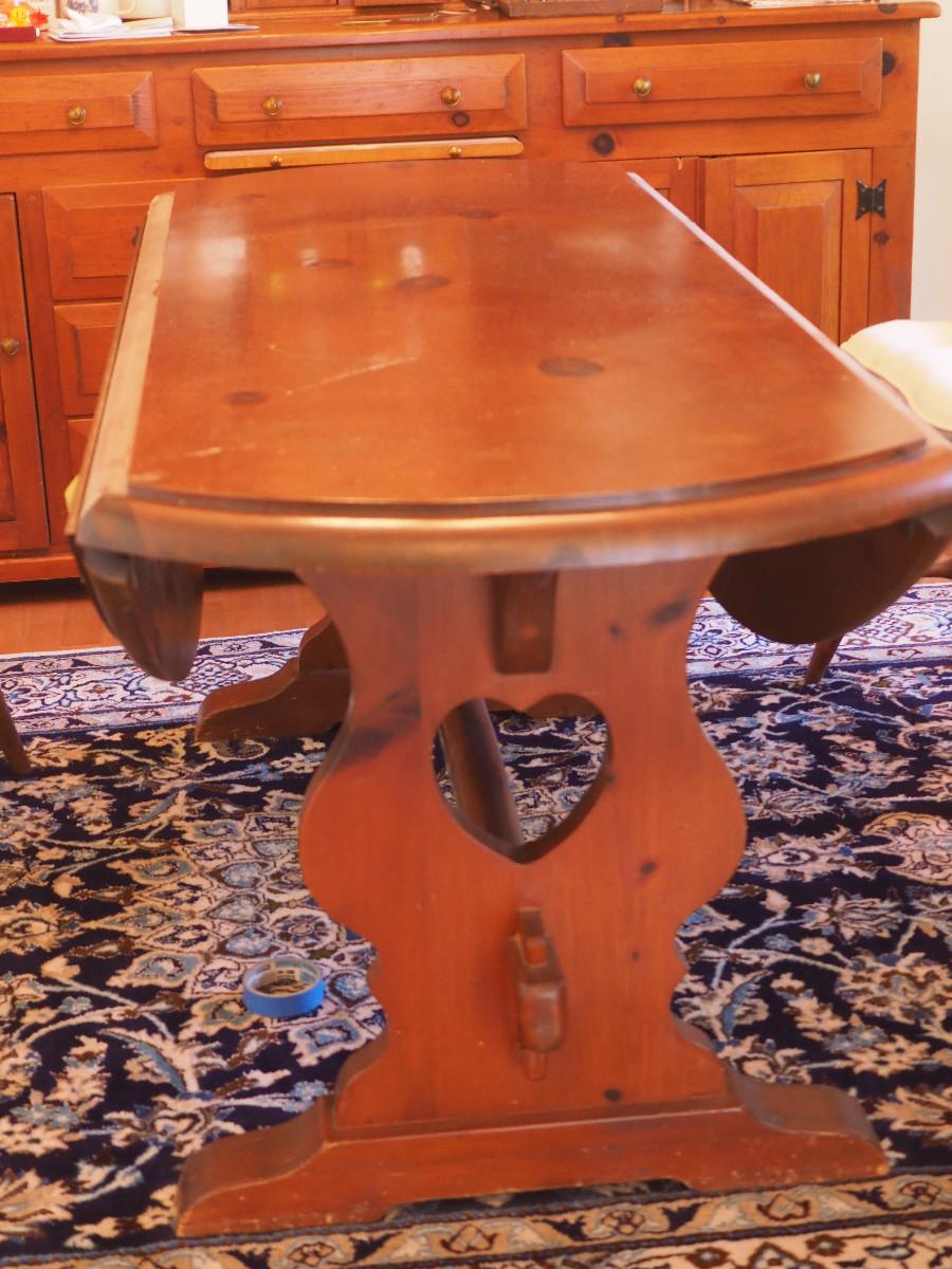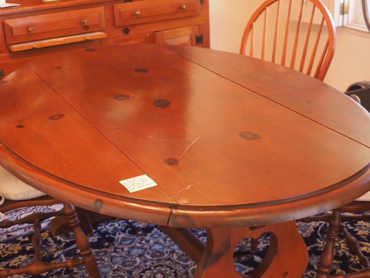 Lot 001 Character wood Drop Leaf table with 4 vintage wooden spoke back chairs. Oval table 48X 29 when extended that folds down to 27 " wide. You can put it up against a wall when not in use, or keep the sturdy leaves up. This vintage table has natural knots in the wood, and some scratches to the finish. Very sturdy. chairs and table. Matching pieces available, in other lots.