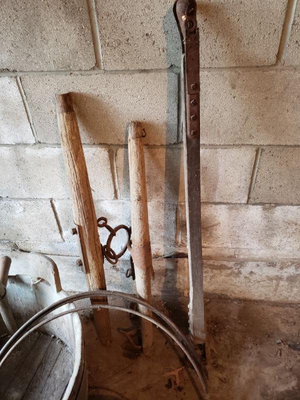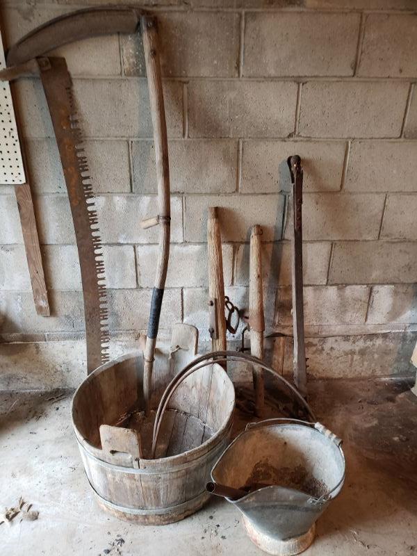 Assorted Barn Items Lot. Yokes, two handed saw, hay sickle, coal bucket. Lot #0010