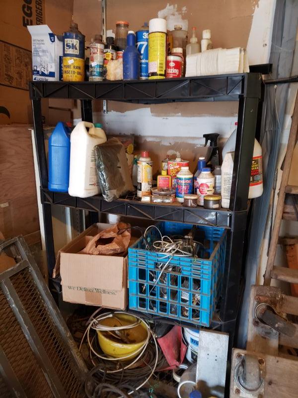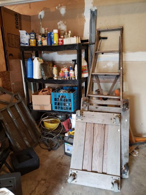Assorted Garage Items Lot #4. Solvents, dollies, ladder & wires. Lot #0018