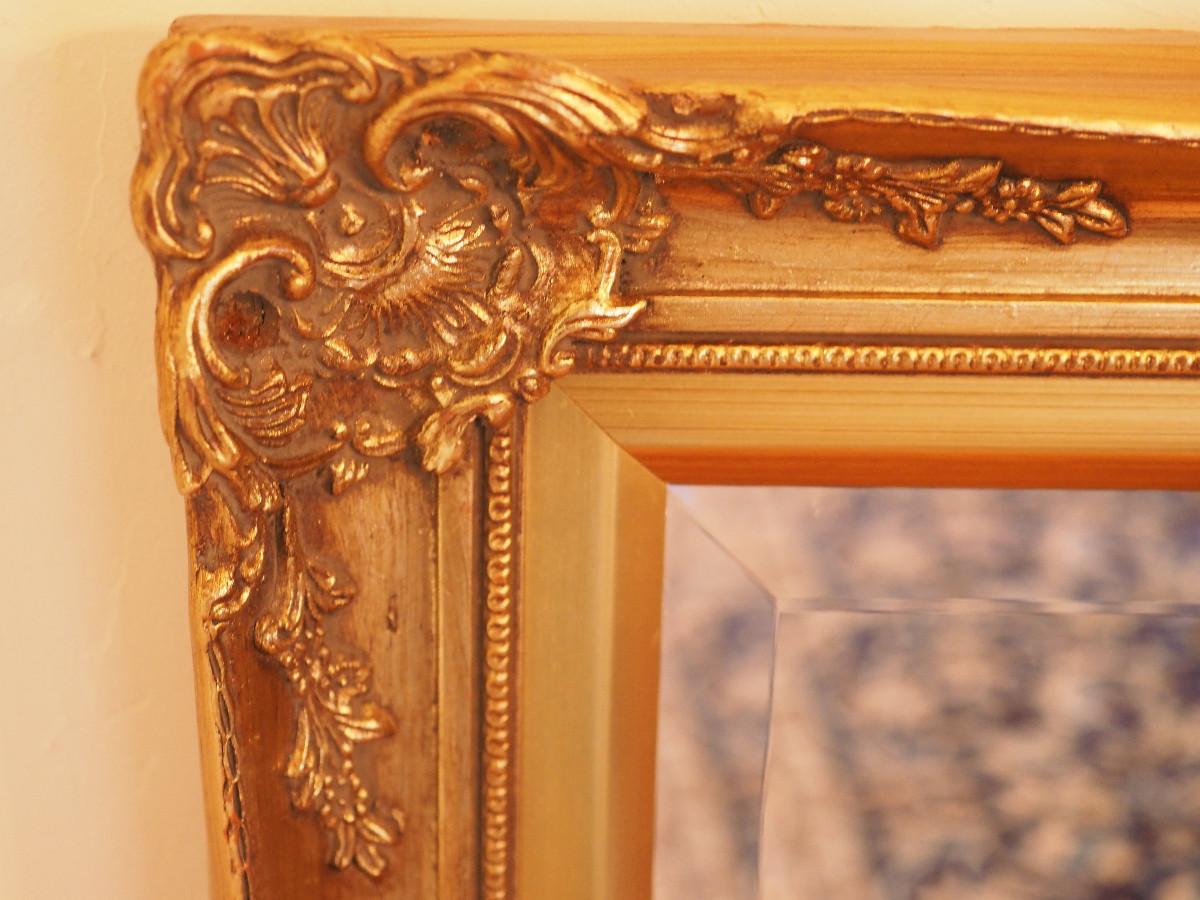 Beautiful mirror with 2 hanging directions, ornate 2" wood gold color frame. Original Price marked $200, made in Taiwan.