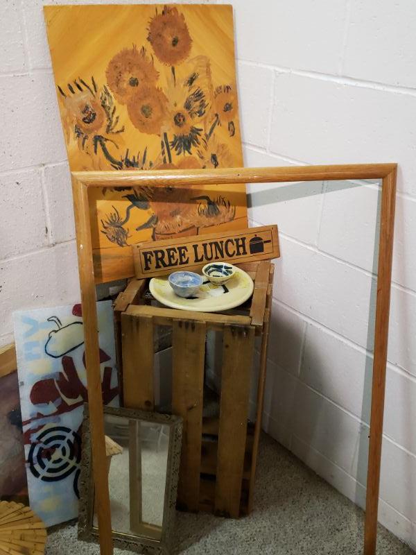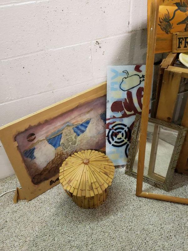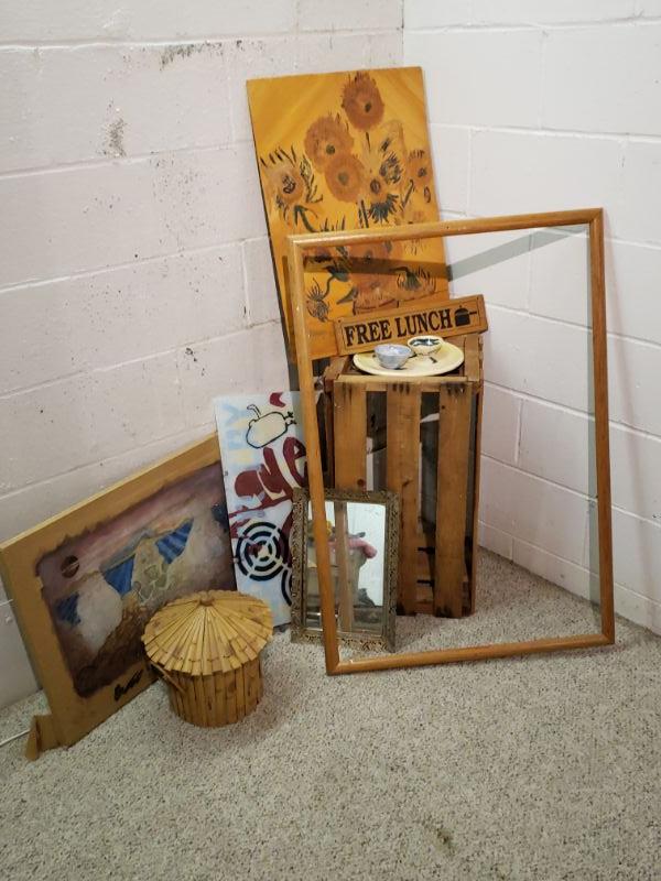 Assorted Decorative Lot #0025. Crate, mirror, wall art, frames, ice bucket.