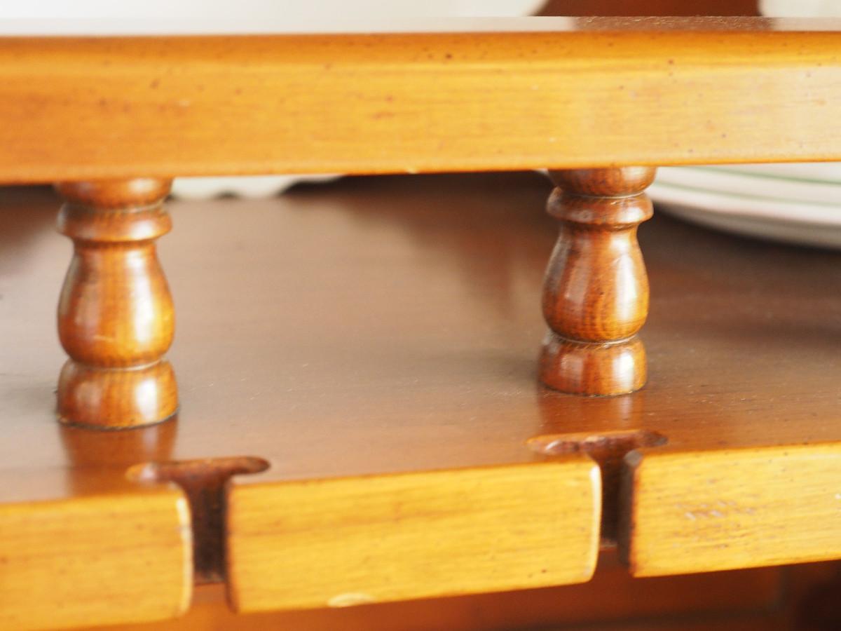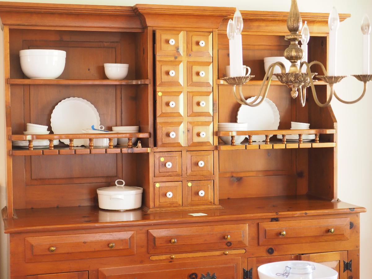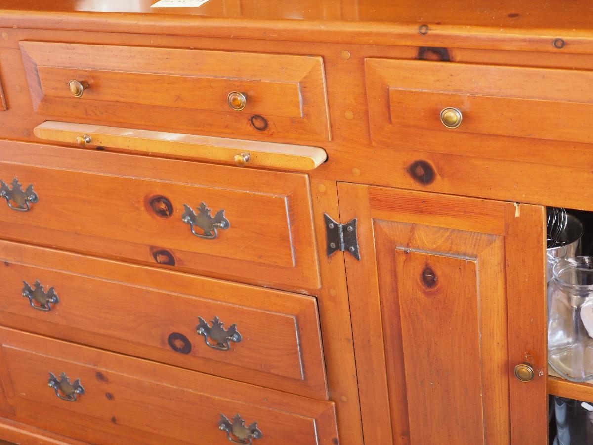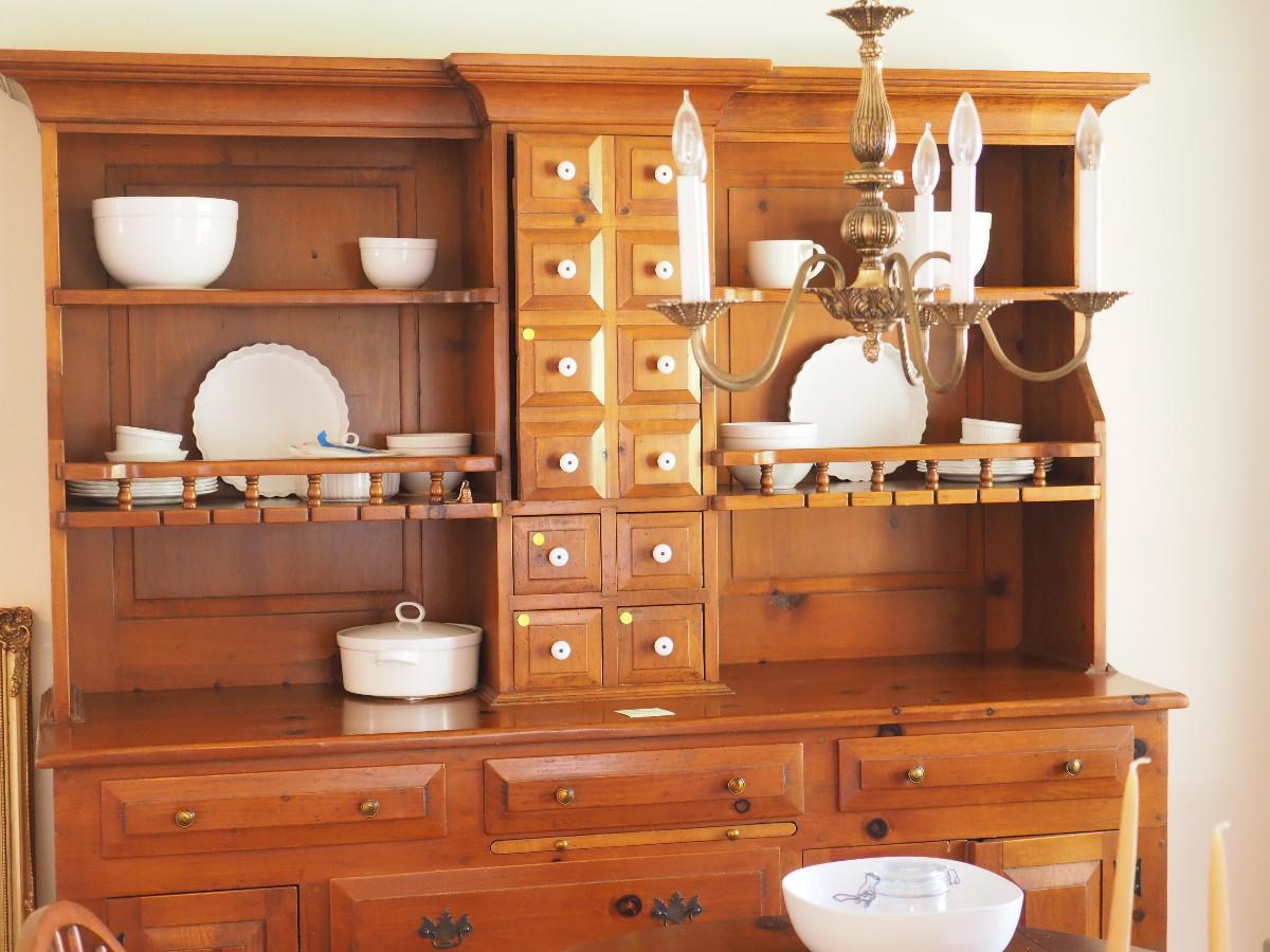 Lot 003 1970s Large Character wood gran, Country Hutch. 74" X 24" X 78" this grand piece looks like you can take the top section off for transport. It has a pull out cutting board, mini spice drawers and a faux mini drawer cabinet. Contents not included. No delivery.
