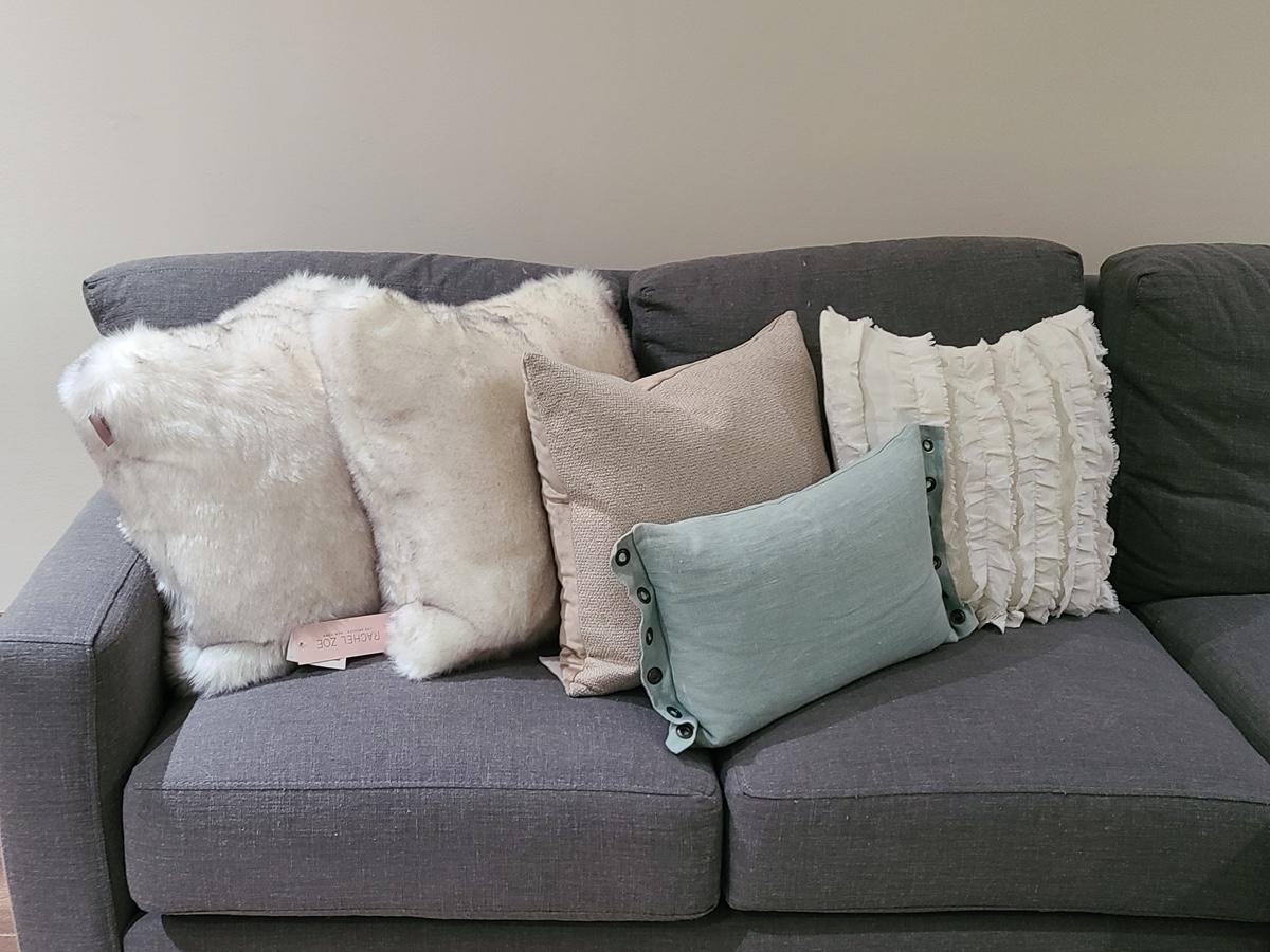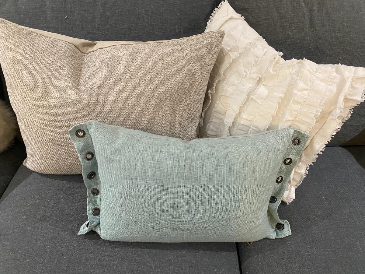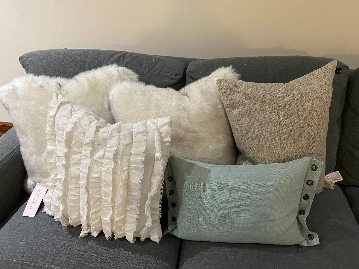 Neutral colored designer throw pillows. Some new with tags. Please see all pictures as they are the best representation of the items in the lot, the condition of the lot, and will show measurements if taken. If purchasing furniture you must be able to move yourself with your own help, and truck.