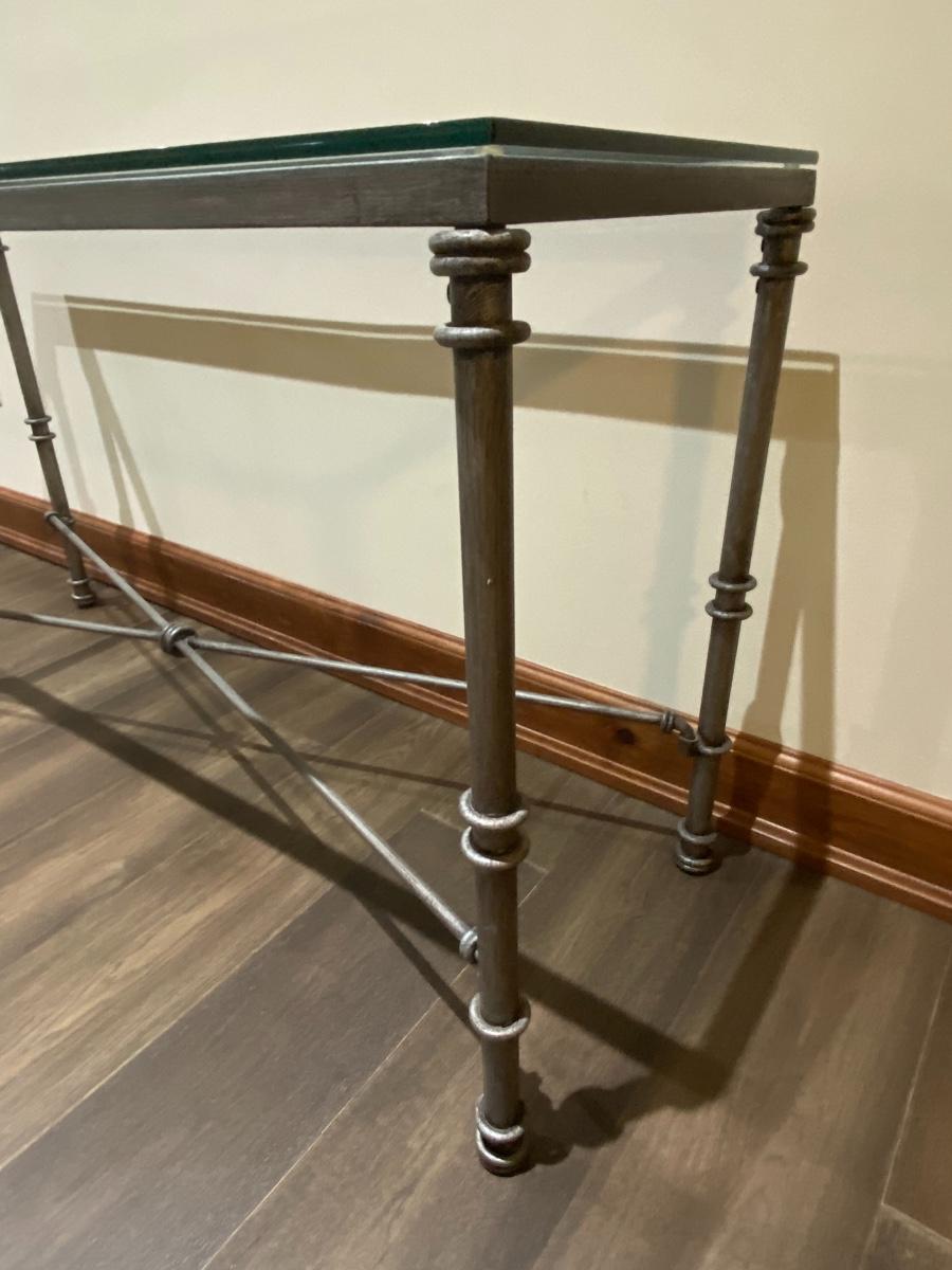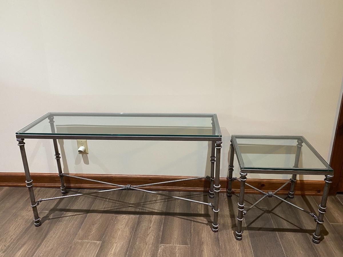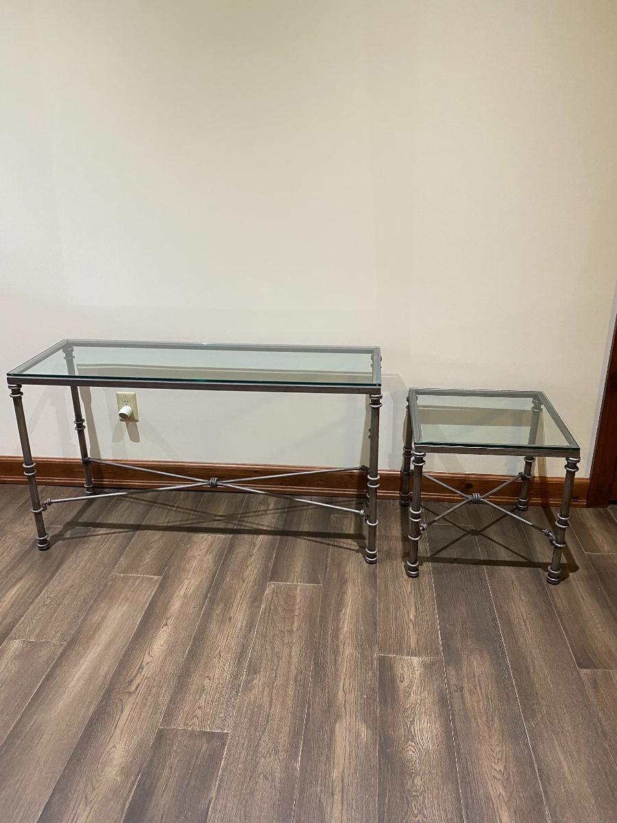 Pair of glass top tables with heavy metal frame. Console table: H28”x L 50”. End table: H21”x L20”. Please see all pictures as they are the best representation of the items in the lot, the condition of the lot, and will show measurements if taken. If purchasing furniture you must be able to move yourself with your own help, and truck.
