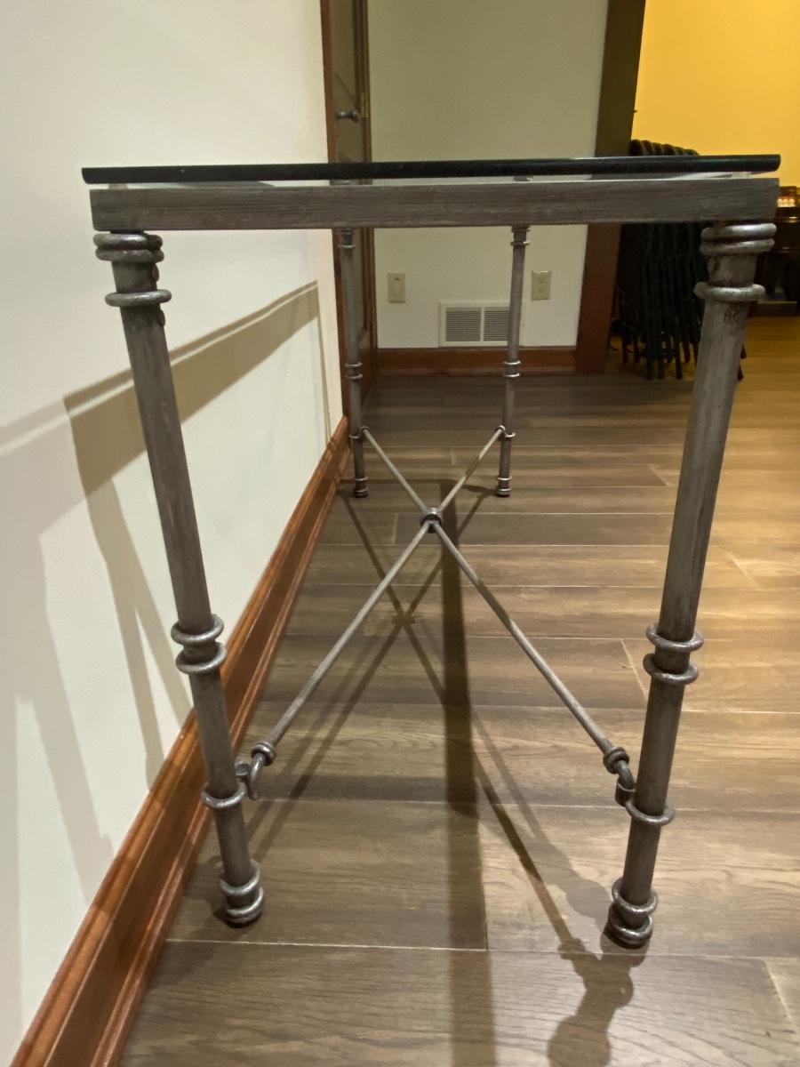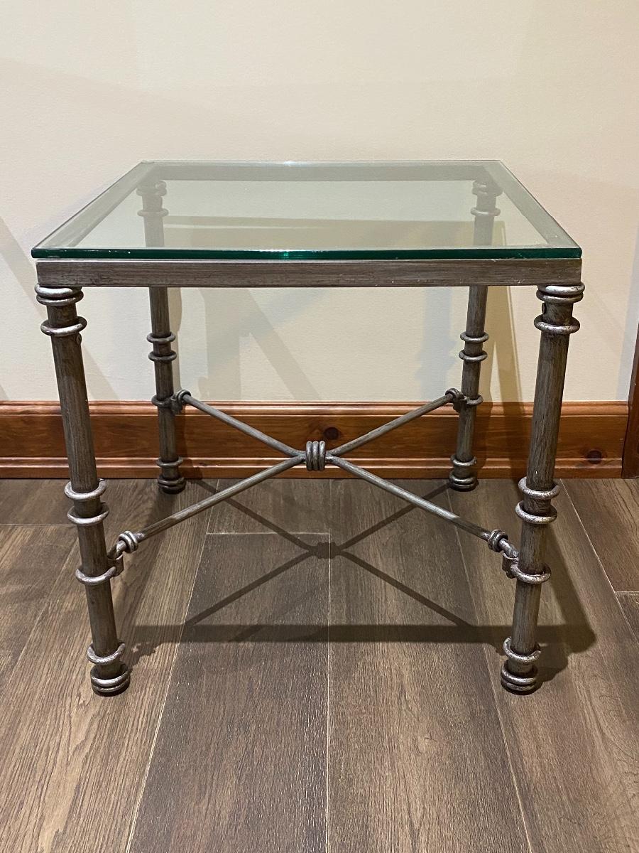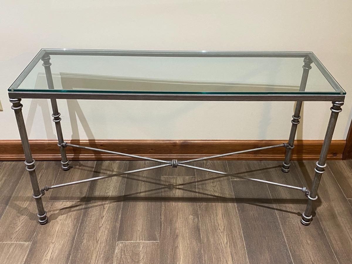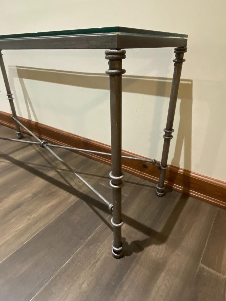Pair of glass top tables with heavy metal frame. Console table: H28”x L 50”. End table: H21”x L20”. Please see all pictures as they are the best representation of the items in the lot, the condition of the lot, and will show measurements if taken. If purchasing furniture you must be able to move yourself with your own help, and truck.